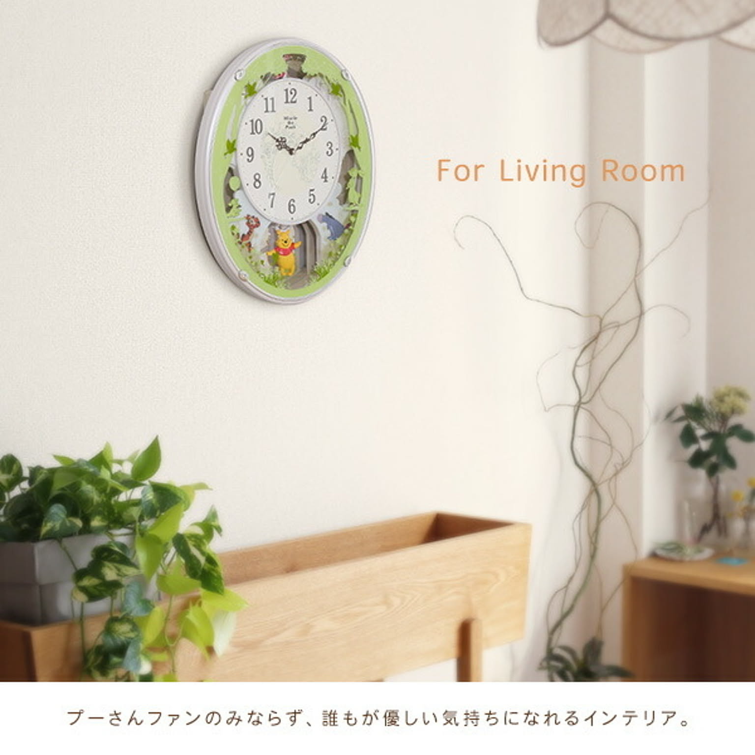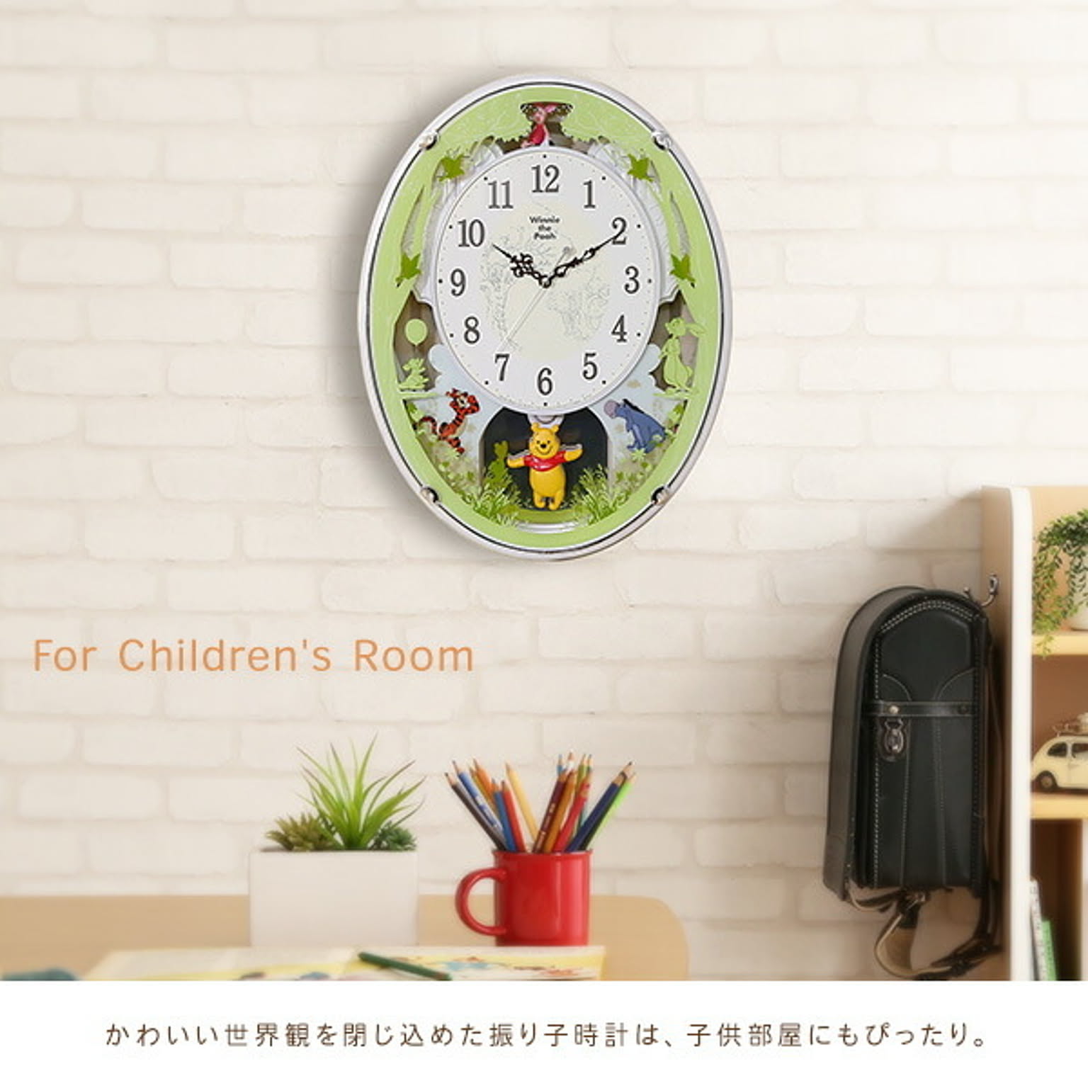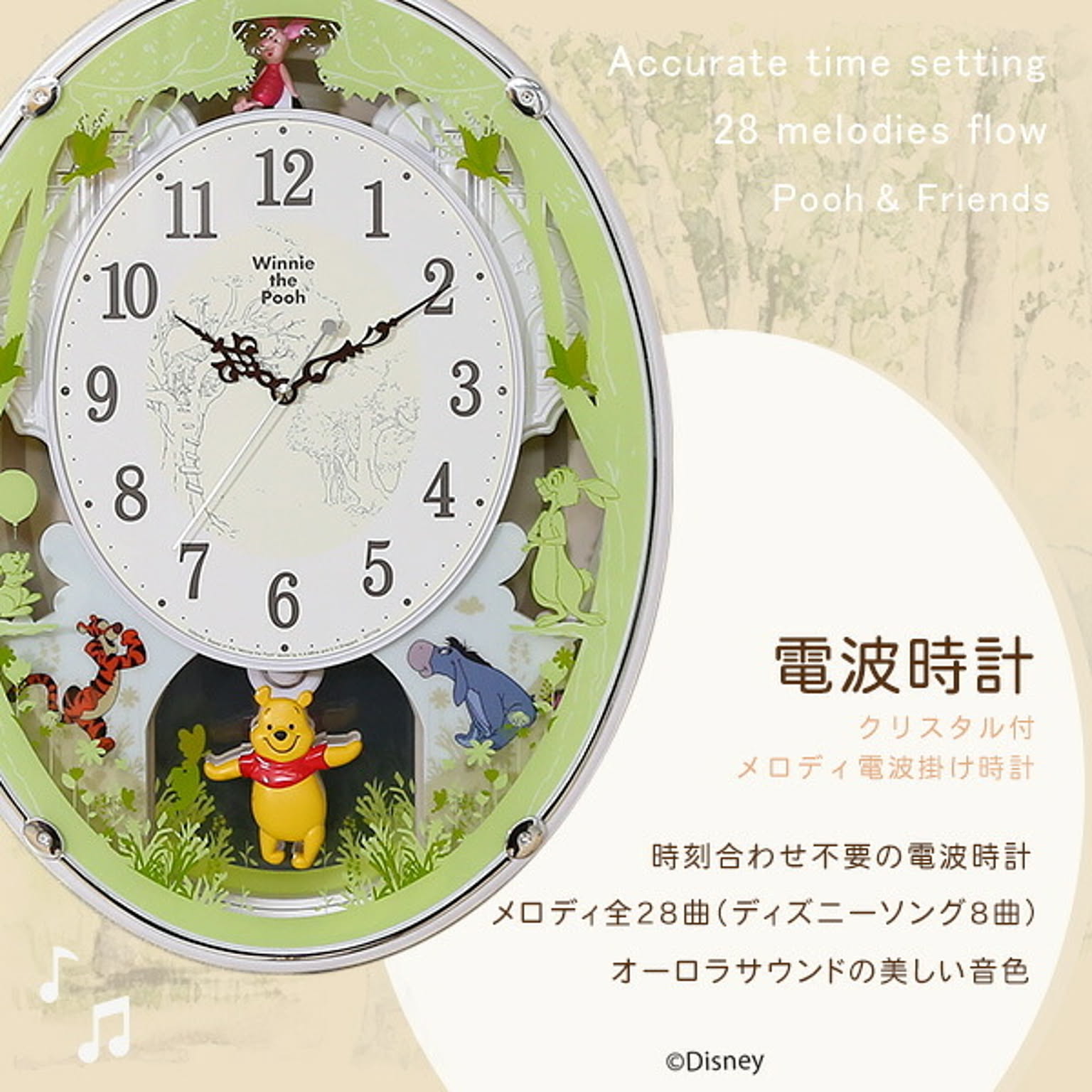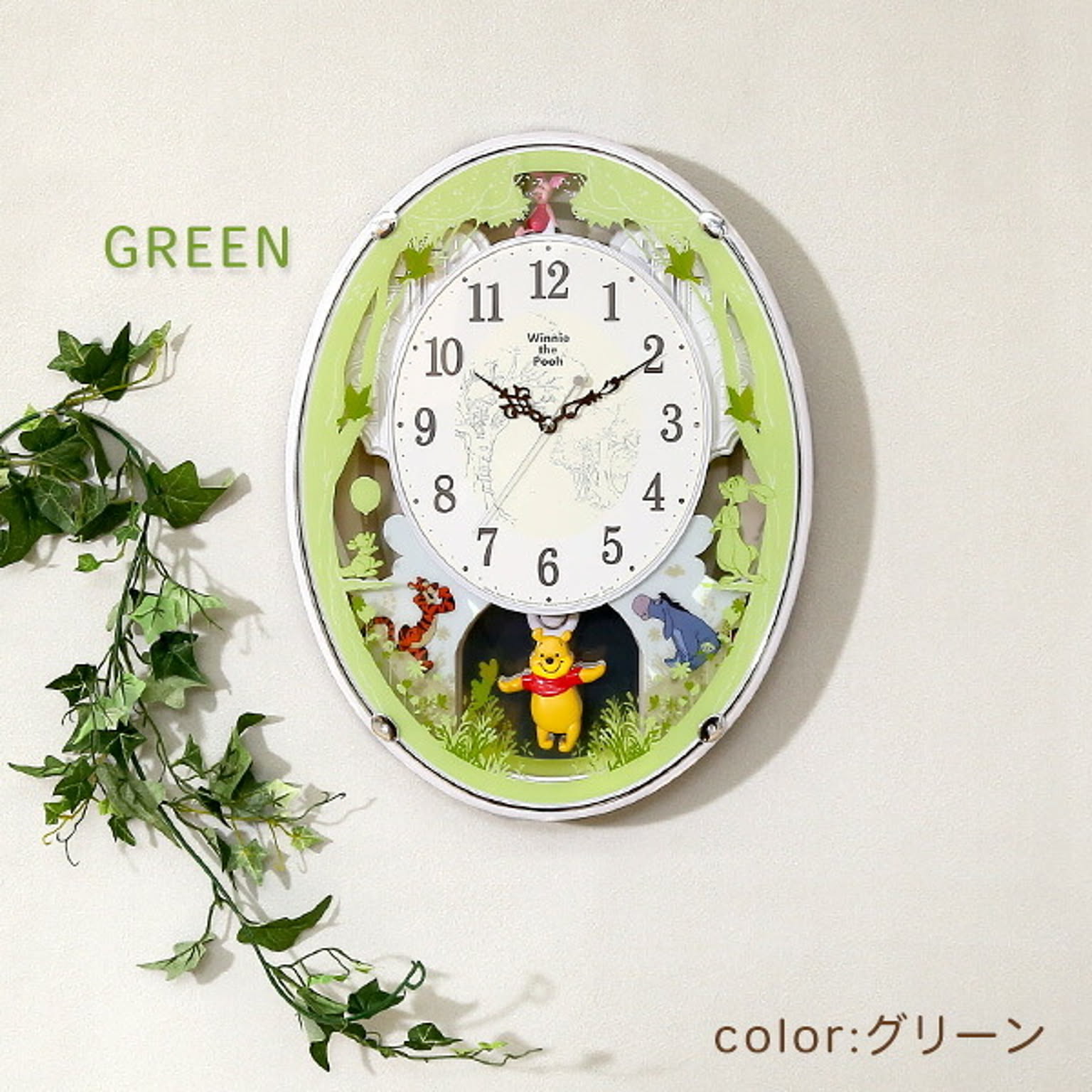 時計 からくり かわいい プーさん ディズニー 電波時計 キッズ 子供 壁掛け 振り子 ミュージック 音楽 曲 リビング 家族 ホワイト グリーン プレゼント 贈り物 ギフト