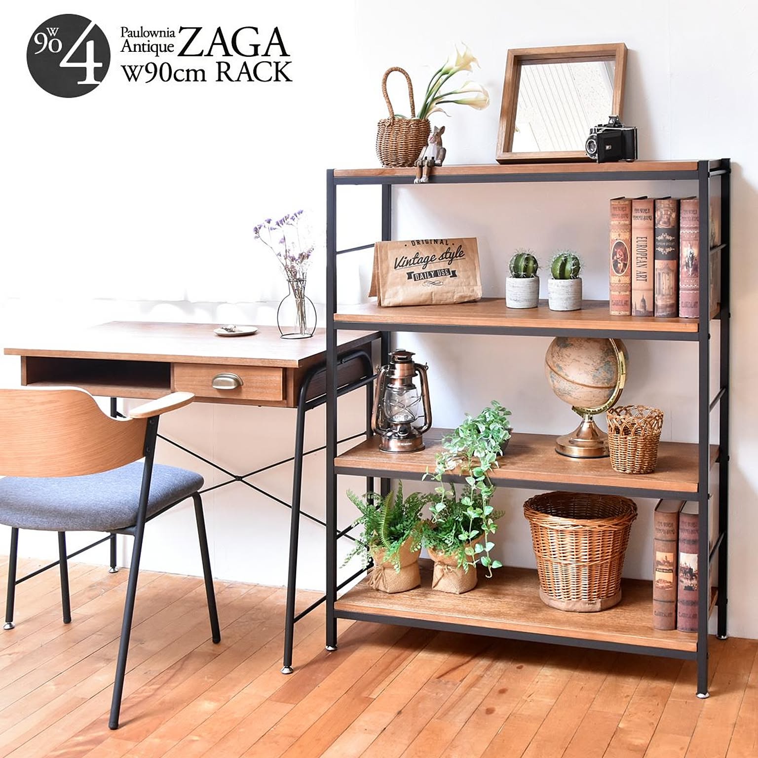 ZAGA 4段パイプラック 幅90 ZR-900-4 ラック ヴィンテージ ナチュラル 角型 スチール クール オープンラック 本棚