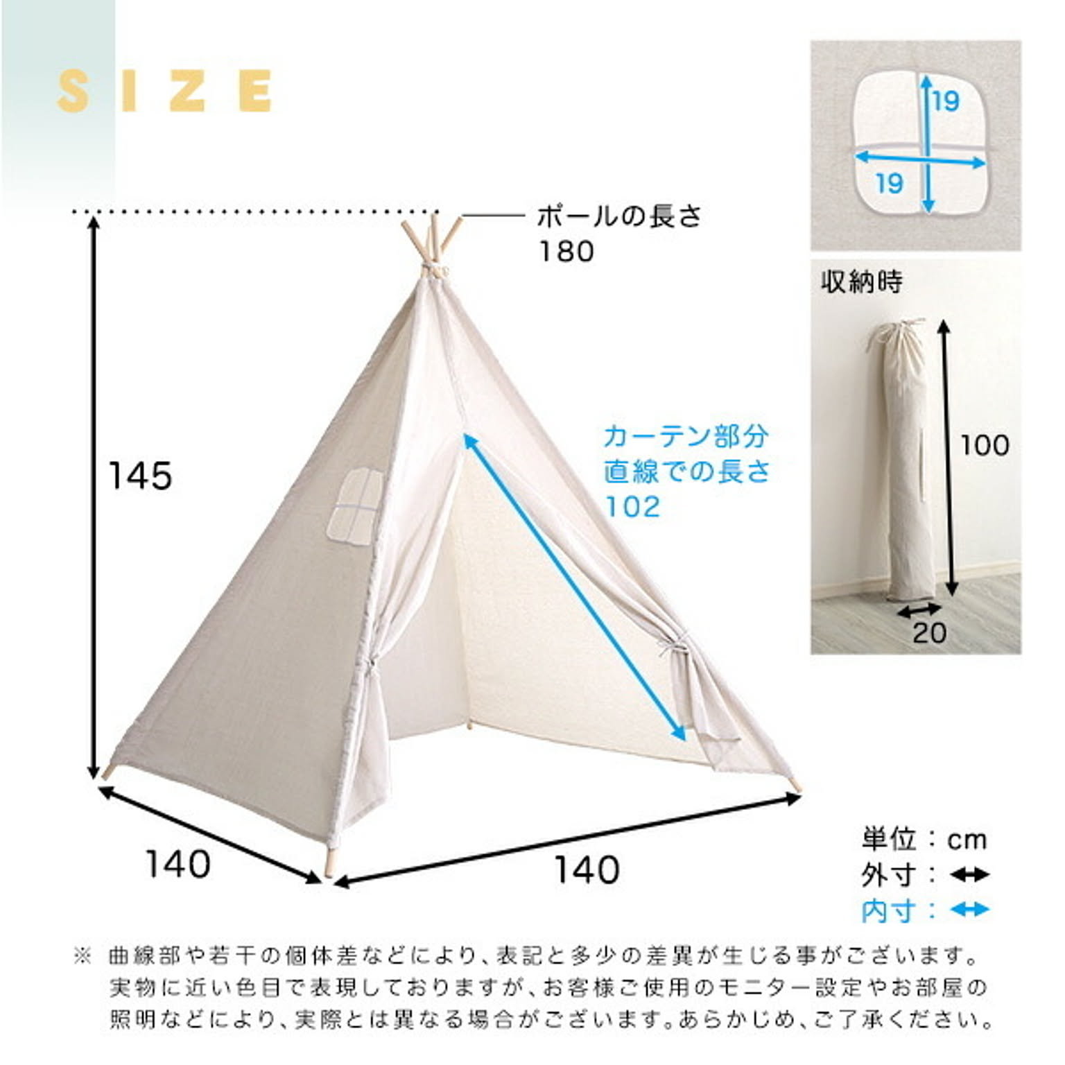 キッズテント 無地タイプ【FUU-ふう-】おしゃれ 女の子 ティピー 子供 遊具 おもちゃ ままごと 部屋 プレイハウス シンプル 室内テント 屋内テント 韓国 男の子 子ども 室内 屋内