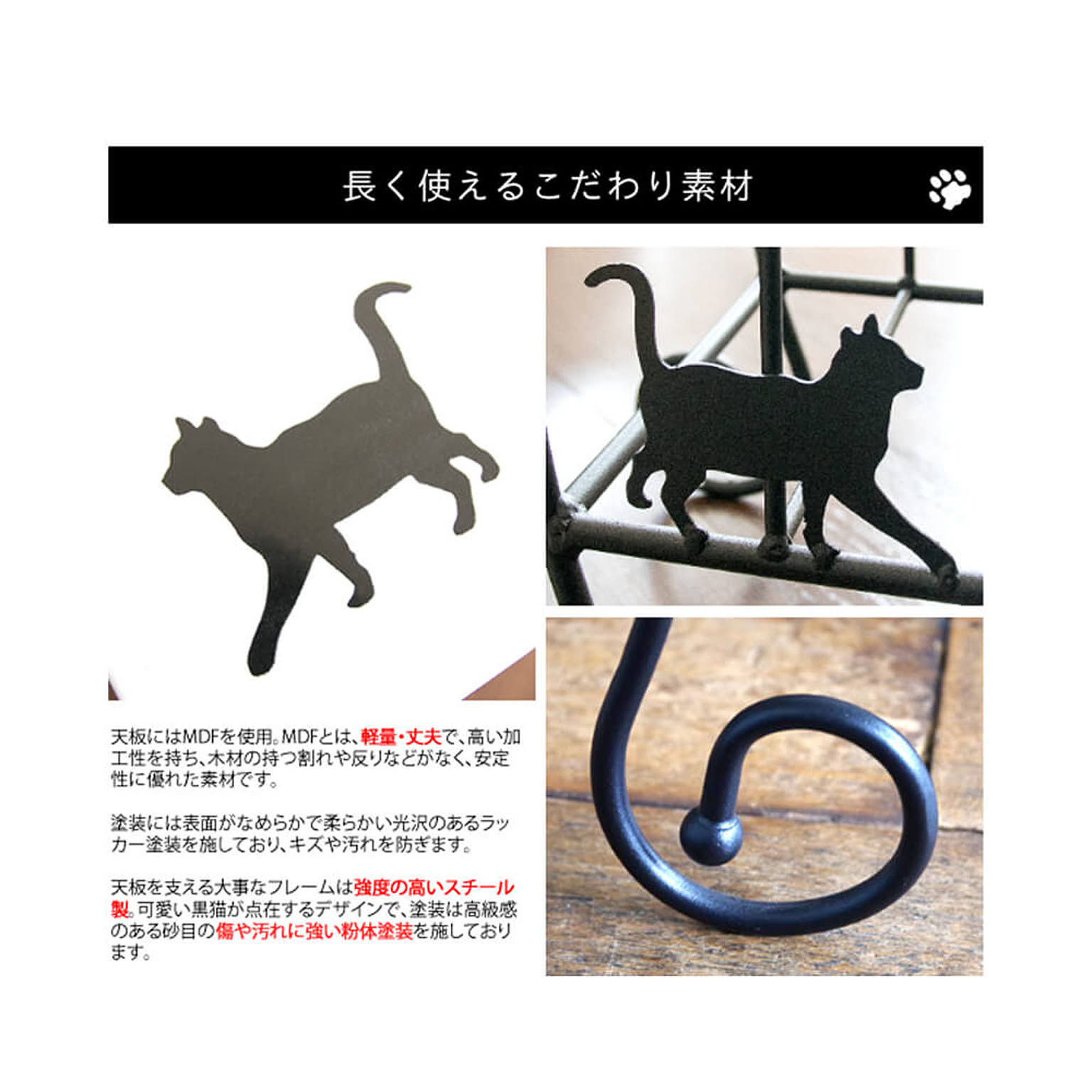 曲線の美しい黒いロートアイアンの上を、気まぐれに歩いたり座ったりしている猫のシルエットが可愛い、黒猫シリーズChatnoir(シャノワール) のサイドテーブル。