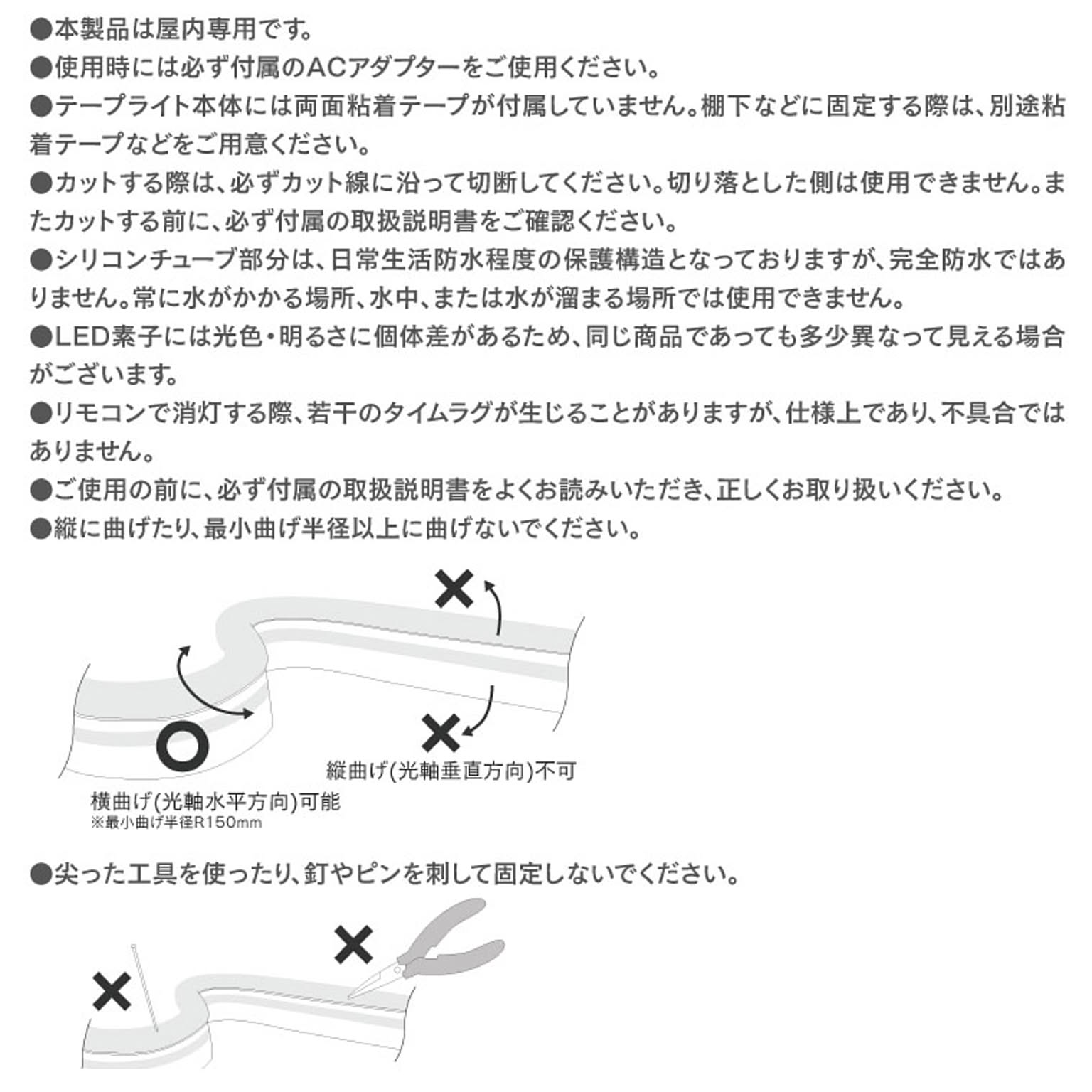 | 使用上の注意2 | ●こちらの製品はアプリや音声では操作できません。付属の専用リモコンで操作をおこなってください。 ●電圧変動によりチラつくことがありますが故障ではありません。 ●LED素子には光色、明るさにバラつきがあるため、同じ商品であっても色や明るさが異なる場合があります。 ●テープライト本体には両面粘着テープが付属していません。棚下などに固定する際は、別途粘着テープなどをご用意ください。 ●シリコンチューブ部分は、日常生活防水程度の保護構造となっておりますが、完全防水ではありません。水中での使用や大量の水がかかる環境では使用しないでください。 その他取扱説明書をよくお読みの上ご使用ください。 |