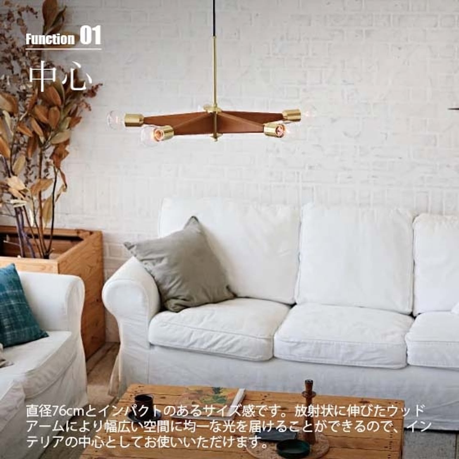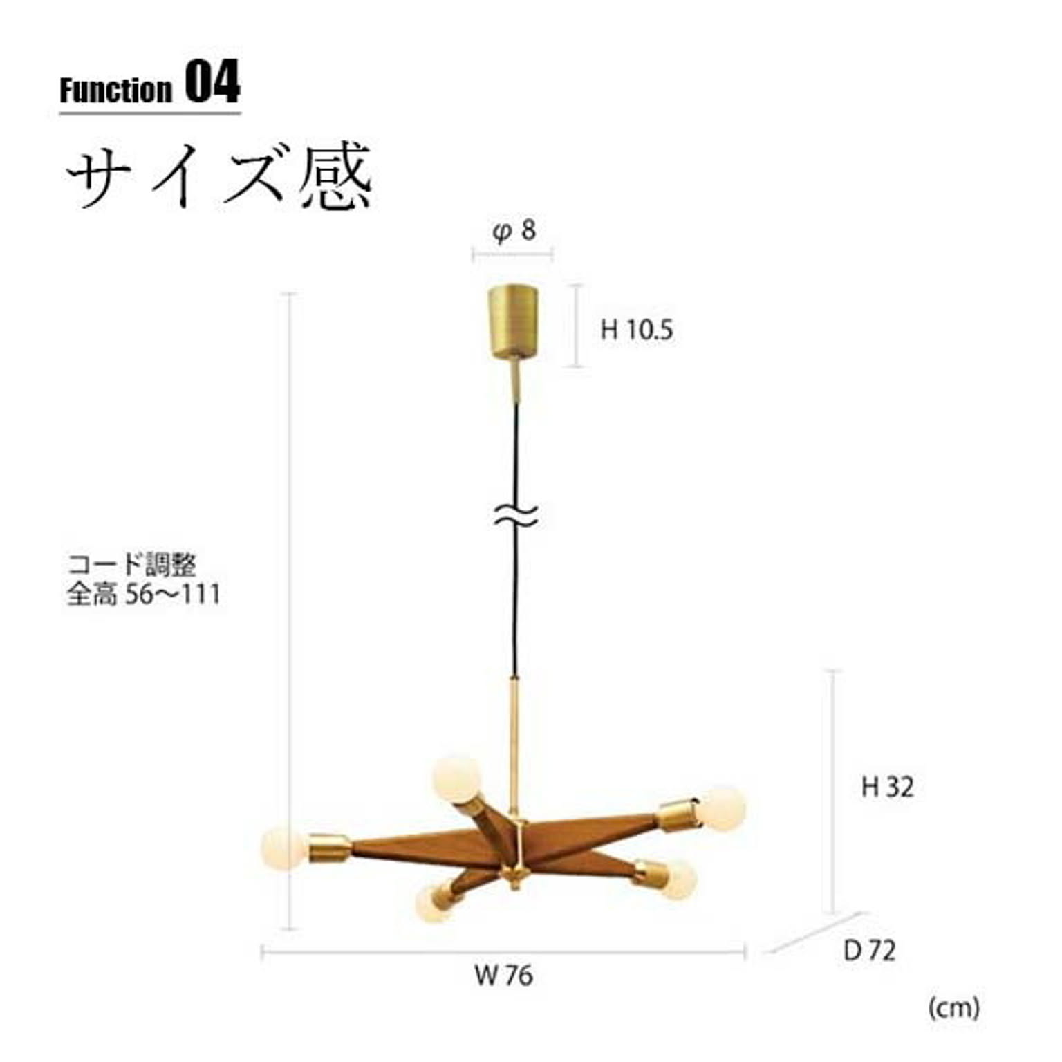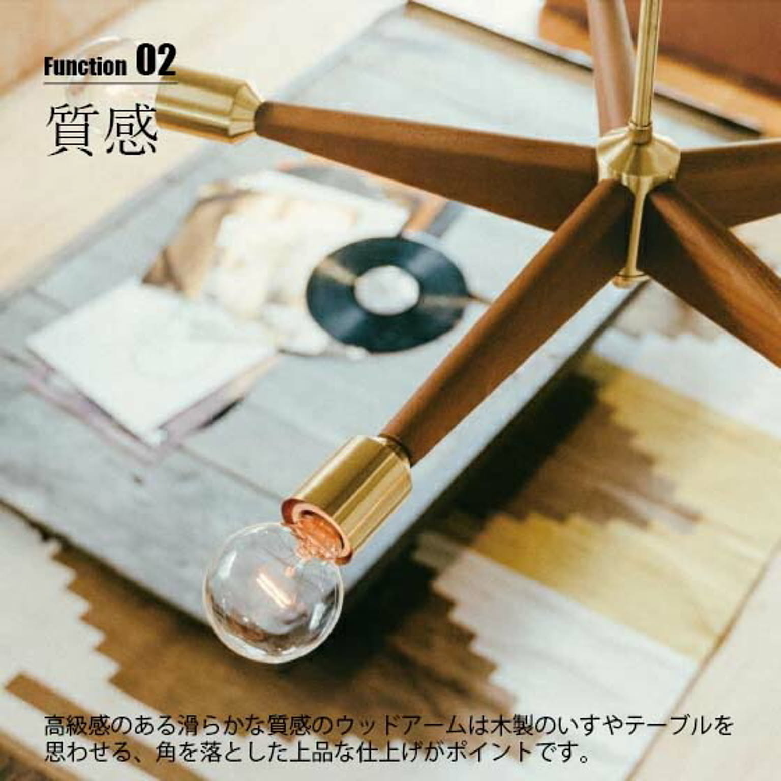 放射状に伸びたなめらかな質感のウッドアームに上品なヘアラインゴールドをあしらい、リビングインテリアの中心として存在感がありながらも落ち着いた空間を演出できるペンダントライトです。直径76cmとインパクトのあるサイズ感です。放射状に伸びたウッドアームにより幅広い空間に均一な光を届けることができるので、インテリアの中心としてお使いいただけます。高級感のある滑らかな質感のウッドアームは木製のいすやテーブルを思わせる、角を落とした上品な仕上げがポイントです。ソケットや本体中心部分に採用したヘアラインゴールドのパーツが明るくアンティークな雰囲気をプラスします。長さの調節が出来、余ったコードはシーリングカップの中にスッキリと収納できます。ご用意した電球はクリアタイプとホワイトタイプの2種類。取り付ける電球によっても雰囲気が変わります。定番のミッドセンチュリーに合わせたり、アンティークなコーディネイトにしたり、人とは違ったスタイリングでお気に入りの空間を彩ります。ナチュラルなエッセンスで海外のオシャレスポットのような憧れのインテリアに。