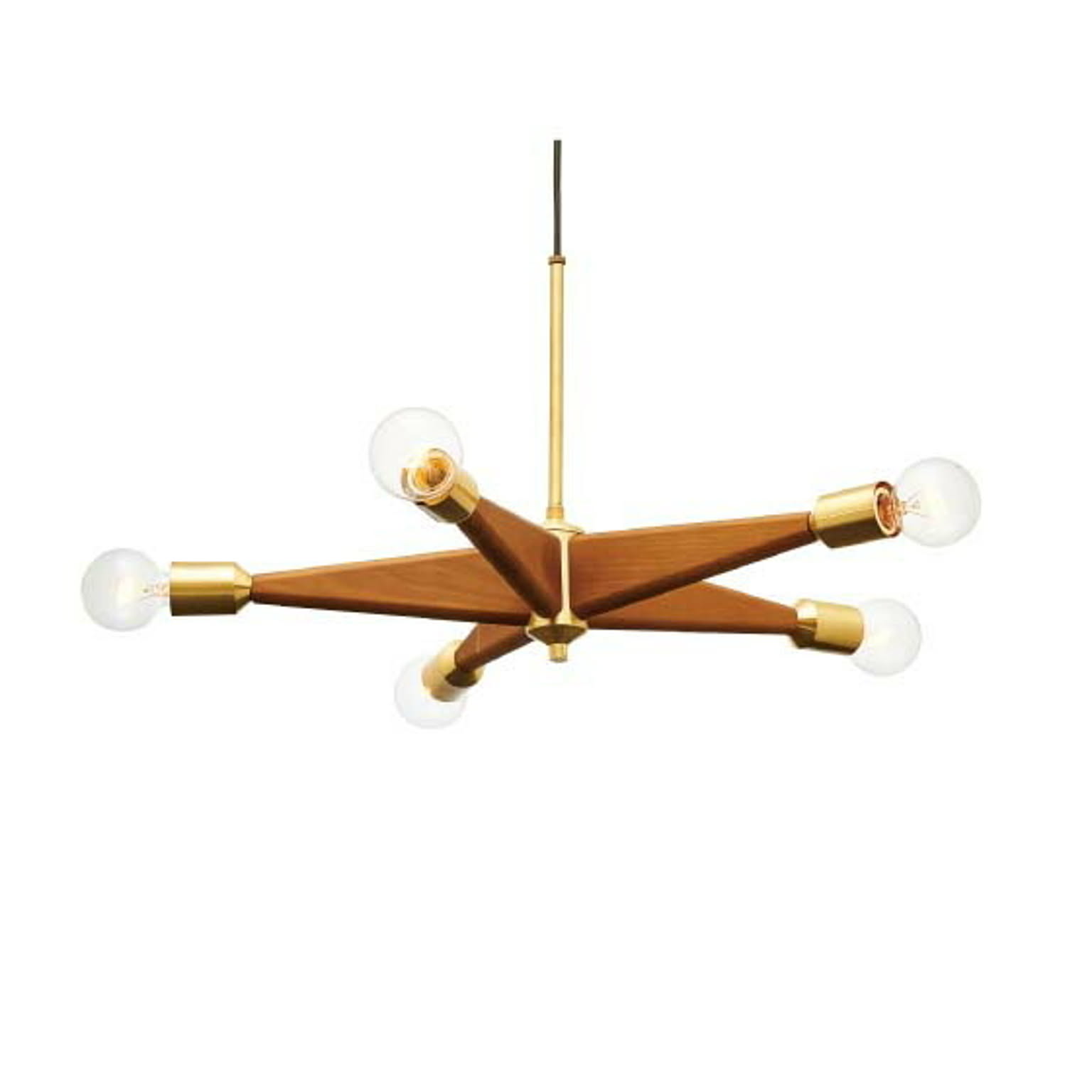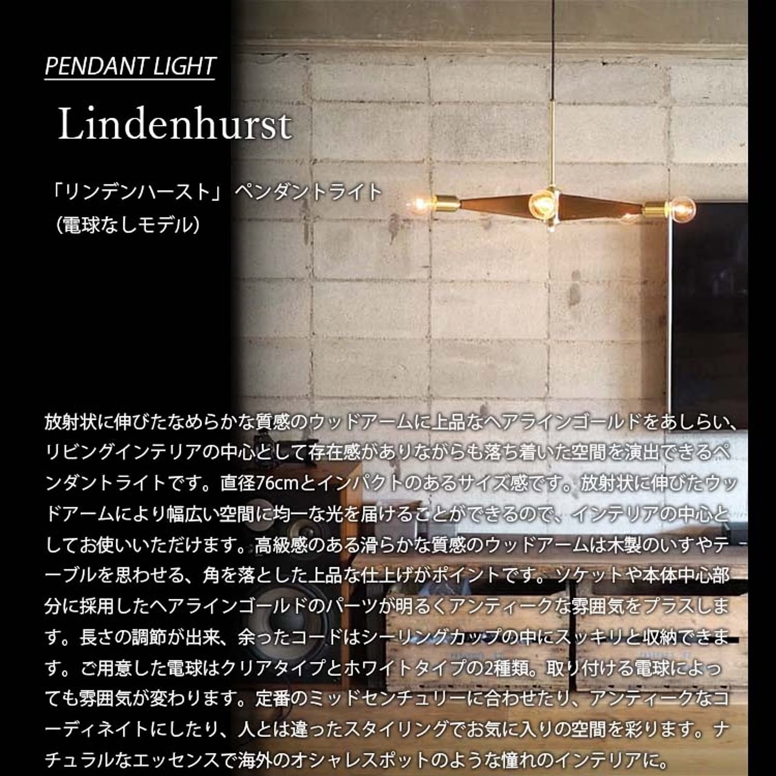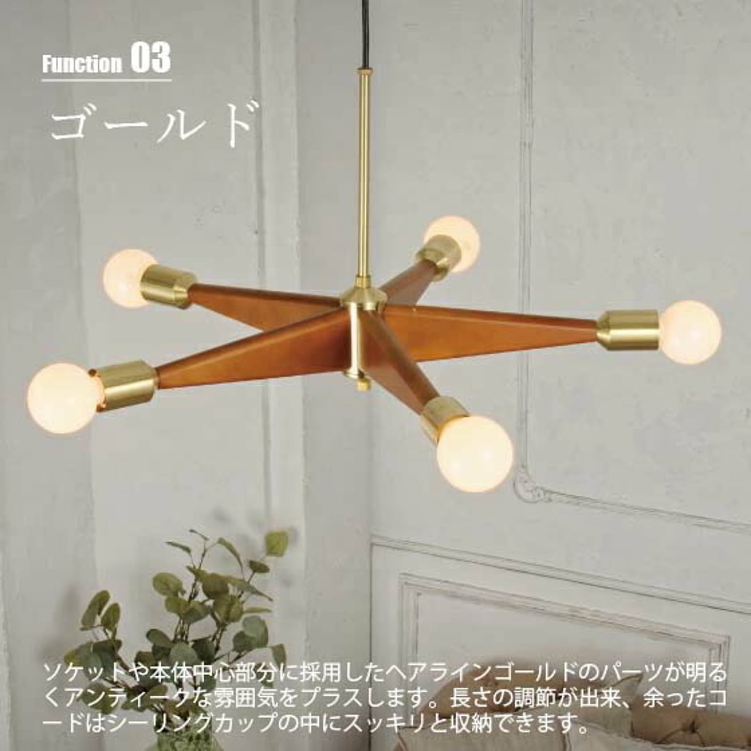 放射状に伸びたなめらかな質感のウッドアームに上品なヘアラインゴールドをあしらい、リビングインテリアの中心として存在感がありながらも落ち着いた空間を演出できるペンダントライトです。直径76cmとインパクトのあるサイズ感です。放射状に伸びたウッドアームにより幅広い空間に均一な光を届けることができるので、インテリアの中心としてお使いいただけます。高級感のある滑らかな質感のウッドアームは木製のいすやテーブルを思わせる、角を落とした上品な仕上げがポイントです。ソケットや本体中心部分に採用したヘアラインゴールドのパーツが明るくアンティークな雰囲気をプラスします。長さの調節が出来、余ったコードはシーリングカップの中にスッキリと収納できます。ご用意した電球はクリアタイプとホワイトタイプの2種類。取り付ける電球によっても雰囲気が変わります。定番のミッドセンチュリーに合わせたり、アンティークなコーディネイトにしたり、人とは違ったスタイリングでお気に入りの空間を彩ります。ナチュラルなエッセンスで海外のオシャレスポットのような憧れのインテリアに。