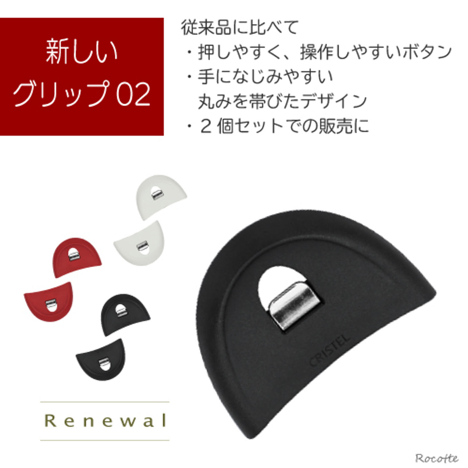 ★ワンタッチで着脱自在 クリステル製品の鍋の把手に ワンタッチで安全に着脱できる グリップがリニューアルされました。 従来のグリップ・ムティネに比べ、 持った時に手になじみやすい 全体に丸みを帯びたデザインに。 ボタンもより押しやすく、 操作しやすくなっています。 従来品同様、必要な時だけカチッと 簡単に着脱が可能です。 ●クリステル製品(鍋、フライパン)用のグリップです。