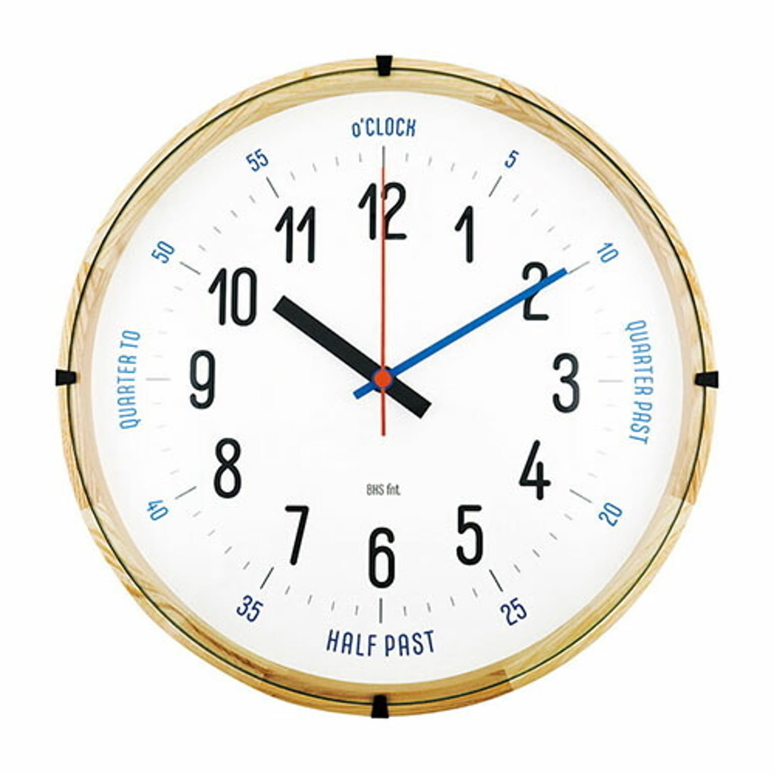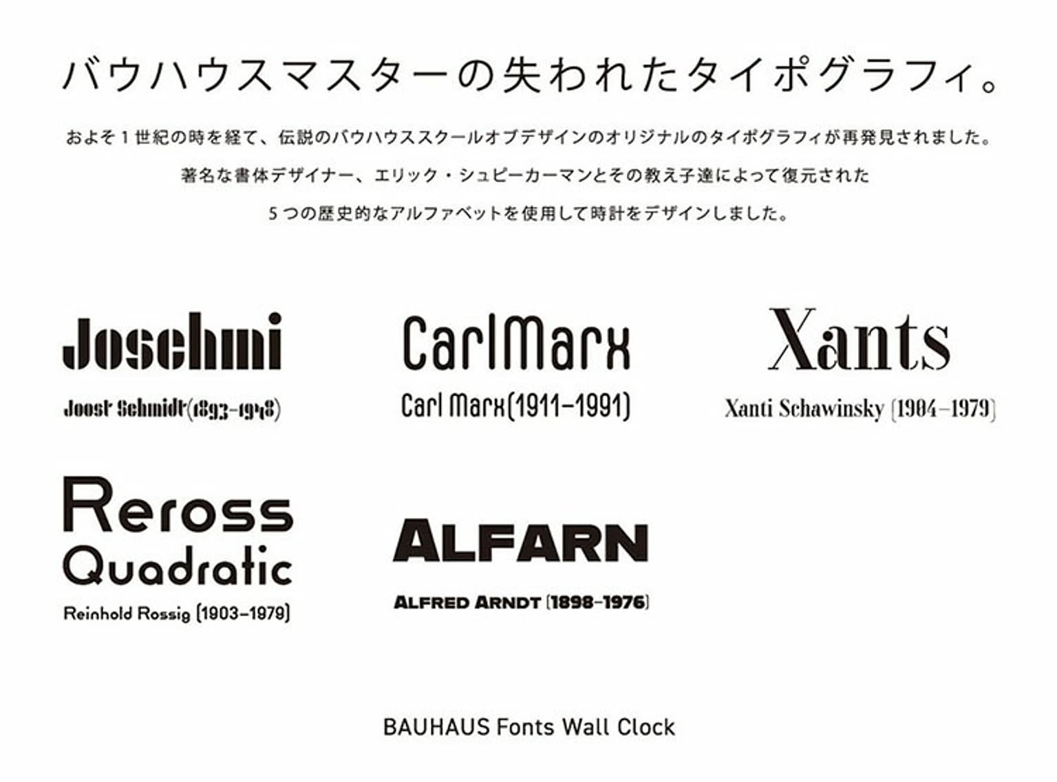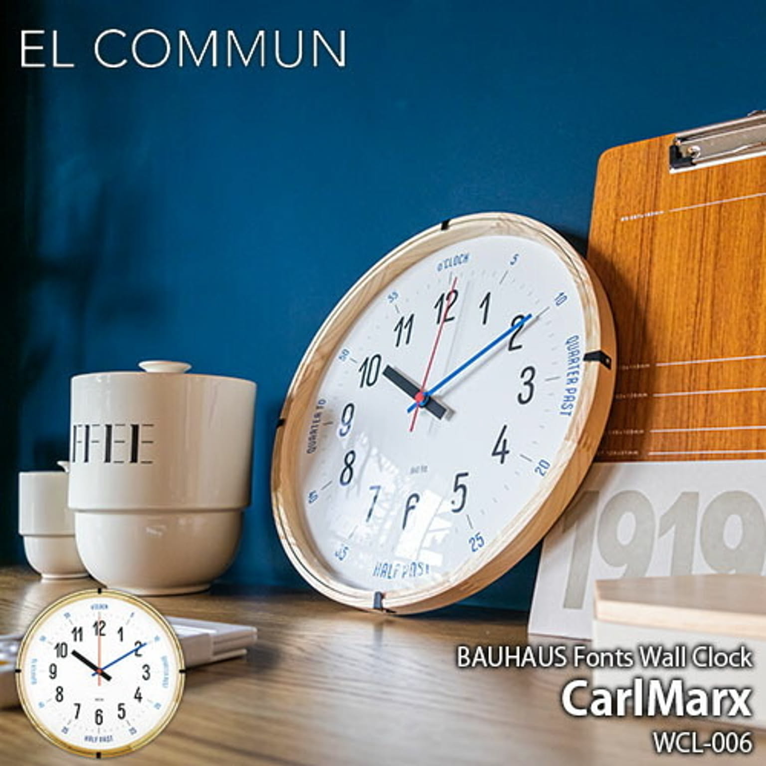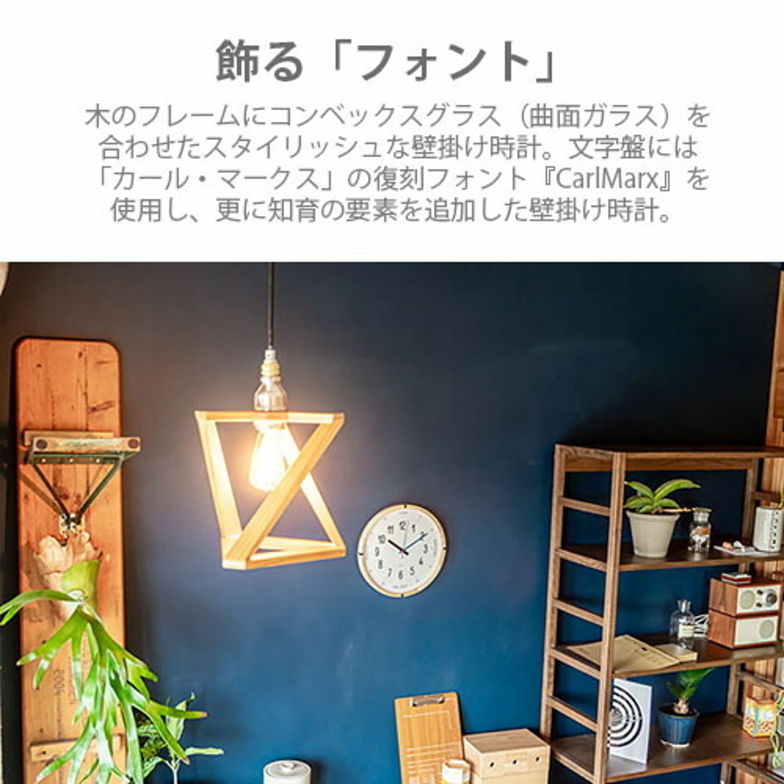 バウハウスの復刻フォントを使用した印象的な掛時計。木のフレームとコンベックスグラス(曲面ガラス)の組み合わせに知育の要素を追加した壁掛け時計です。文字盤には「カール・マルクス」の 復刻フォント『CarlMarx』を使用。"毎時" を表す 数字と針は「黒」、"分" を表す 数字と針は「青」というふうに、数字 と 針 を 色統一しているので、お子様部屋で時間を教える 知育時計としてもオススメです♪【 カール・マルクス 】装飾画家として修行した後、バウハウスに入学。ヨースト・シュミット や ヨーゼフ・アルバース、ヴァシリー・カンディンスキー、ルートウィッヒ・ミース・ファン・デル・ローエ などに学び、第二次世界大戦後のバウハウス再建運動に加わって尽力。 ■ムーブメント 日本メーカー製スイープムーブメント ■電源 単三乾電池×1(別売)