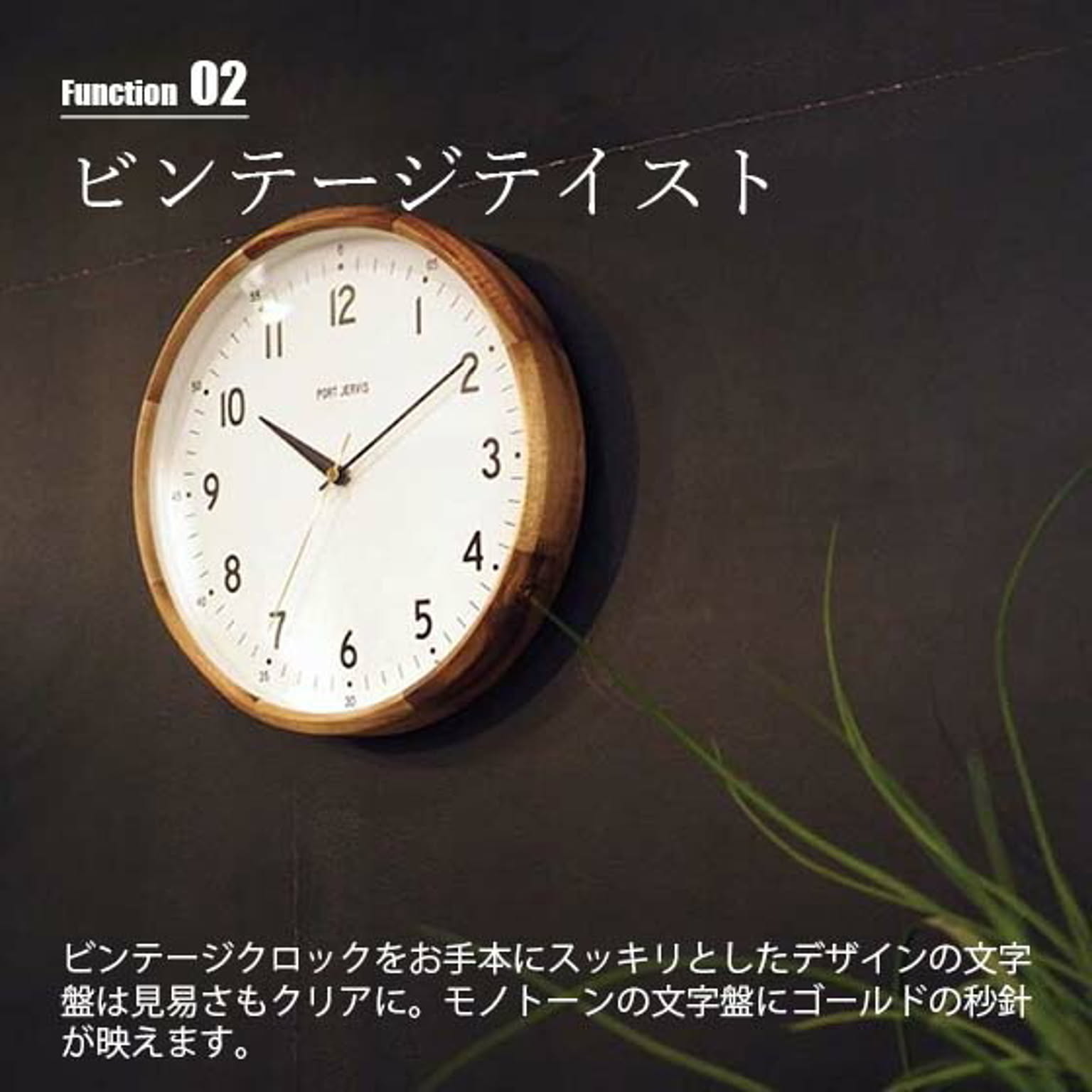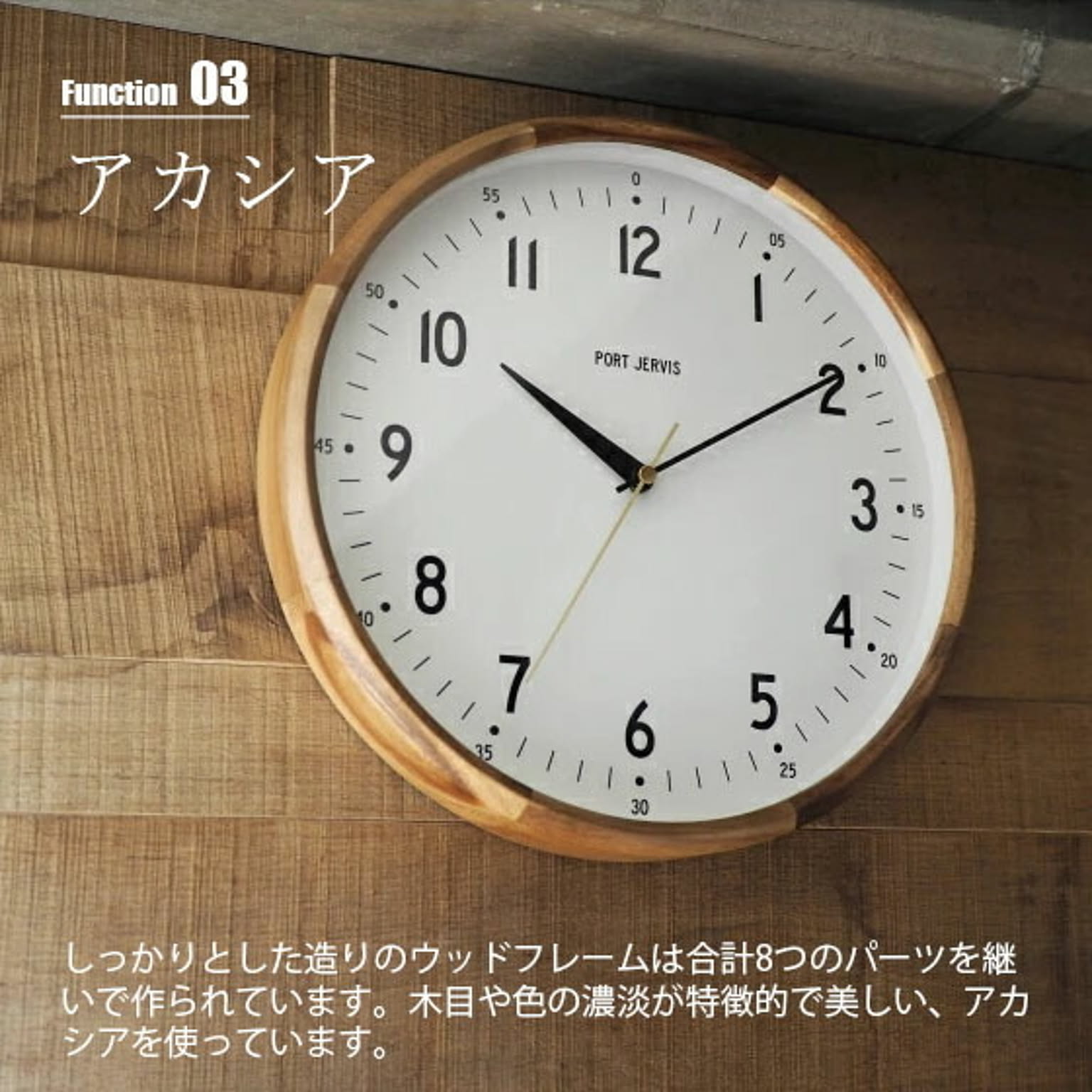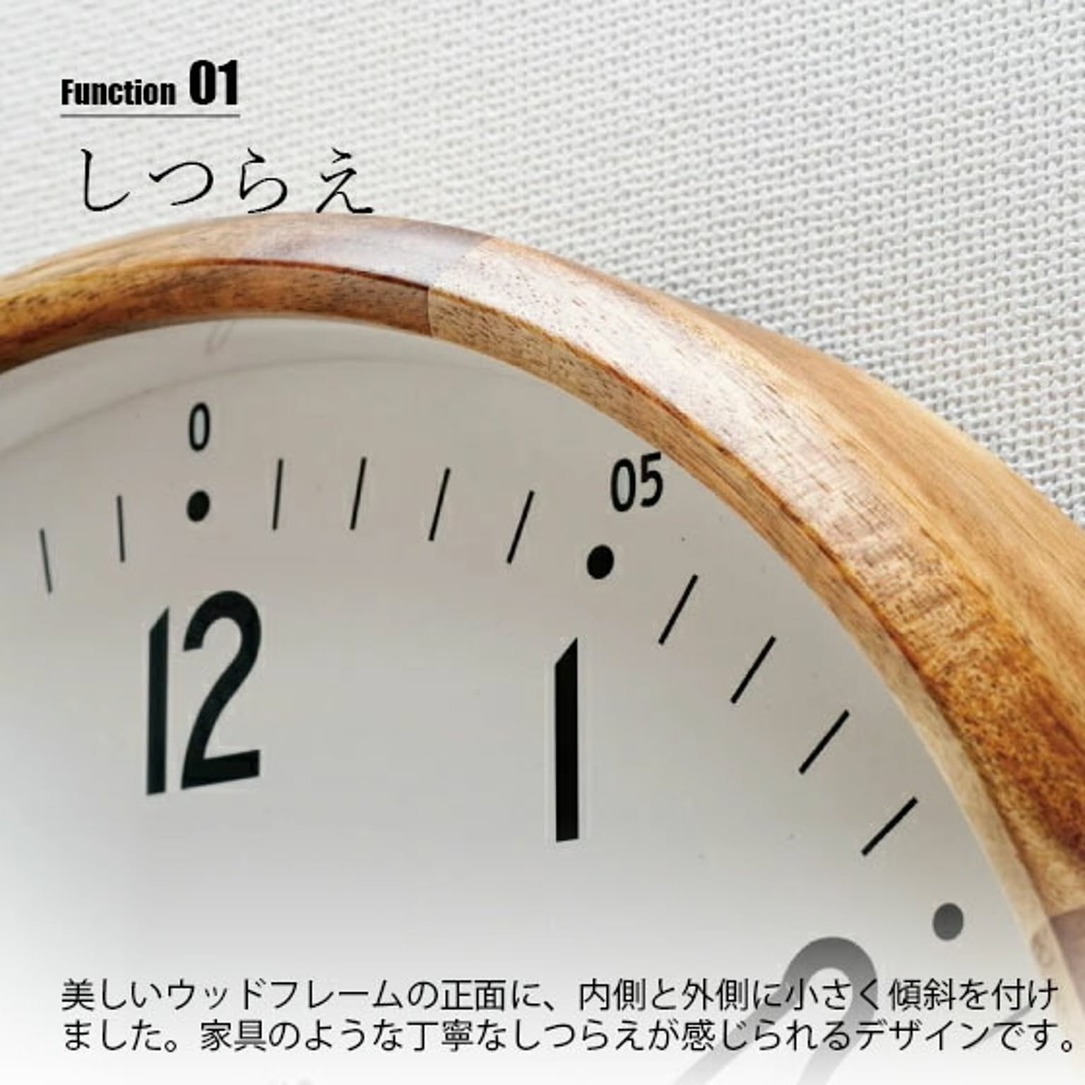 ビンテージクロックをモチーフにメンズライクに仕上げた壁掛け時計です。丁寧にしつらえたウッドフレームがシンプルな文字盤を引き立てます。文字盤のカラーはブラックとホワイトの2色から。お部屋の雰囲気に合わせてお選びいただけます。美しいウッドフレームの正面に、内側と外側に小さく傾斜を付けました。家具のような丁寧なしつらえが感じられるデザインです。ビンテージクロックをお手本にスッキリとしたデザインの文字盤は見易さもクリアに。モノトーンの文字盤にゴールドの秒針が映えます。しっかりとした造りのウッドフレームは合計8つのパーツを継いで作られています。木目や色の濃淡が特徴的で美しい、アカシアを使っています。無骨な表情を持つインダストリアルなデザインの照明やコーディネイトと好相性です。時刻合わせが不要で正確な時刻を表示する人気の電波時計仕様なので贈り物としてもおすすめです。