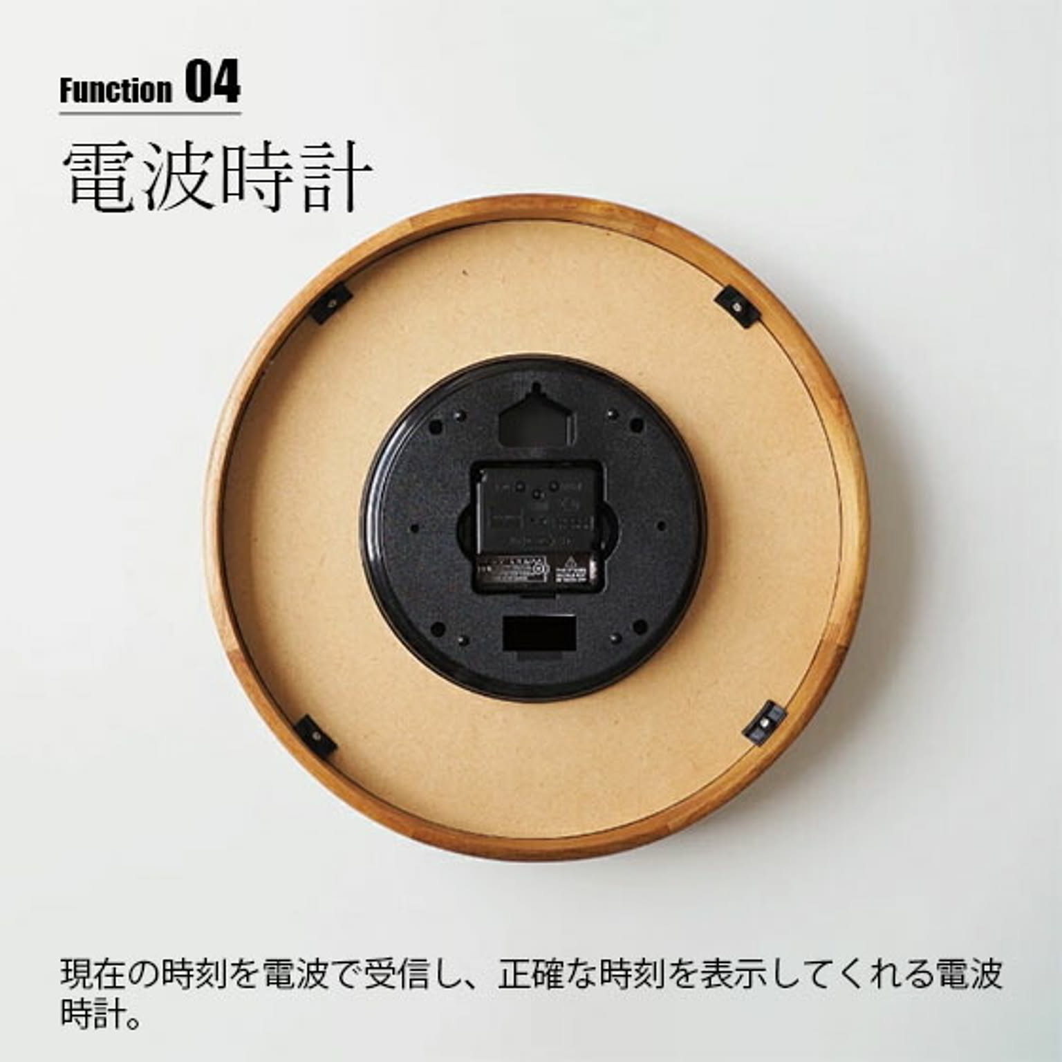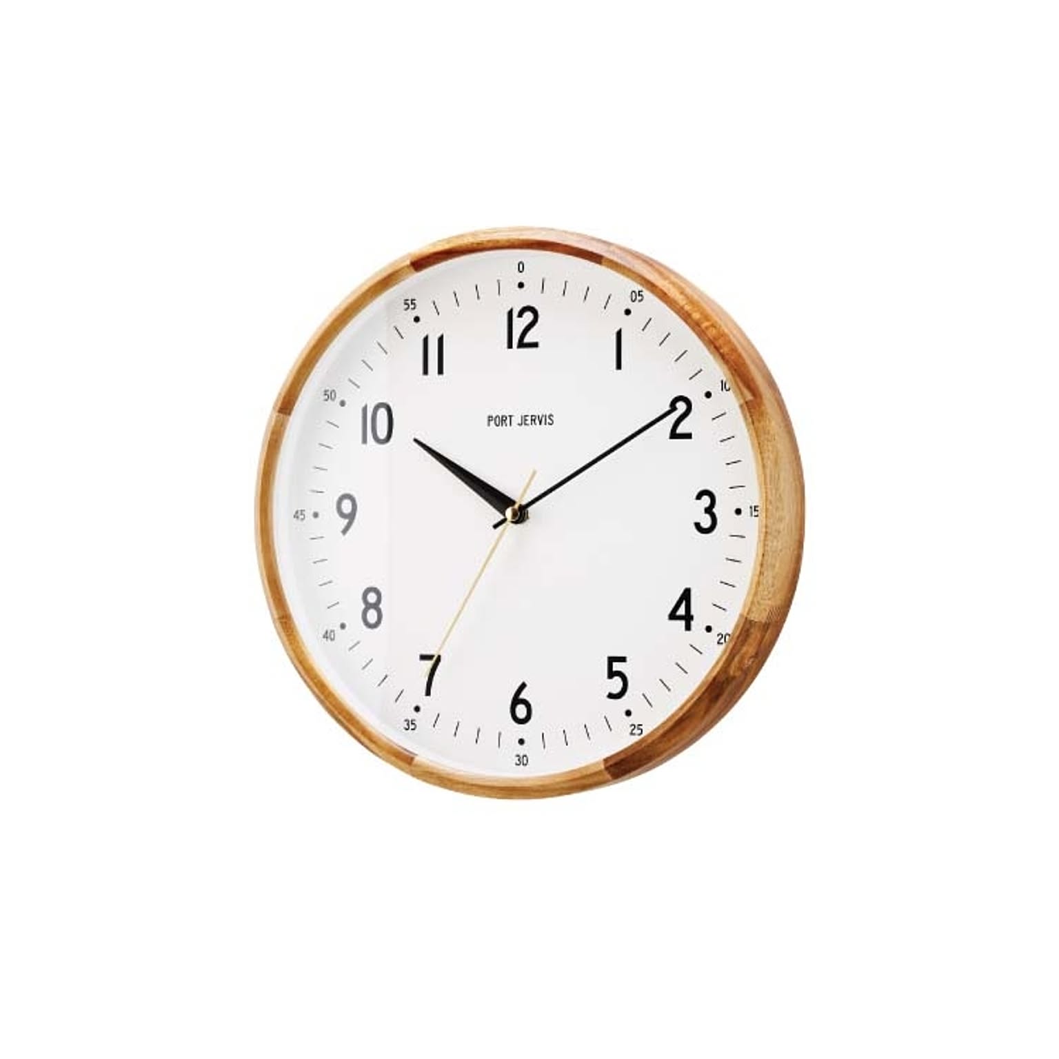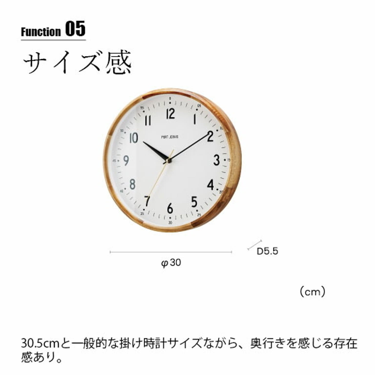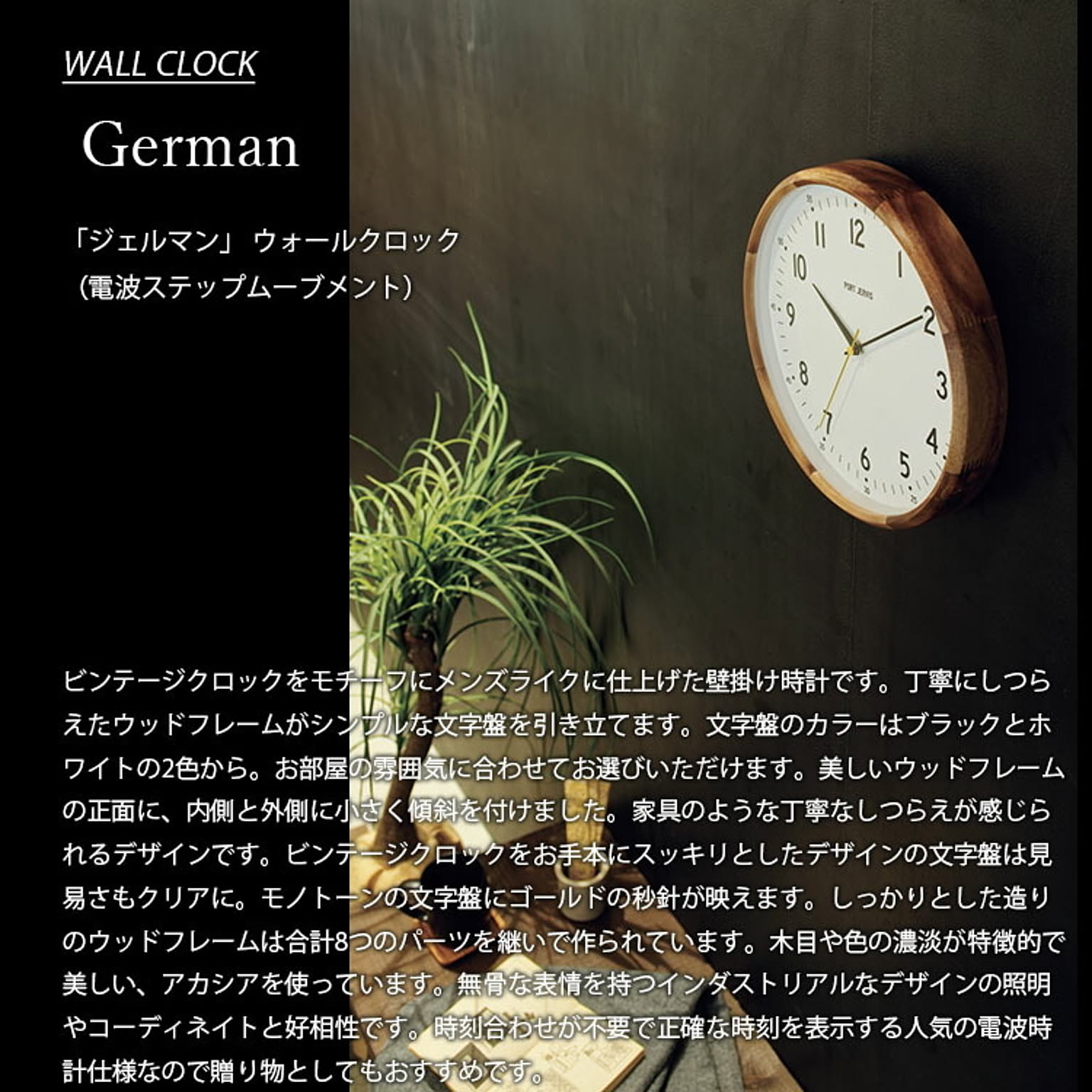 ビンテージクロックをモチーフにメンズライクに仕上げた壁掛け時計です。丁寧にしつらえたウッドフレームがシンプルな文字盤を引き立てます。文字盤のカラーはブラックとホワイトの2色から。お部屋の雰囲気に合わせてお選びいただけます。美しいウッドフレームの正面に、内側と外側に小さく傾斜を付けました。家具のような丁寧なしつらえが感じられるデザインです。ビンテージクロックをお手本にスッキリとしたデザインの文字盤は見易さもクリアに。モノトーンの文字盤にゴールドの秒針が映えます。しっかりとした造りのウッドフレームは合計8つのパーツを継いで作られています。木目や色の濃淡が特徴的で美しい、アカシアを使っています。無骨な表情を持つインダストリアルなデザインの照明やコーディネイトと好相性です。時刻合わせが不要で正確な時刻を表示する人気の電波時計仕様なので贈り物としてもおすすめです。