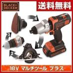 【送料無料】\nブラックアンドデッカー(BLACK&DECKER) \n18V マルチツール プラス \nEVO183P1\n\n●本体サイズ:幅21.5×奥行7.8×高さ23.3cm 重量1.46kg\n●材質:ABS樹脂\n●電圧:DC18V\n●バッテリー容量:1.5Ah\n●スイッチ:無段変速\n●LEDライト:あり\n●ビットホルダー:マグネット\n●インパクトドライバー:(回転数)0-3,100回/分、(打撃数)0-4,000回/分、(最大トルク)140N・m、(チャック能力)6.35mm六角軸\n●ドリルドライバー:(回転数)0-800回/分、(最大トルク)22N・m、(クラッチ)11段階、(チャック能力)1-10mm\n●丸ノコ:(回転数)0-3,400回/分、(ノコ刃)外径85mm、内径15mm、(最大切込深さ)21mm\n●サンダー:(回転数)0-9,000回/分、(パッド交換)ワンタッチ\n●付属品:ビット×11 50mm(プラス#1/#2、 ポジドライブ#2、 マイナス#8、 六角#3/#4/#5/#6)、100mm(プラス#2、ポジドライブ#2、2.5mmドリル)、チップソー(丸ノコ24Tブレード)、サンドペーパー×10(粗目#80×5枚、細目#120×5枚)、集塵アダプター、1.5Ahリチウムバッテリー×2、40分急速充電器、専用ソフトバッグ\n●人気のインパクト、丸ノコが付属のマルチツール