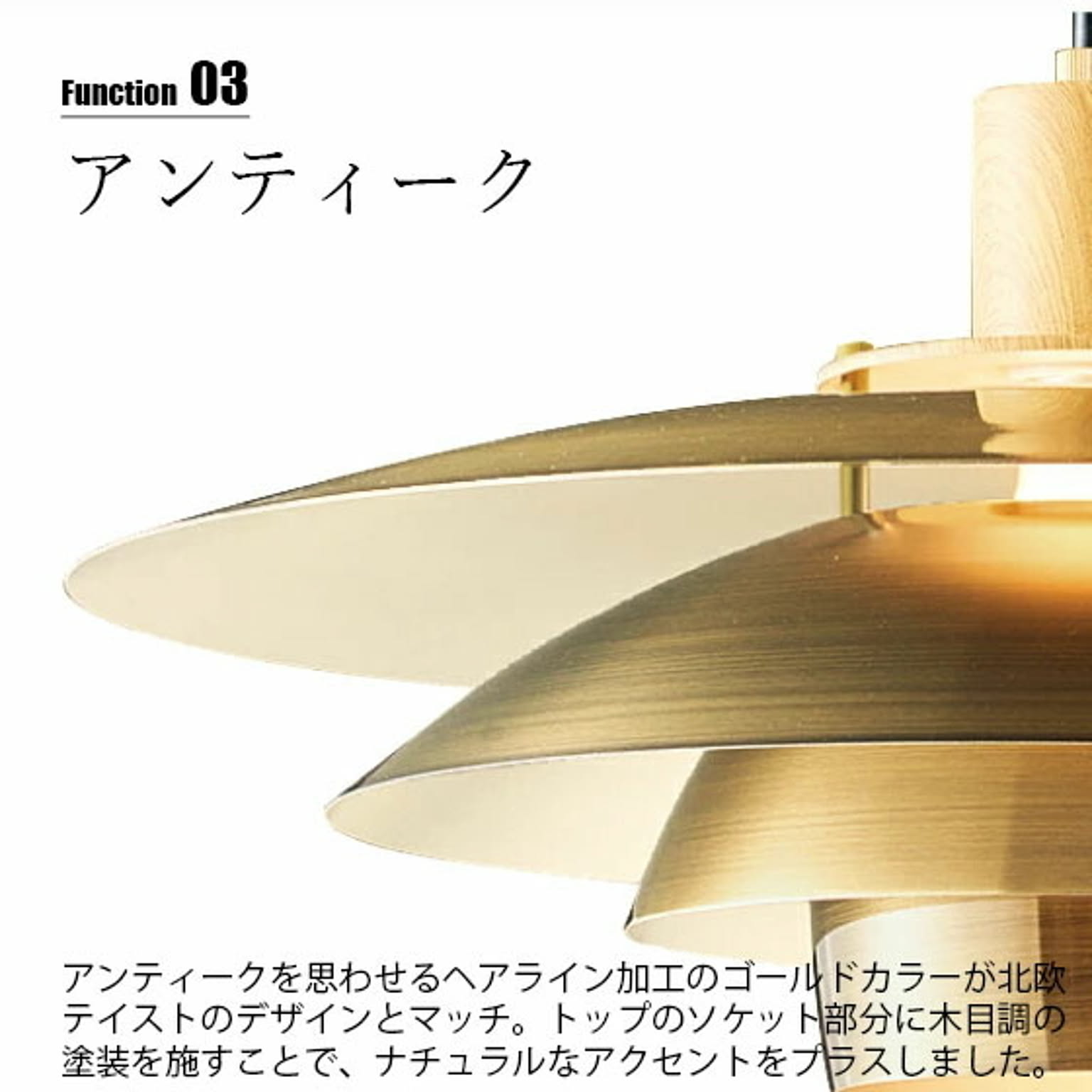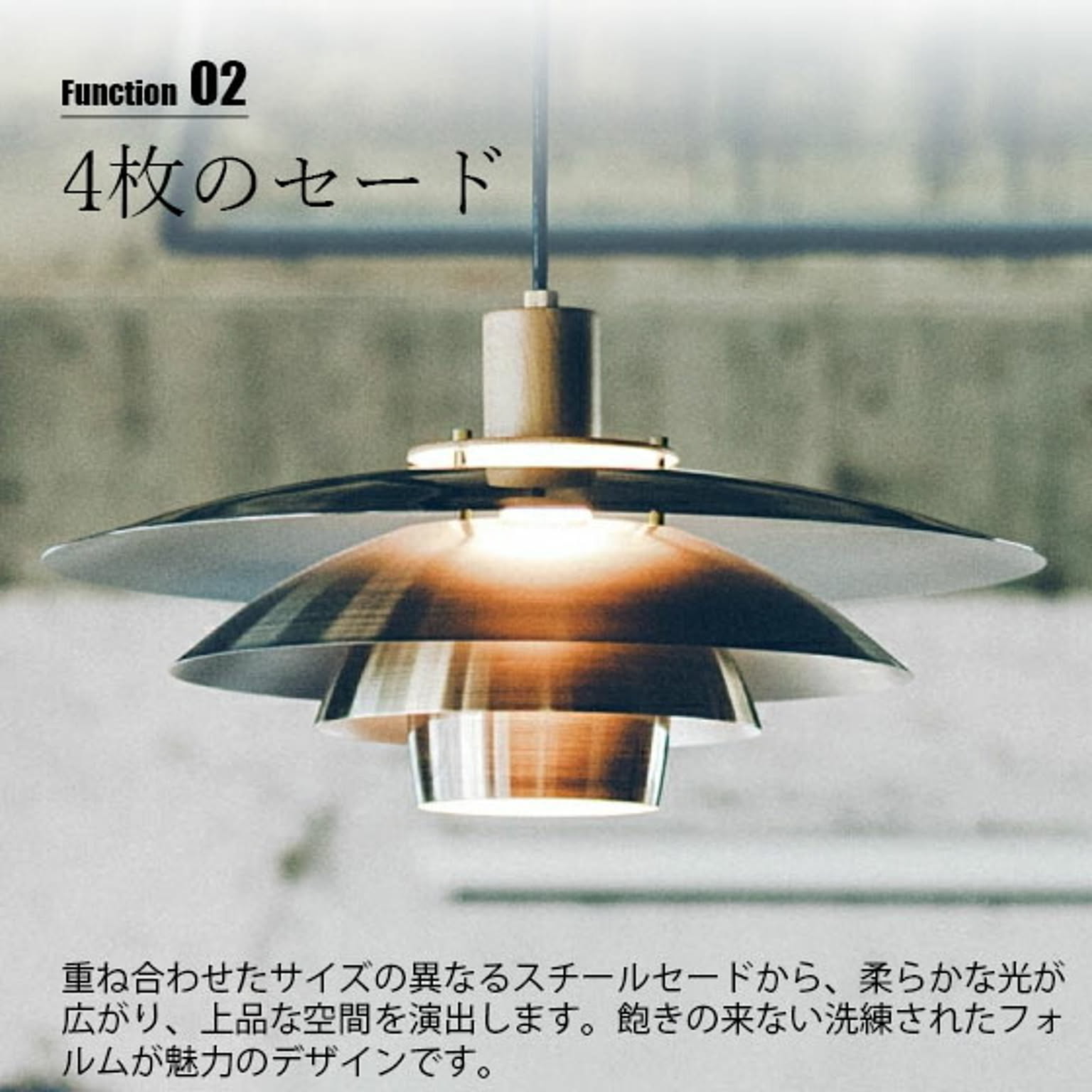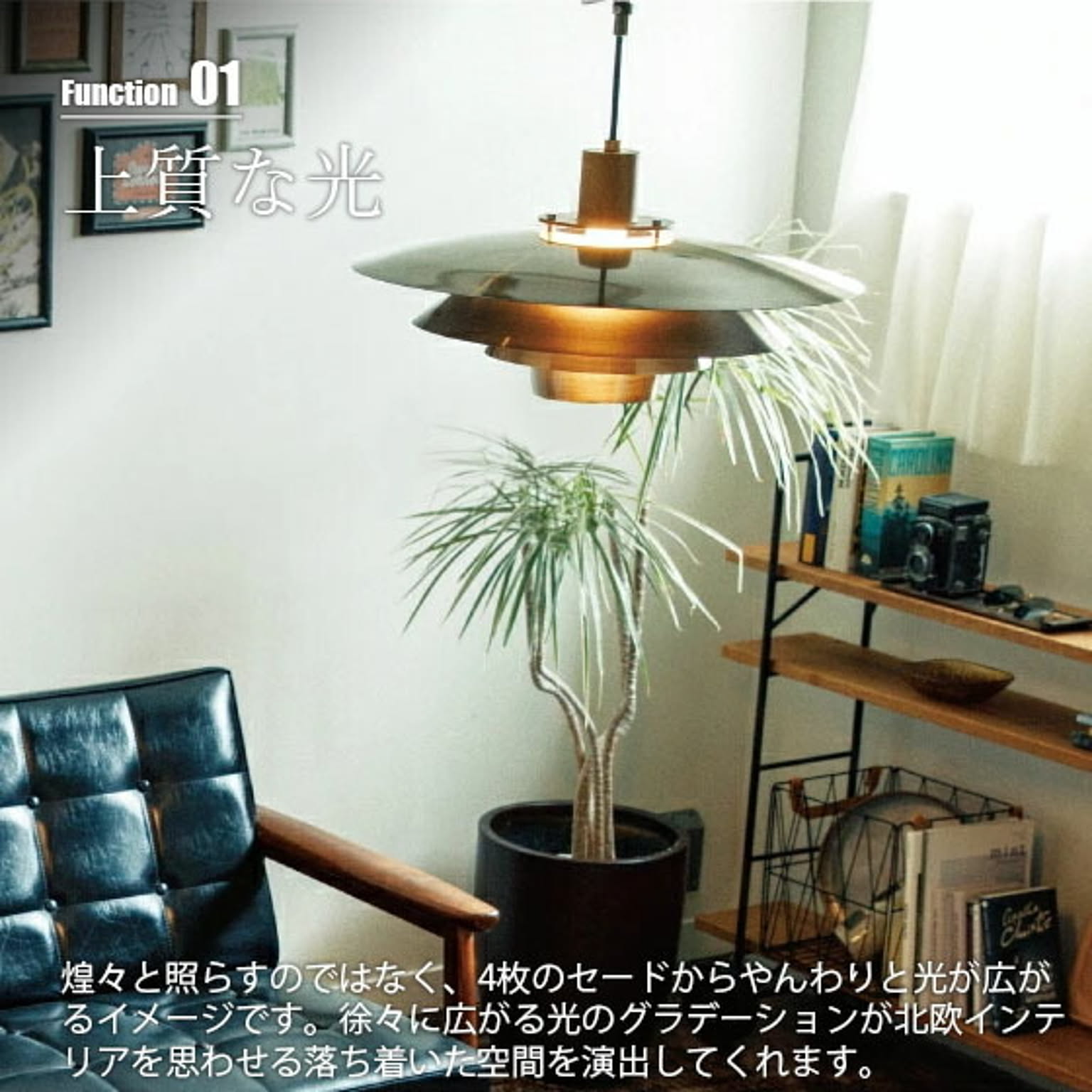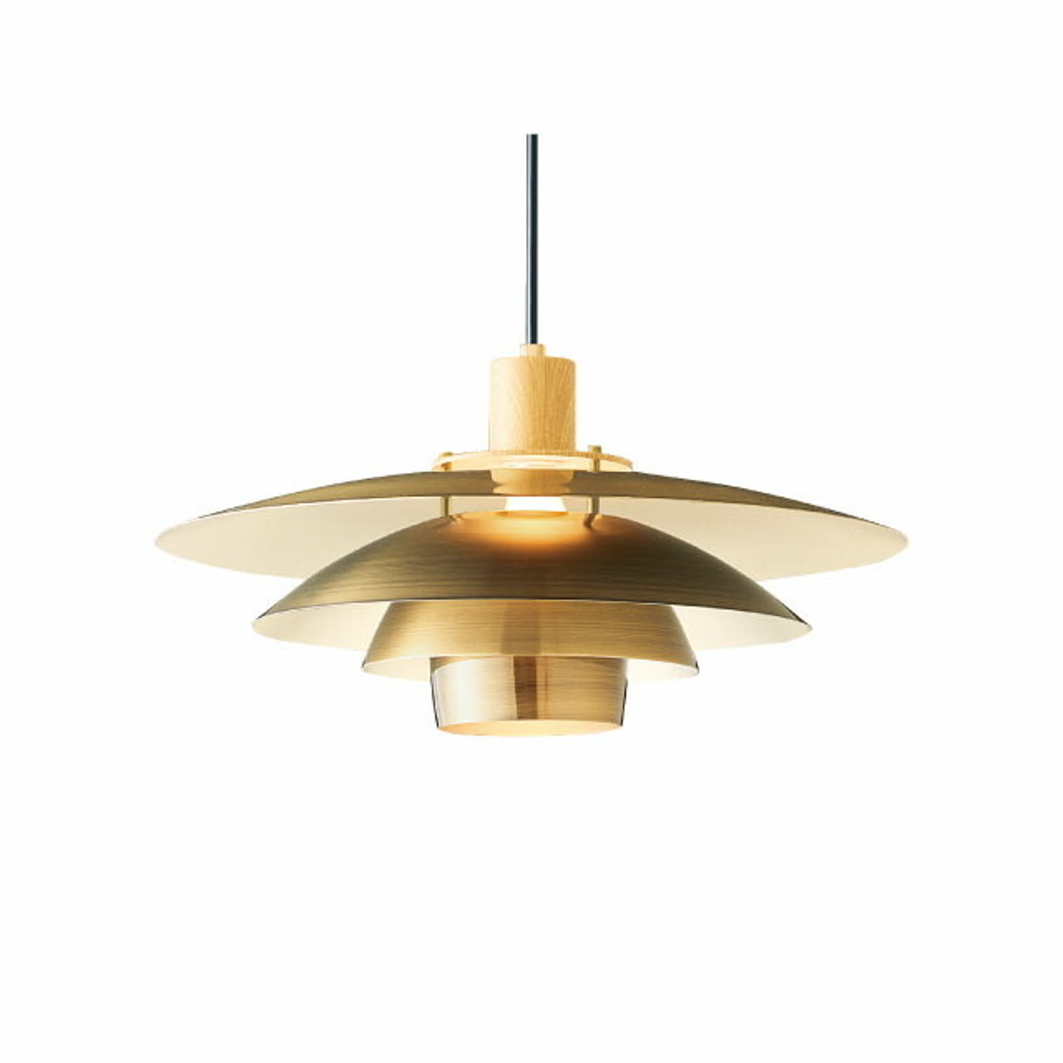 4枚のセードを、光源を包み込むように重ねた北欧テイスト溢れるデザインのペンダントライトです。アンティーク風のゴールドカラーが上品で落ち着いた空間を演出します。煌々と照らすのではなく、4枚のセードからやんわりと光が広がるイメージです。徐々に広がる光のグラデーションが北欧インテリアを思わせる落ち着いた空間を演出してくれます。重ね合わせたサイズの異なるスチールセードから、柔らかな光が広がり、上品な空間を演出します。飽きの来ない洗練されたフォルムが魅力のデザインです。アンティークを思わせるヘアライン加工のゴールドカラーが北欧テイストのデザインとマッチ。トップのソケット部分に木目調の塗装を施すことで、ナチュラルなアクセントをプラスしました。鈍い輝きのゴールドカラーがレトロで高級感のある空間を盛り上げます。長さの調節もでき、余分なコードはシーリングカップの中にスッキリと収納できます。和風にも洋風にも合うクラシカルなイメージは、人気の北欧テイストやモダン、ナチュラルな場所まで幅広く馴染みます。