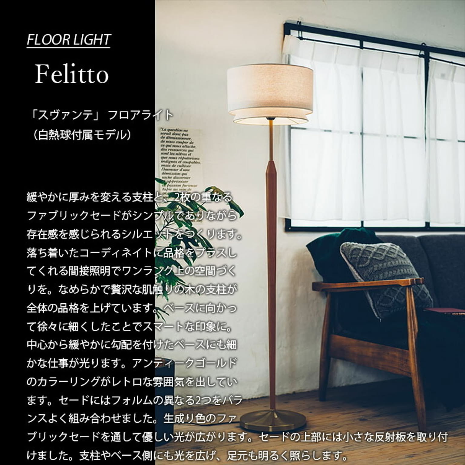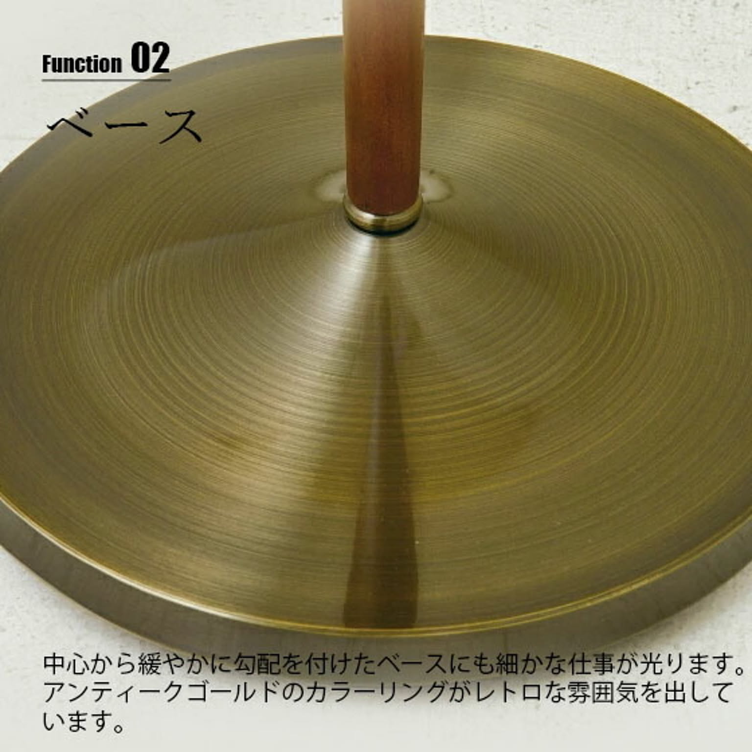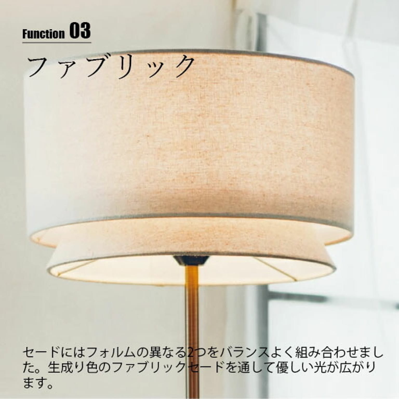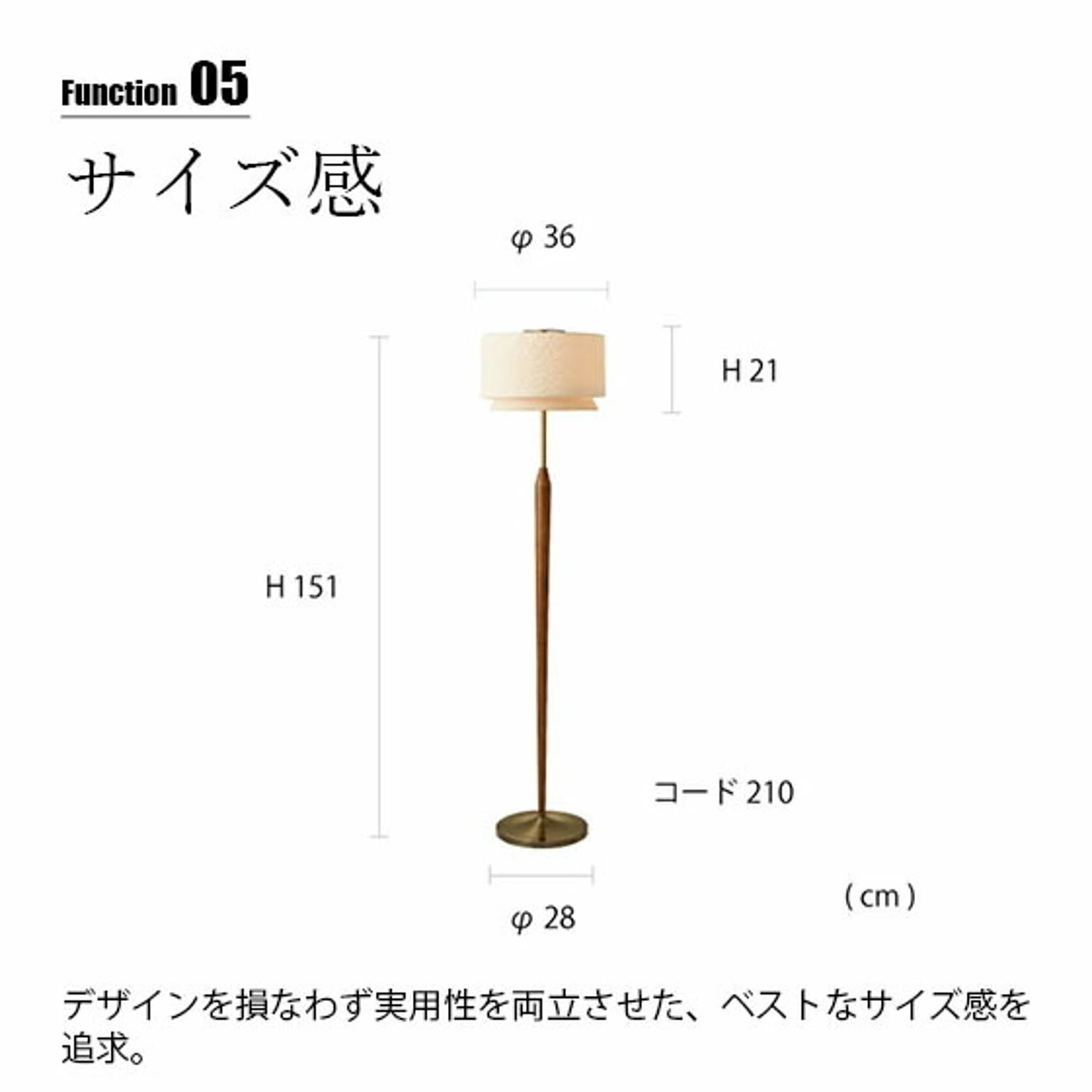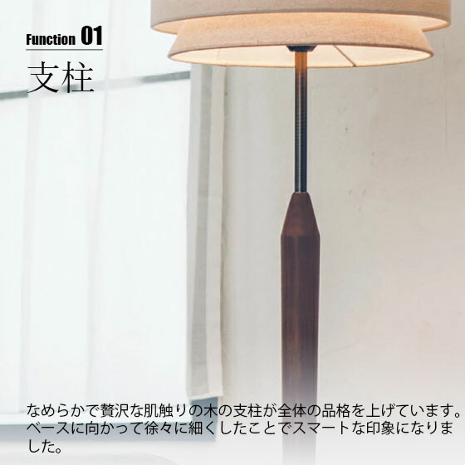 ミッドセンチュリーを彷彿とさせるシックなフロアライト。緩やかに厚みを変える支柱と、2枚の重なるファブリックセードがシンプルでありながら存在感を感じられるシルエットをつくります。落ち着いたコーディネイトに品格をプラスしてくれる間接照明でワンランク上の空間づくりを。なめらかで贅沢な肌触りの木の支柱が全体の品格を上げています。ベースに向かって徐々に細くしたことでスマートな印象になりました。中心から緩やかに勾配を付けたベースにも細かな仕事が光ります。アンティークゴールドのカラーリングがレトロな雰囲気を出しています。セードにはフォルムの異なる2つをバランスよく組み合わせました。生成り色のファブリックセードを通して優しい光が広がります。セードの上部には小さな反射板を取り付けました。支柱やベース側にも光を広げ、足元も明るく照らします。スイッチは足でも切り替えができるフットスイッチを採用しました。