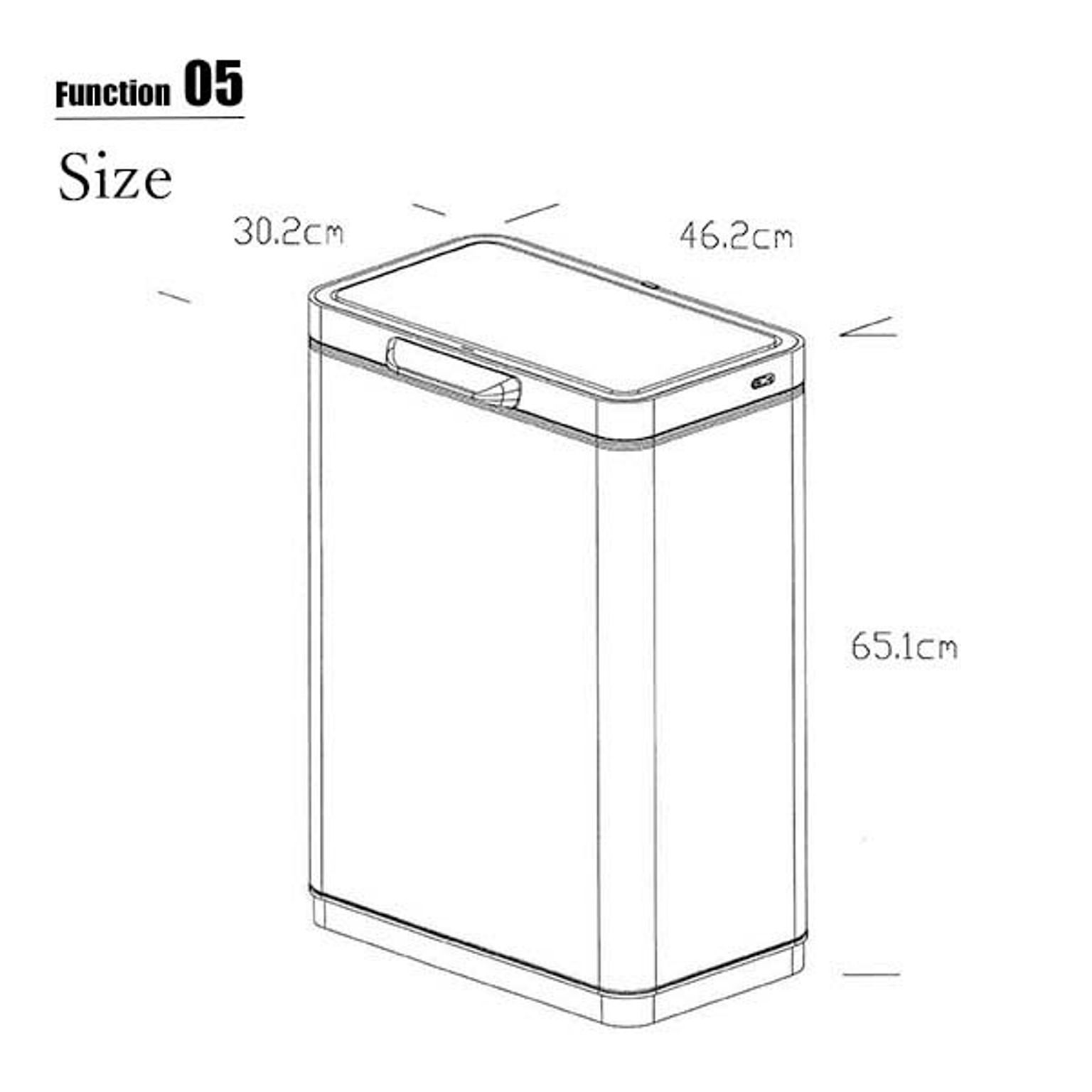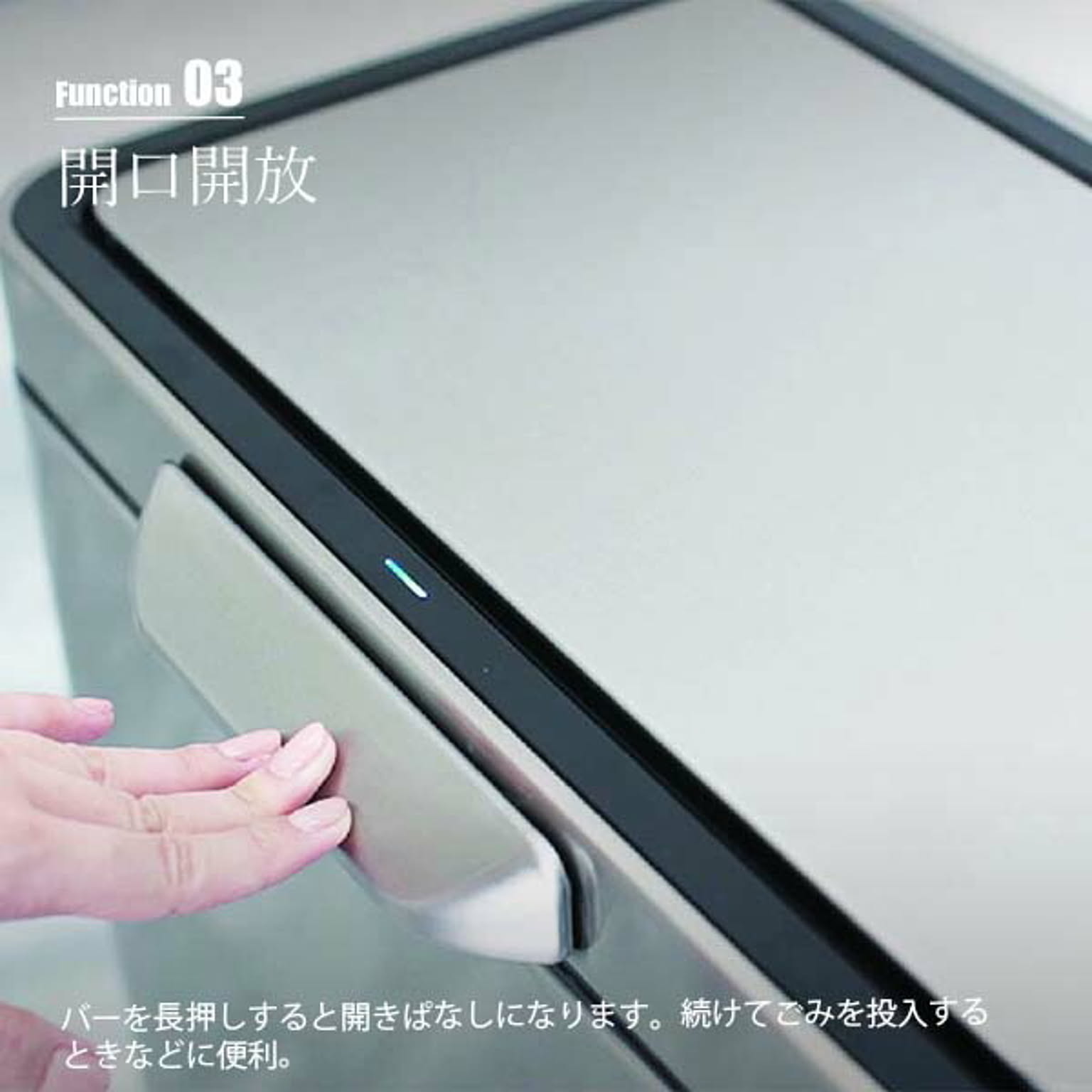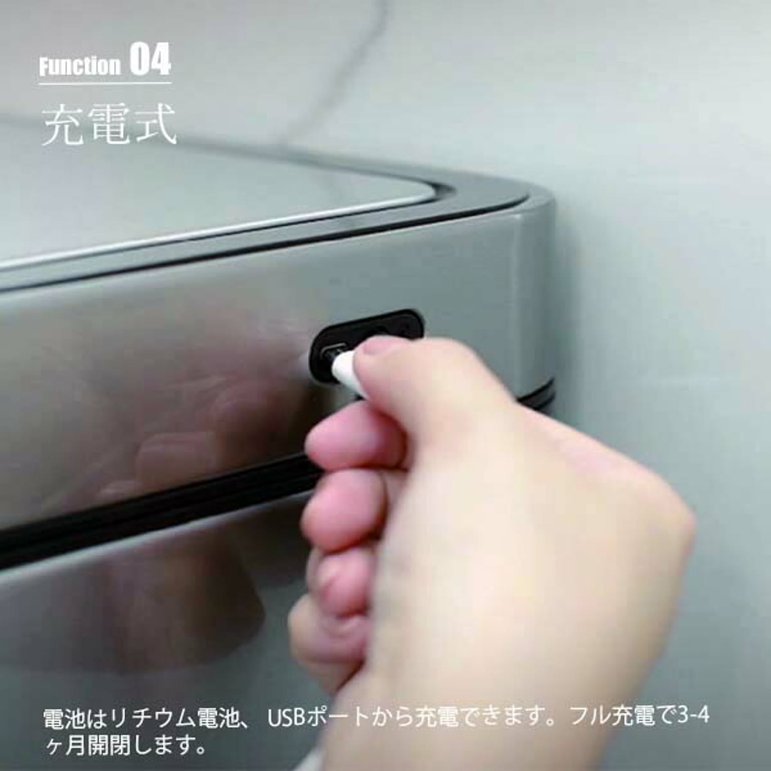 通常のタッチバー式ゴミ箱は開いた後に手でフタを閉じる必要がありました。イータッチは5秒後に自動でフタが閉じるタッチバー式ゴミ箱です。手がふさがっている時などは脚でもタッチできる構造。おまけにリチウムイオンバッテリー充電方式で電池交換の手間がかかりません。 表面は指紋が残りにくい加工を施したステンレス加工。
