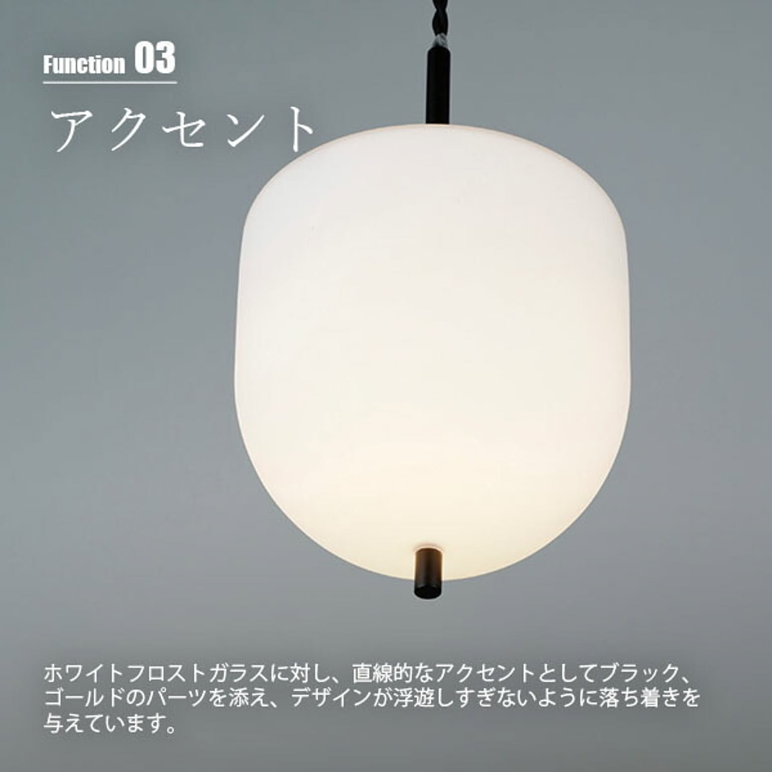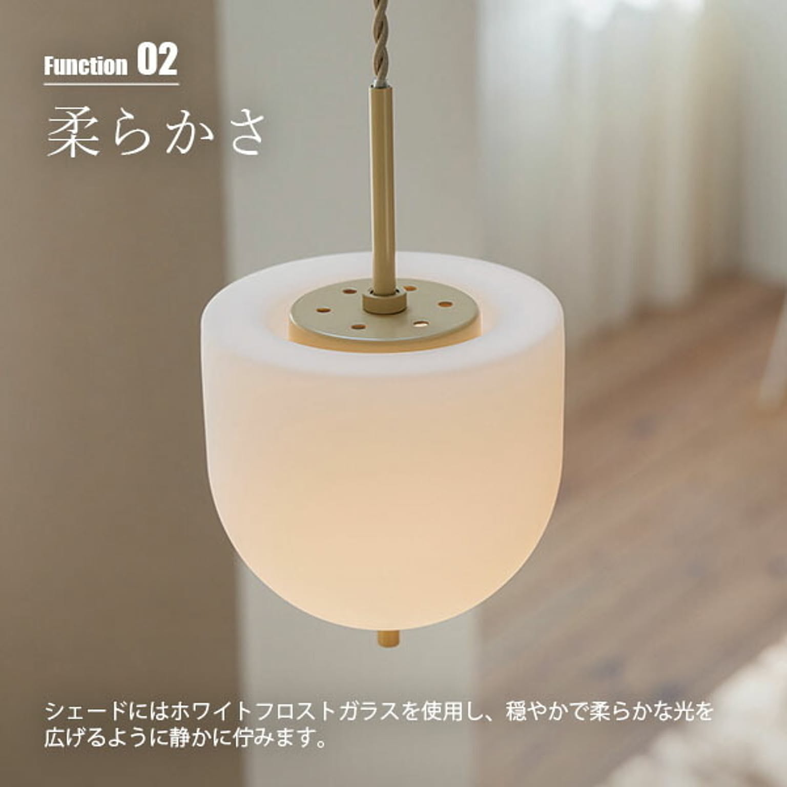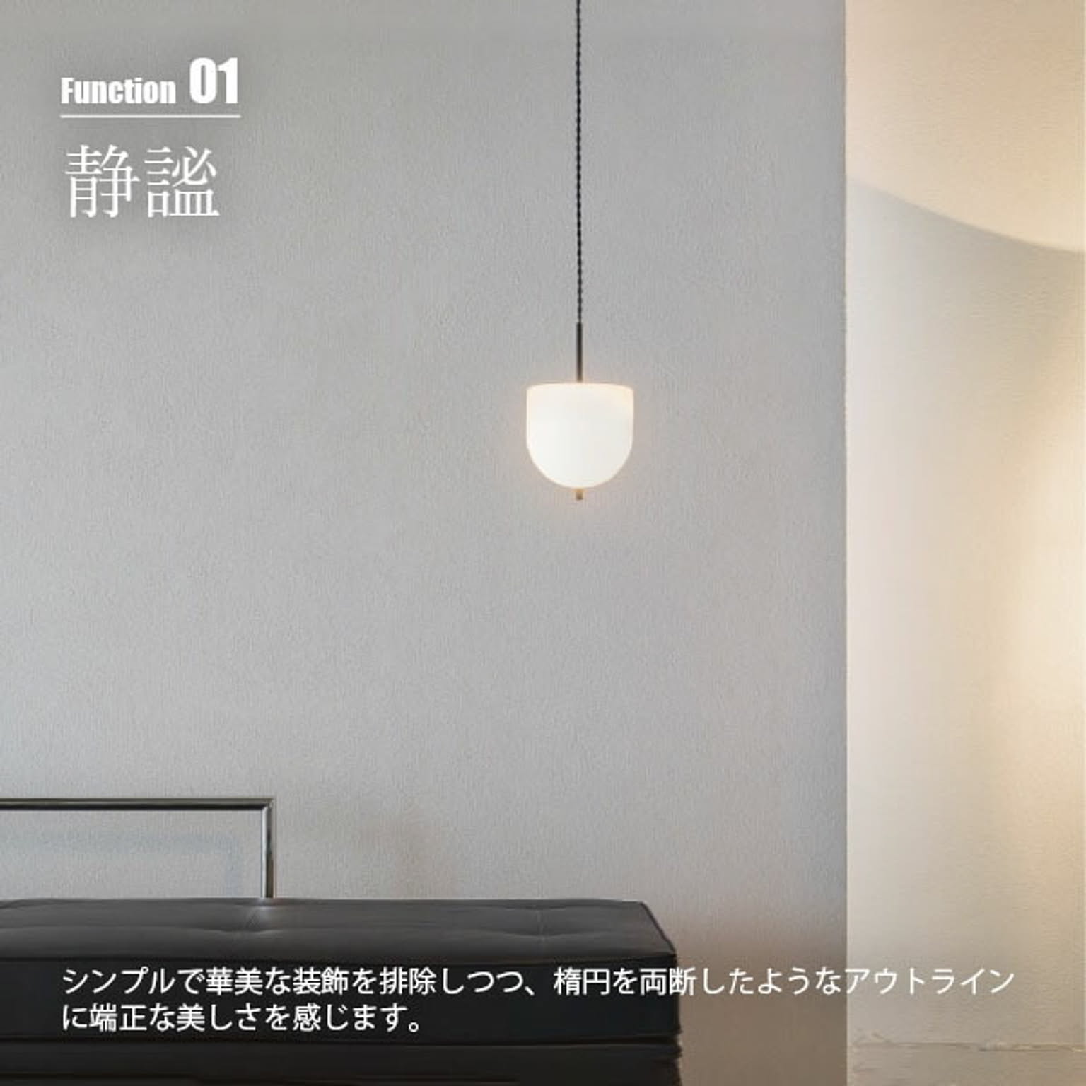 直線的なポールと丸みを帯びたセードを組み合わせた、独楽のように均衡の取れた形状が落ち着きと静けさを感じさせます。ソケットカバーなどの機械的な部分を見せないことでノイズが軽減され、まるで光が空中に浮かんでいるような印象を与えます。柔らかな光が広がるホワイトフロストガラスが眩しさを抑え、優しい灯りを提供します。ニュートラルでモダン、かつシンプルなルックスが空間を引き立てるペンダントライトです。