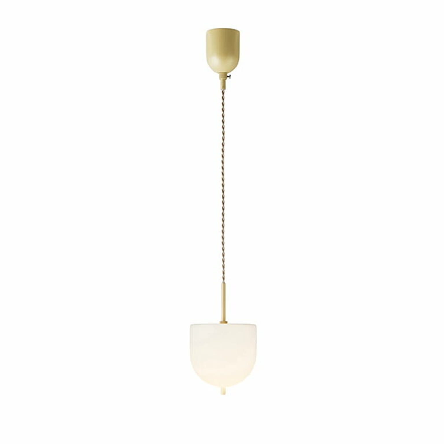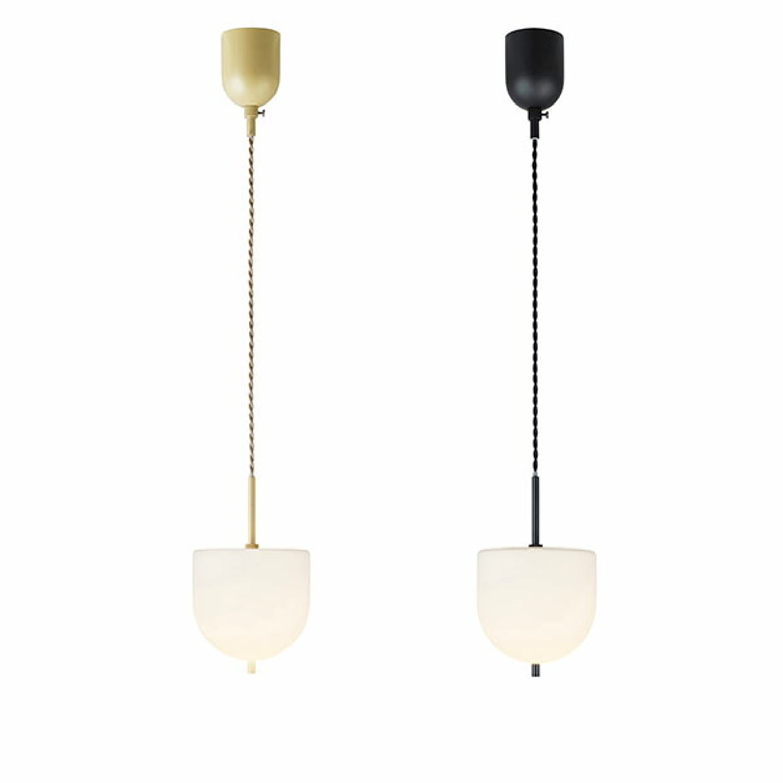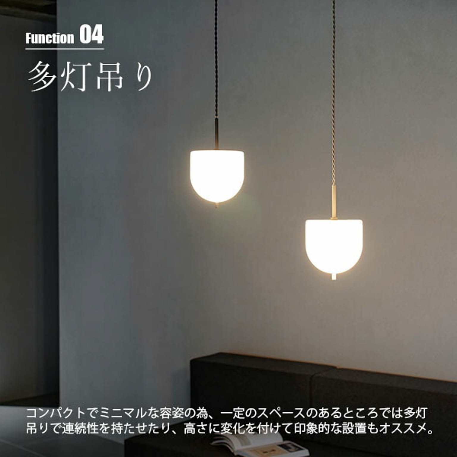 直線的なポールと丸みを帯びたセードを組み合わせた、独楽のように均衡の取れた形状が落ち着きと静けさを感じさせます。ソケットカバーなどの機械的な部分を見せないことでノイズが軽減され、まるで光が空中に浮かんでいるような印象を与えます。柔らかな光が広がるホワイトフロストガラスが眩しさを抑え、優しい灯りを提供します。ニュートラルでモダン、かつシンプルなルックスが空間を引き立てるペンダントライトです。