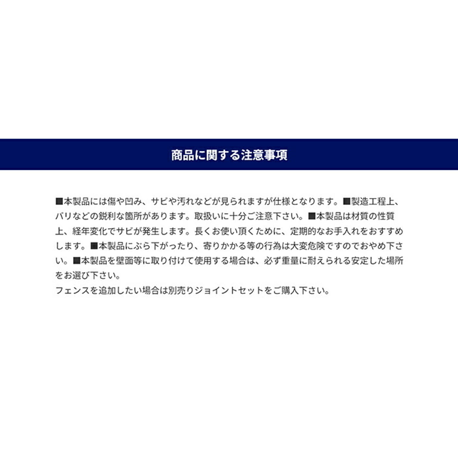 製造工程上、細かな傷や擦れ、研磨痕が生じます。また、亜鉛メッキの仕様上、表面に白錆が生じる場合がありますが、品質や安全性に影響はございません。製品の特性としてご理解ください。