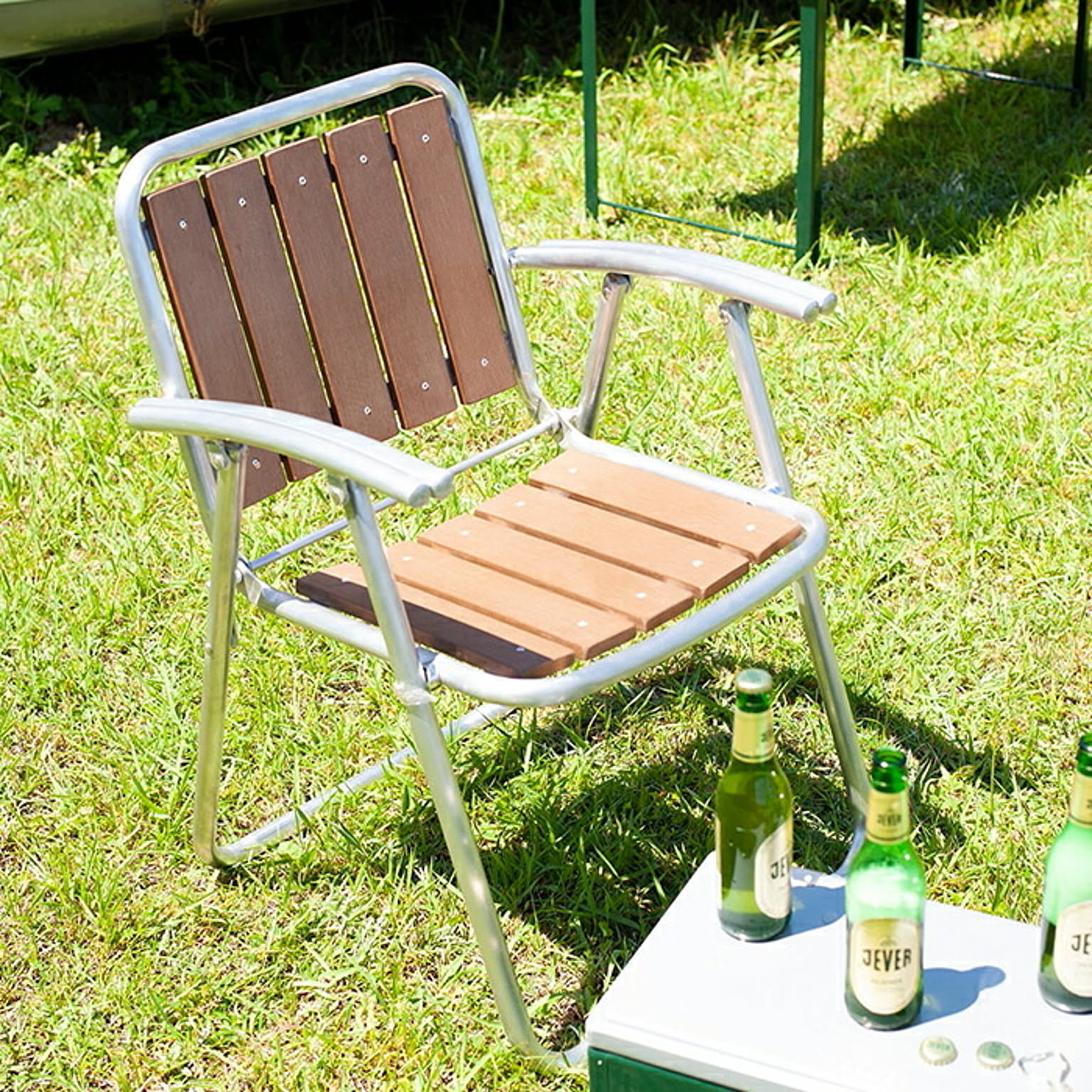 アルミの無骨さはそのままに、背もたれと座面には木材とプラスチックを複合したWPC素材を採用。耐久性や耐候性、耐水性をアップデートしました。ゆったりとした座面、当たりの良い肘掛けは、庭先やベランダでのくつろぎ時間に心地良さをプラス。