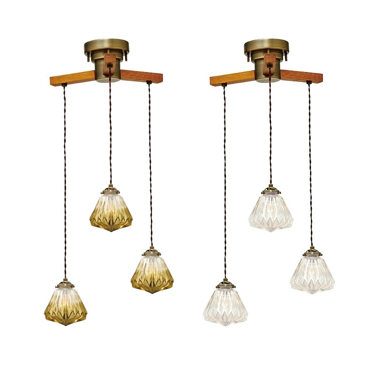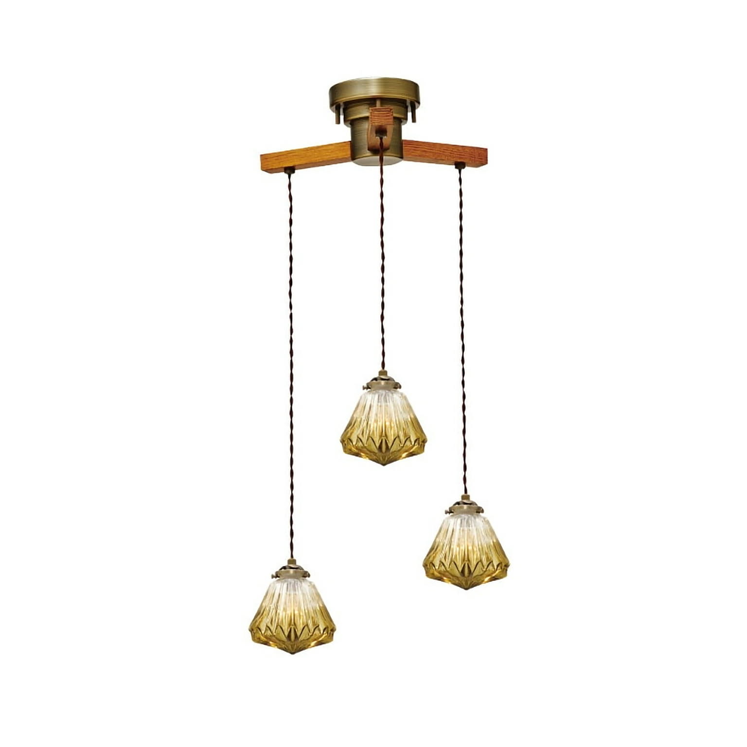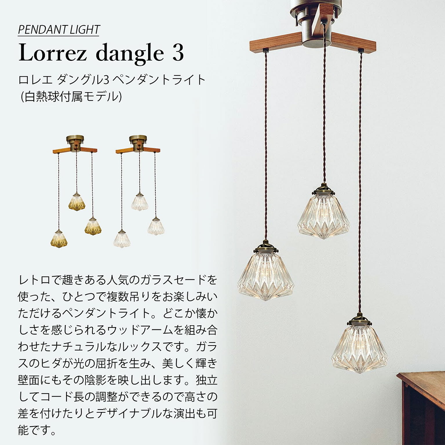 レトロで趣きある人気のガラスセードを使った、ひとつで複数吊りをお楽しみいただけるペンダントライト。どこか懐かしさを感じられるウッドアームを組み合わせたナチュラルなルックスです。ガラスのヒダが光の屈折を生み、美しく輝き壁面にもその陰影を映し出します。独立してコード長の調整ができるので高さの差を付けたりとデザイナブルな演出も可能です。