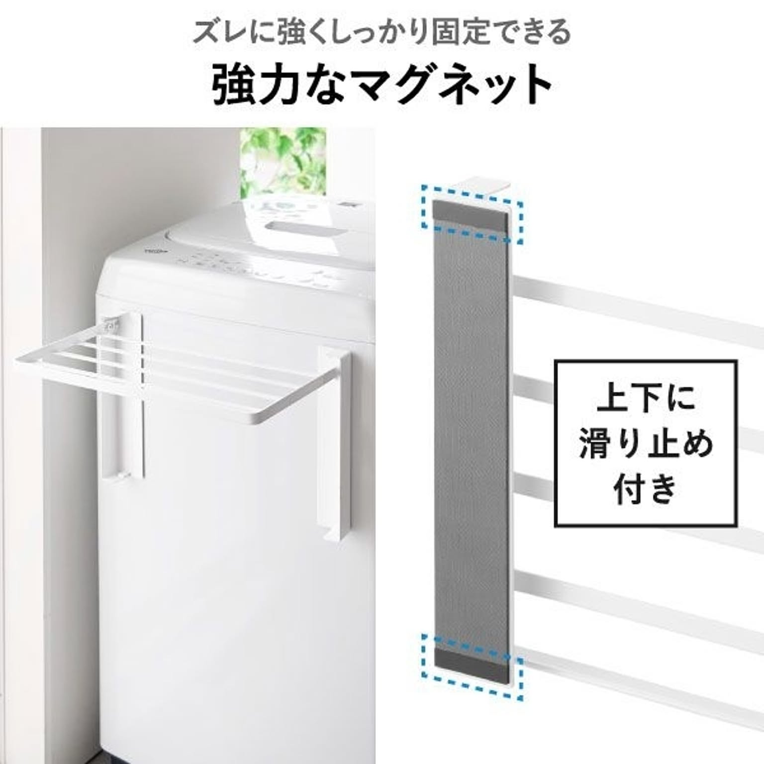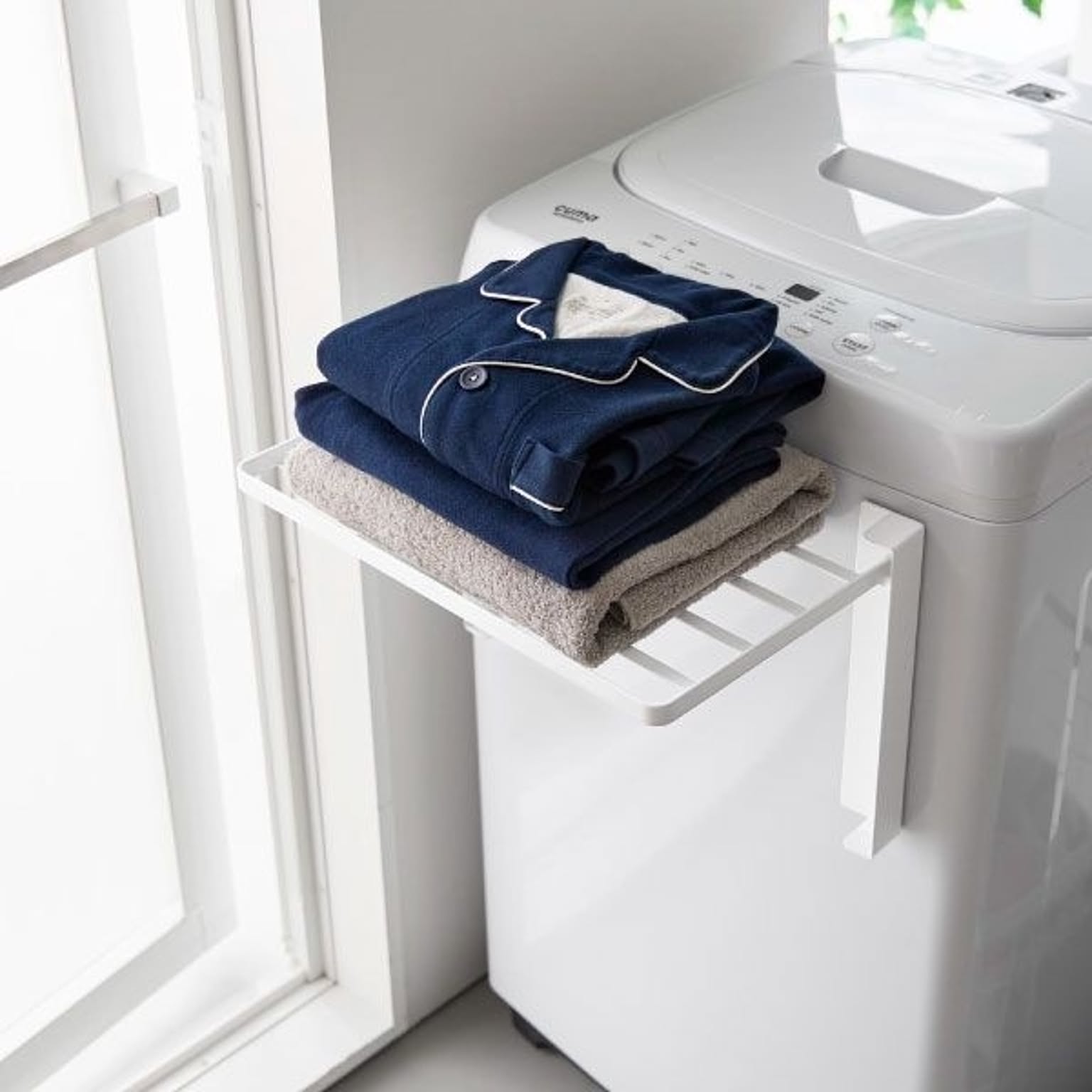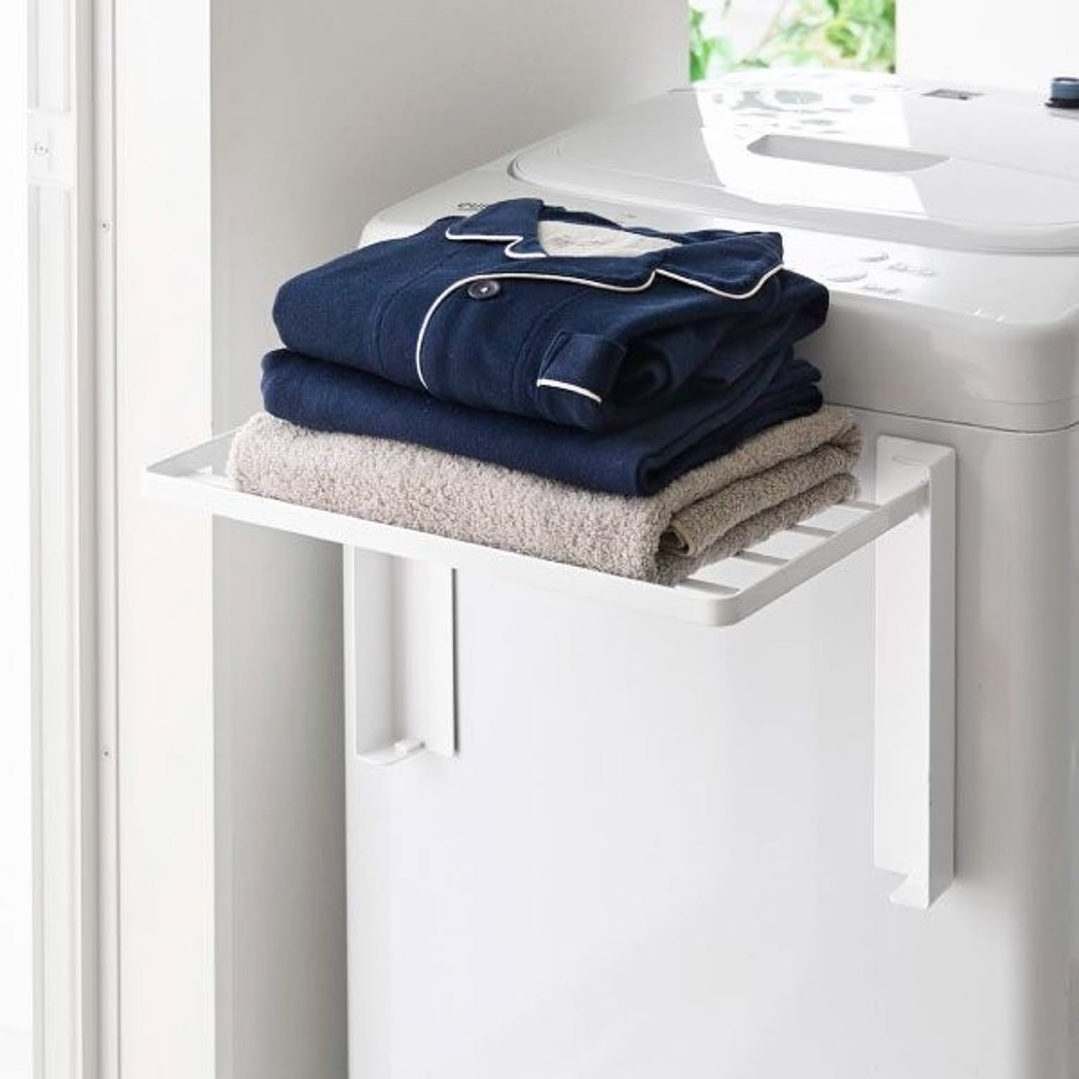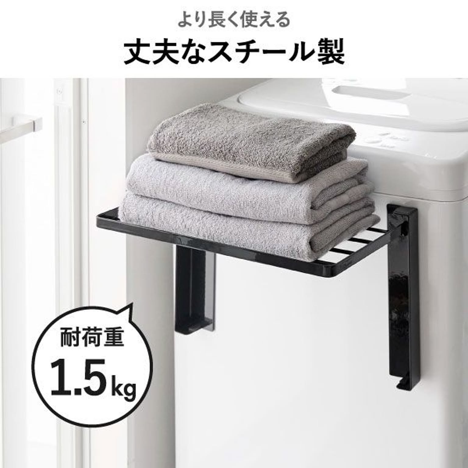 洗濯機にぴたっと貼って使える、タワーの洗濯機横マグネット折り畳み棚です。入浴後に使うタオルや着替えを一時置きする棚を、手軽に後付けできて便利。洗濯機横マグネット折り畳み棚の背面には、強力なマグネットが付いています。置き場に困っていたタオルや着替えを、浮かせて収納できるのはうれしいですね。こちらの洗濯機横マグネット折り畳み棚は、曲面に沿って可動するのが特徴です。丸みを帯びた洗濯機前面部分にも、しっかりと取り付けることができます。使い終わったら棚部分をコンパクトに収納できる折り畳み式で、通行の邪魔になりません。棚を下から上へと引き上げて使用するタイプなので、高い位置に棚をキープできます。左右にあるロックピンに引っ掛け部を差し込むことで、しっかりと棚を固定できます。洗濯機横マグネット折り畳み棚はスチール製なので、キズや汚れに強く、長く使えます。様々なインテリアに溶け込んでくれる、無駄のないシンプルなモノトーンデザイン。洗濯機横マグネット折り畳み棚の色は、ホワイトとブラックの2色からお選びいただけます。タワーの洗濯機横マグネット折り畳み棚を使って、暮らしをより快適に。