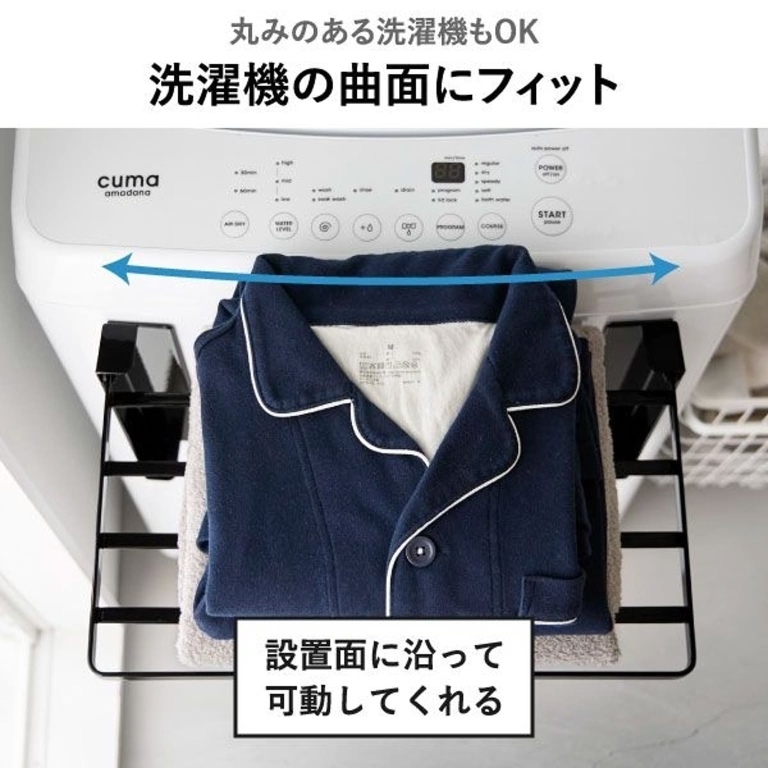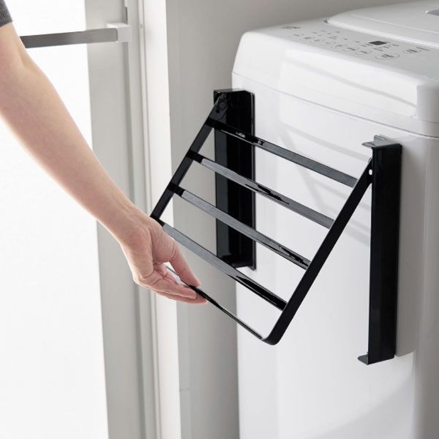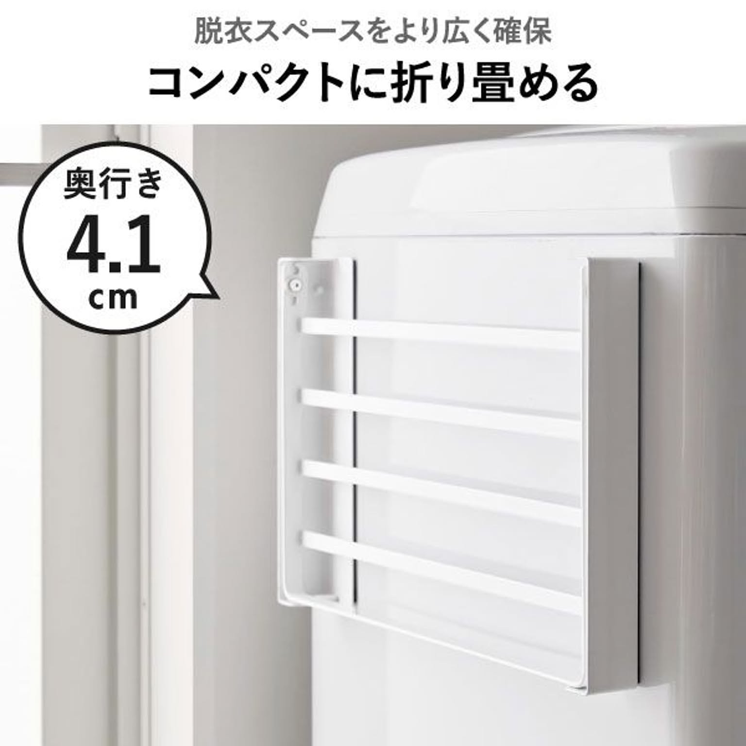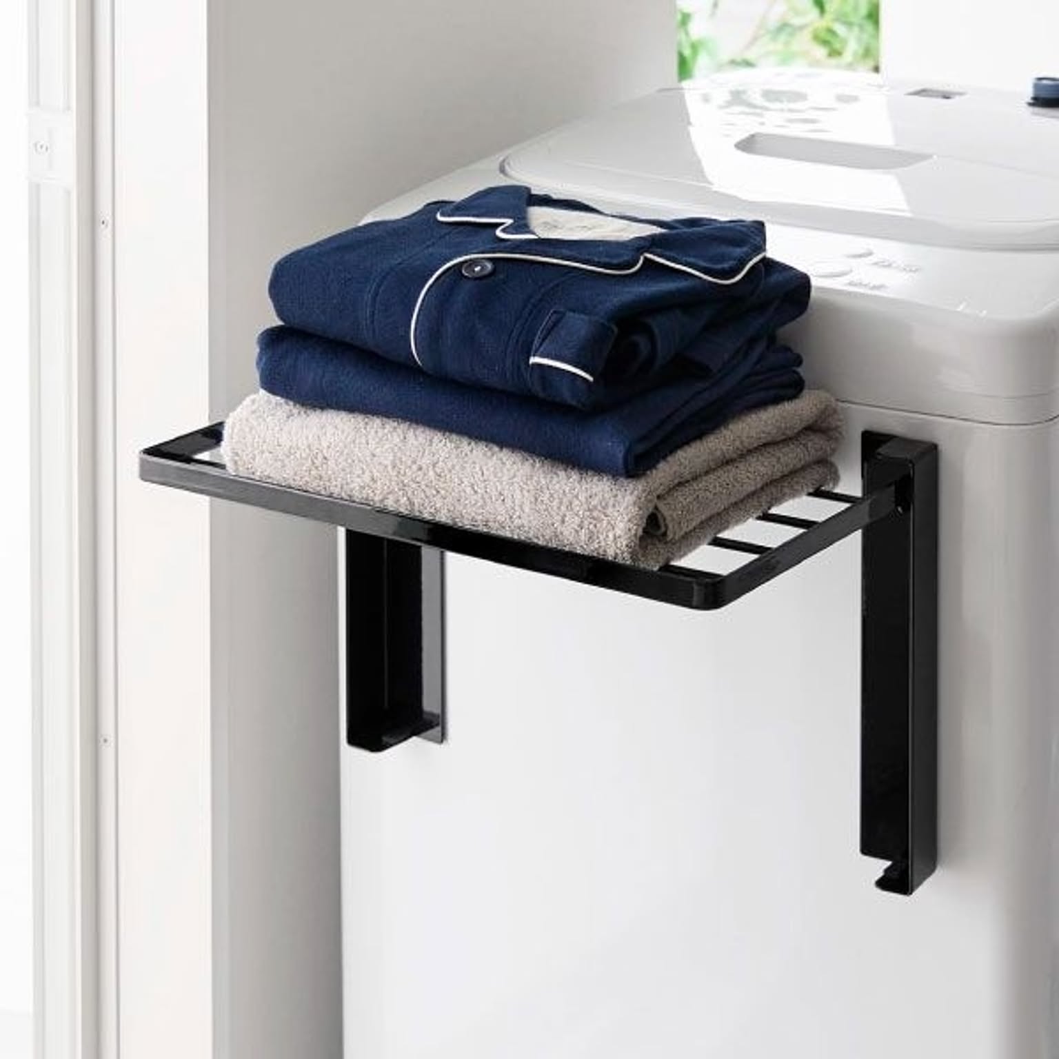 洗濯機にぴたっと貼って使える、タワーの洗濯機横マグネット折り畳み棚です。入浴後に使うタオルや着替えを一時置きする棚を、手軽に後付けできて便利。洗濯機横マグネット折り畳み棚の背面には、強力なマグネットが付いています。置き場に困っていたタオルや着替えを、浮かせて収納できるのはうれしいですね。こちらの洗濯機横マグネット折り畳み棚は、曲面に沿って可動するのが特徴です。丸みを帯びた洗濯機前面部分にも、しっかりと取り付けることができます。使い終わったら棚部分をコンパクトに収納できる折り畳み式で、通行の邪魔になりません。棚を下から上へと引き上げて使用するタイプなので、高い位置に棚をキープできます。左右にあるロックピンに引っ掛け部を差し込むことで、しっかりと棚を固定できます。洗濯機横マグネット折り畳み棚はスチール製なので、キズや汚れに強く、長く使えます。様々なインテリアに溶け込んでくれる、無駄のないシンプルなモノトーンデザイン。洗濯機横マグネット折り畳み棚の色は、ホワイトとブラックの2色からお選びいただけます。タワーの洗濯機横マグネット折り畳み棚を使って、暮らしをより快適に。