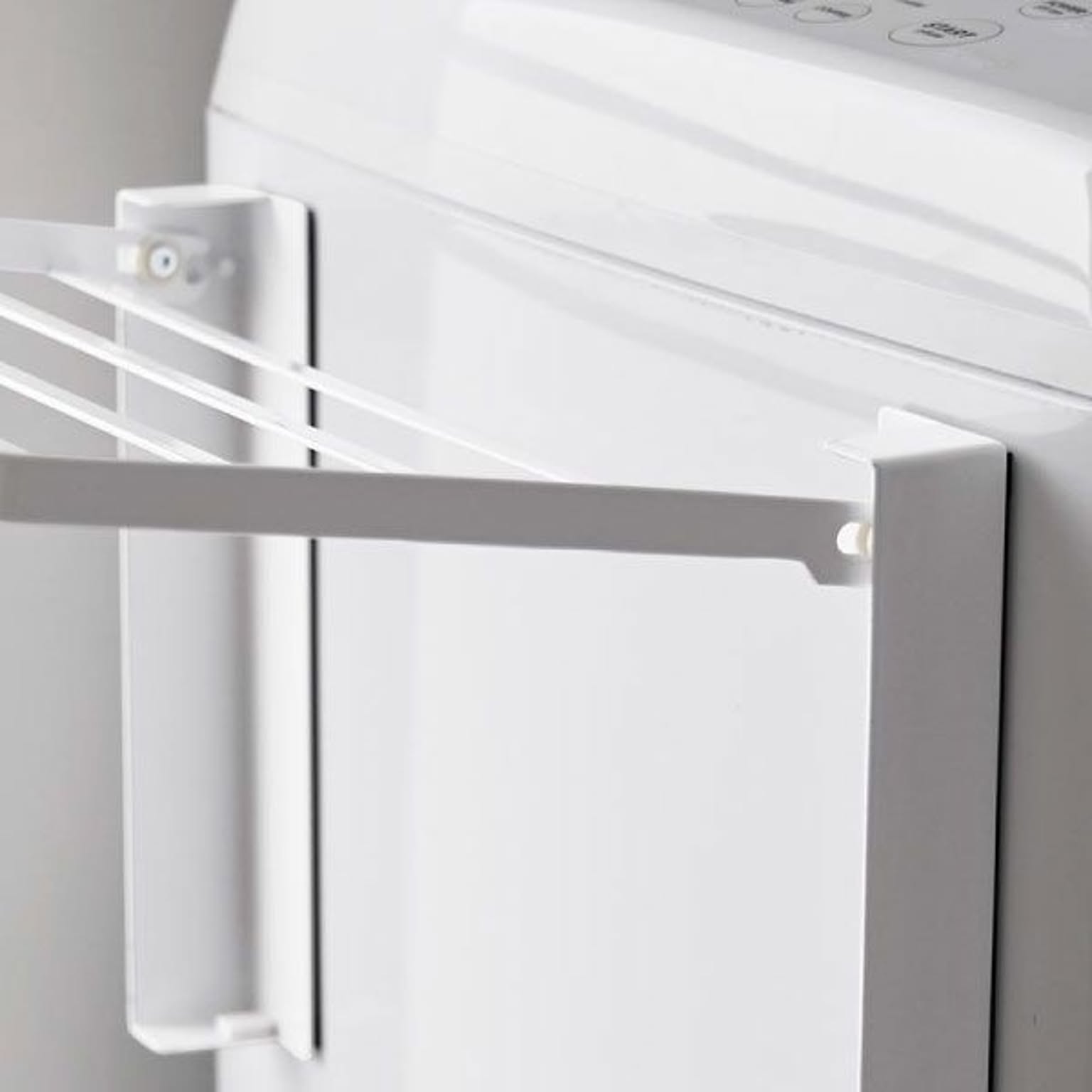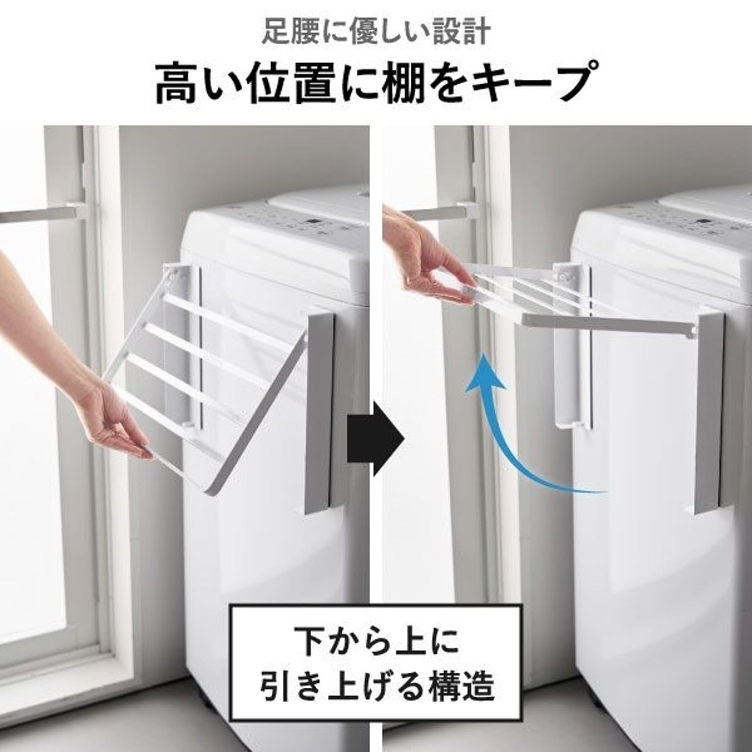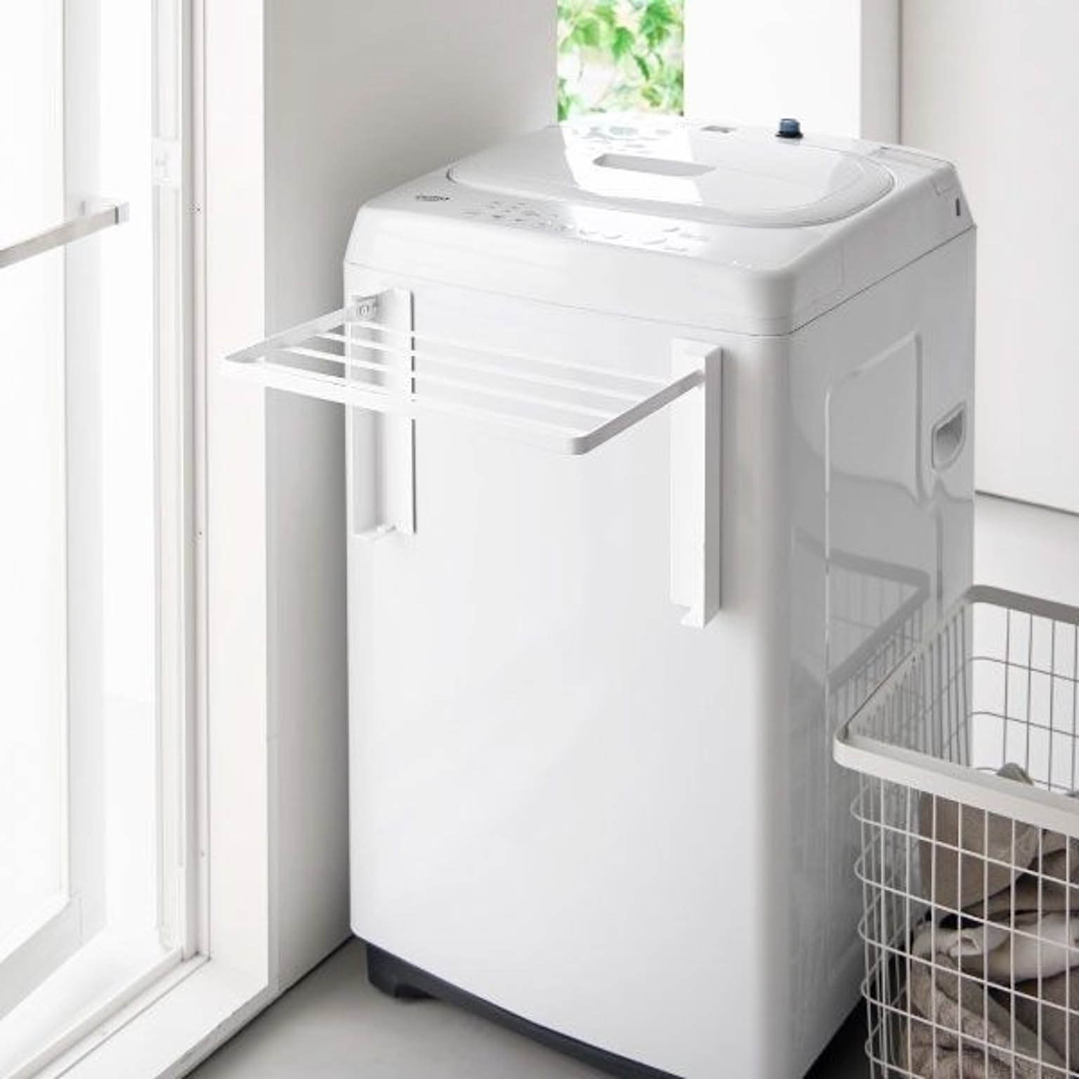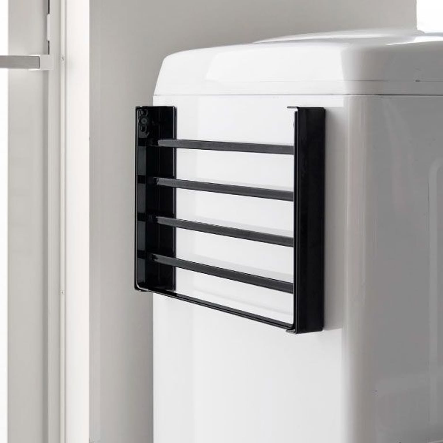 洗濯機にぴたっと貼って使える、タワーの洗濯機横マグネット折り畳み棚です。入浴後に使うタオルや着替えを一時置きする棚を、手軽に後付けできて便利。洗濯機横マグネット折り畳み棚の背面には、強力なマグネットが付いています。置き場に困っていたタオルや着替えを、浮かせて収納できるのはうれしいですね。こちらの洗濯機横マグネット折り畳み棚は、曲面に沿って可動するのが特徴です。丸みを帯びた洗濯機前面部分にも、しっかりと取り付けることができます。使い終わったら棚部分をコンパクトに収納できる折り畳み式で、通行の邪魔になりません。棚を下から上へと引き上げて使用するタイプなので、高い位置に棚をキープできます。左右にあるロックピンに引っ掛け部を差し込むことで、しっかりと棚を固定できます。洗濯機横マグネット折り畳み棚はスチール製なので、キズや汚れに強く、長く使えます。様々なインテリアに溶け込んでくれる、無駄のないシンプルなモノトーンデザイン。洗濯機横マグネット折り畳み棚の色は、ホワイトとブラックの2色からお選びいただけます。タワーの洗濯機横マグネット折り畳み棚を使って、暮らしをより快適に。