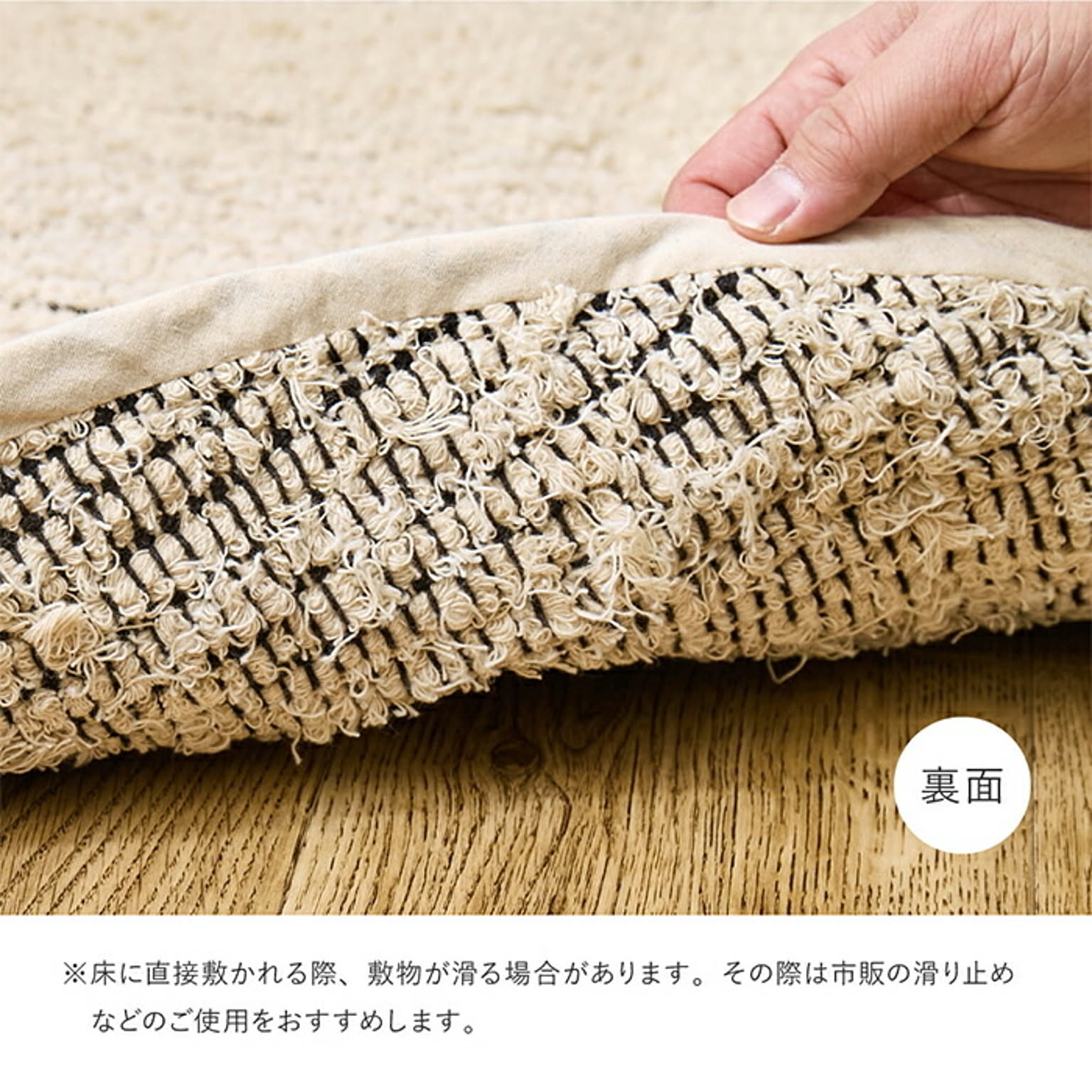 やわらかくさらっとしたタッチのインド綿ラグマット。『裂き織』と呼ばれる製法で、製品を作る際に残った生地の切れ端などの端材をアップサイクルした、サステナブルな1枚です。