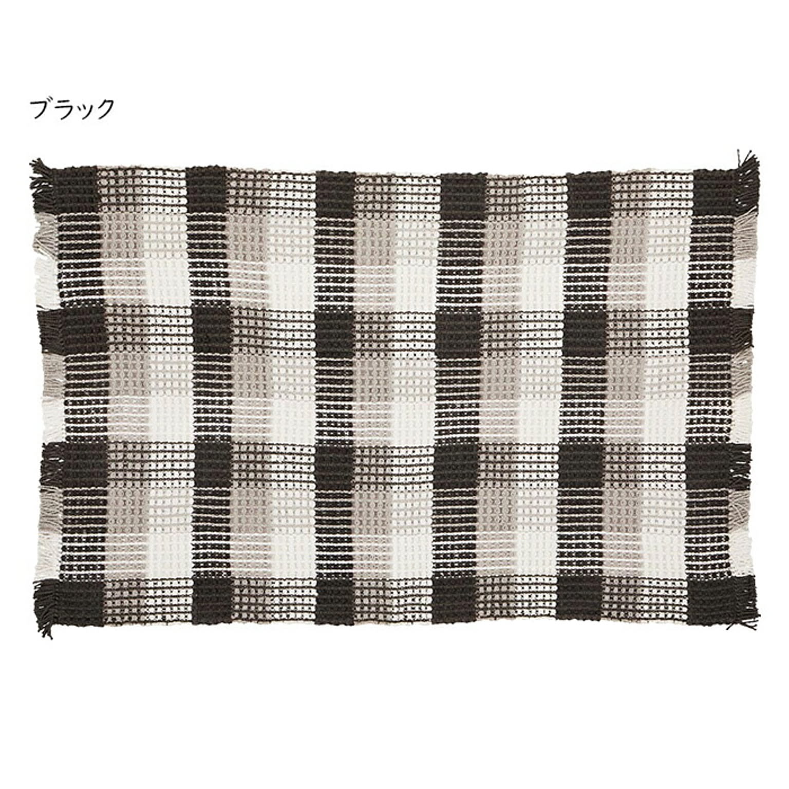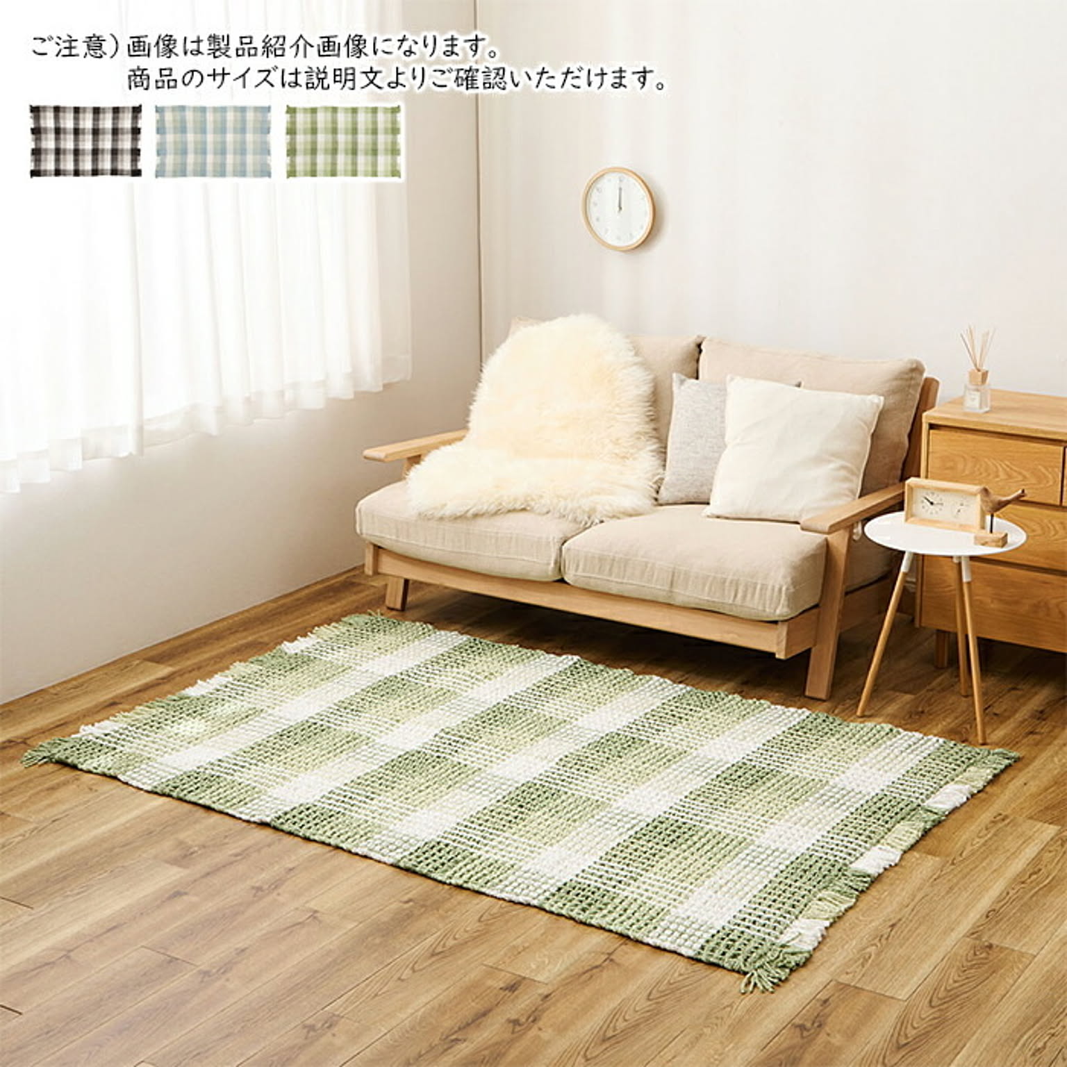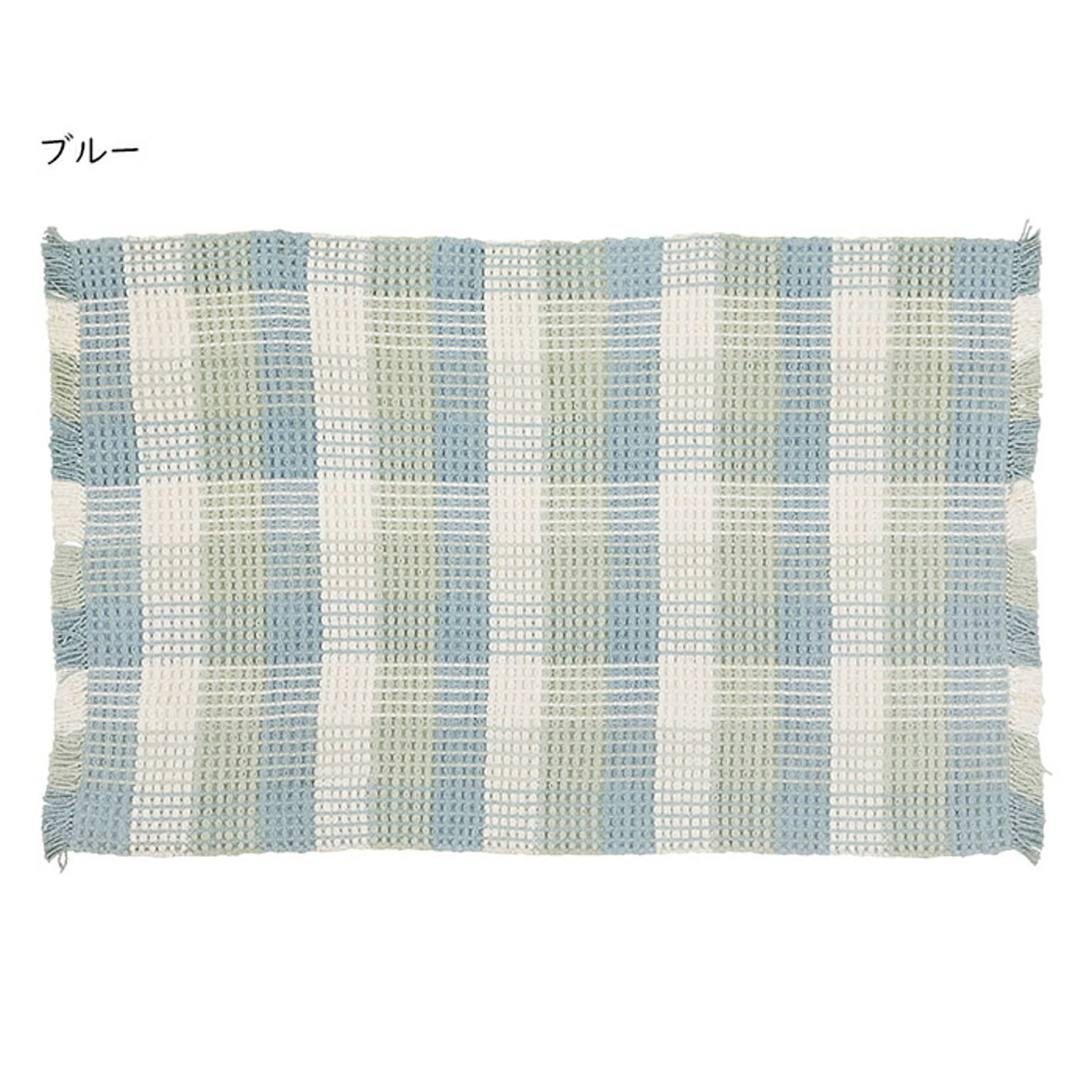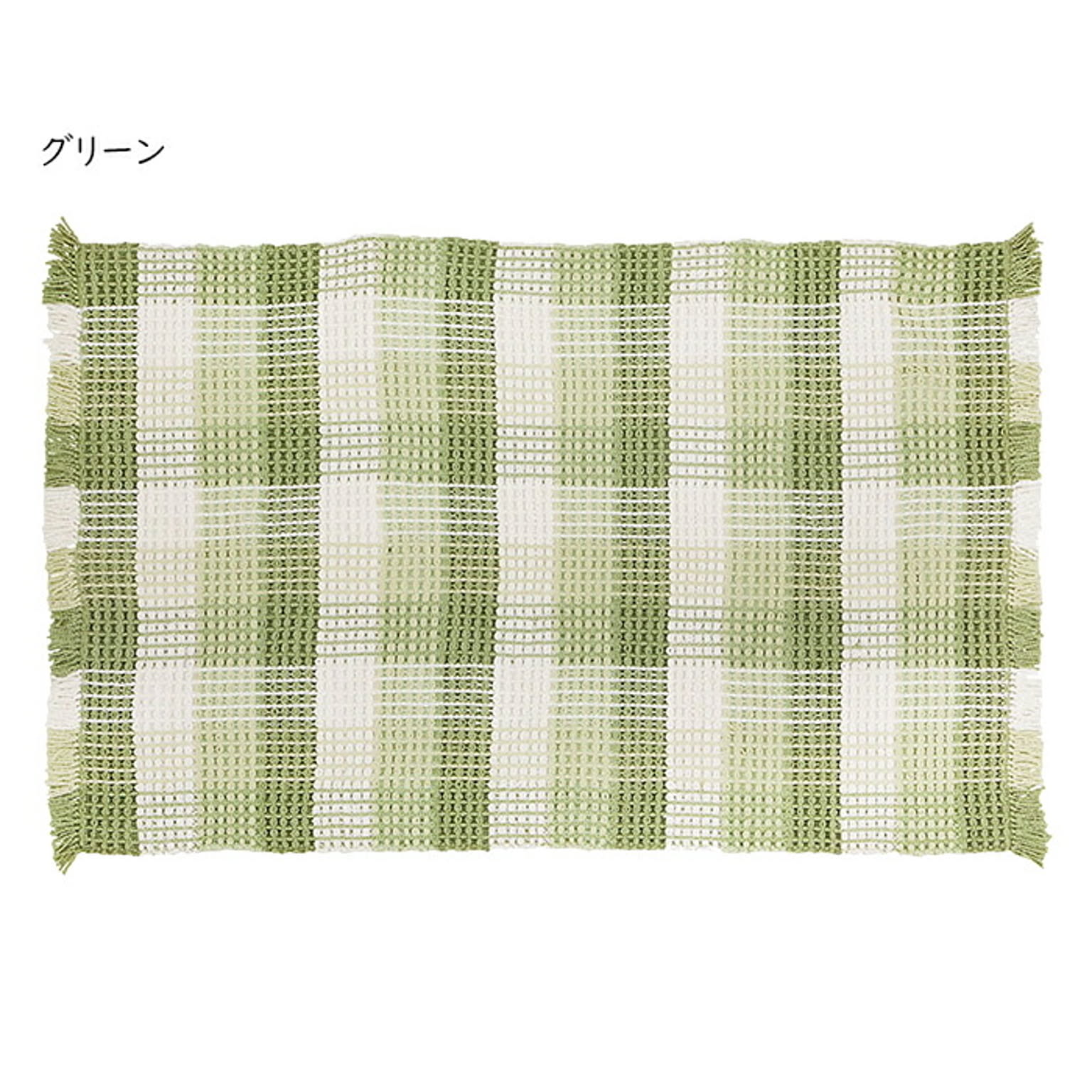 やわらかい糸を立体的に織り込んだワッフル風のぽこぽこ触感。コットンのサラッとしたタッチと、ポリエステルの乾きやすさ、ふたつの素材の特徴を活かした使いやすいラグマットです。汚れたら洗濯機で洗えるのも嬉しいポイント。さわやかなギンガムチェックのデザインで、インテリアのアクセントにぴったりなアイテムです。