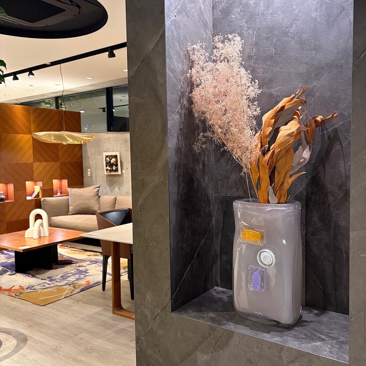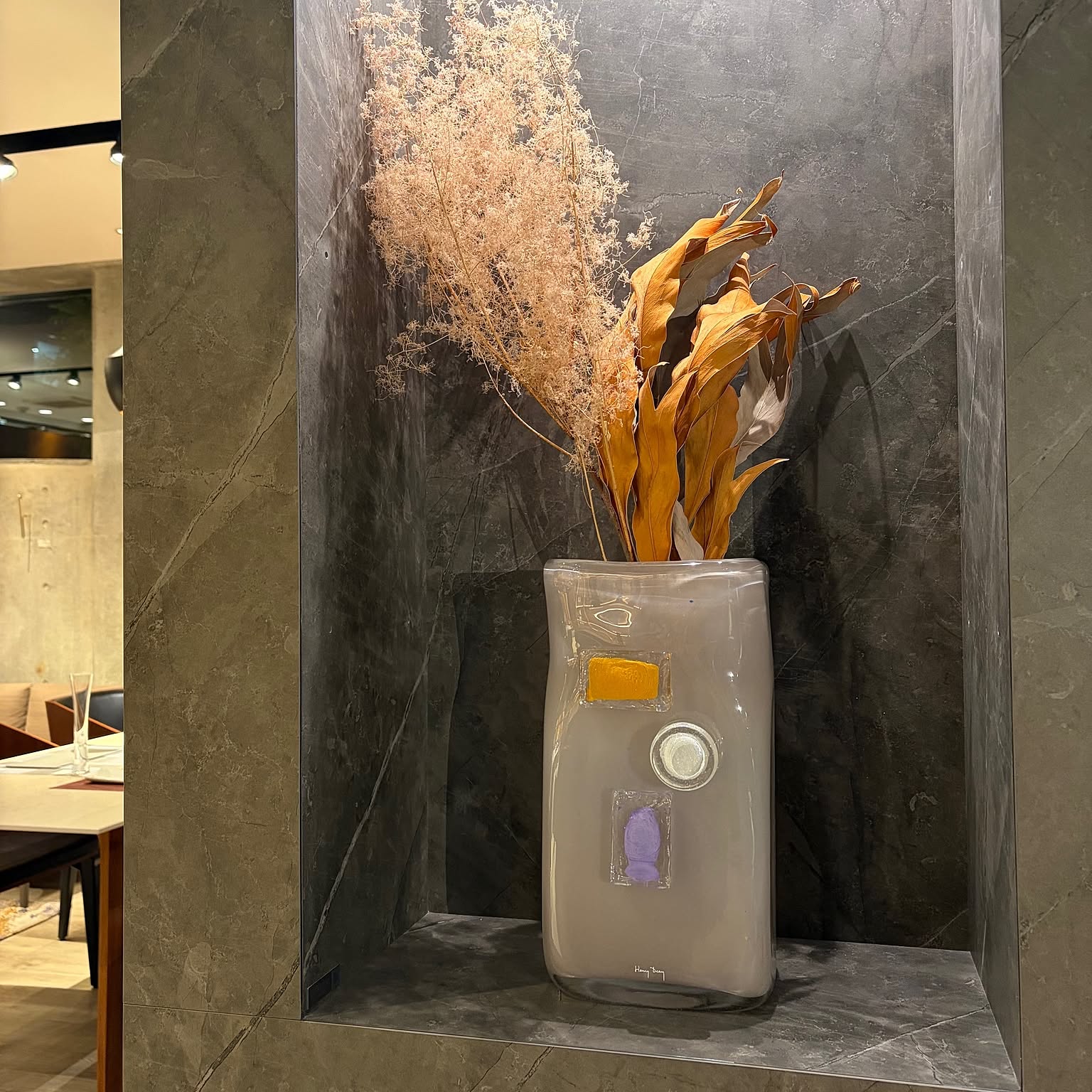 四角いフラワーベースをキャンバスに見立て、そこに長方形や丸い飾りを装飾することで絵画を表現しています。