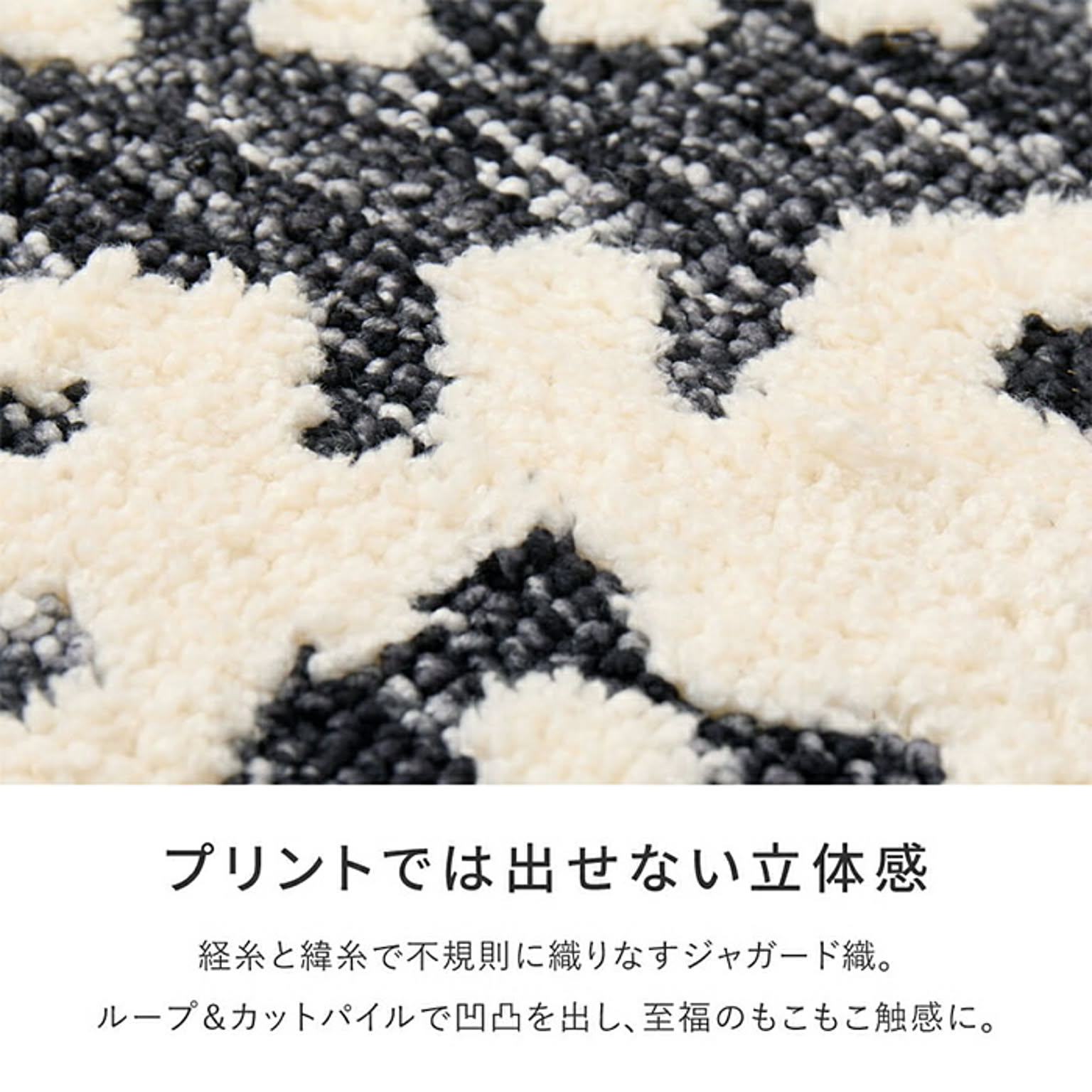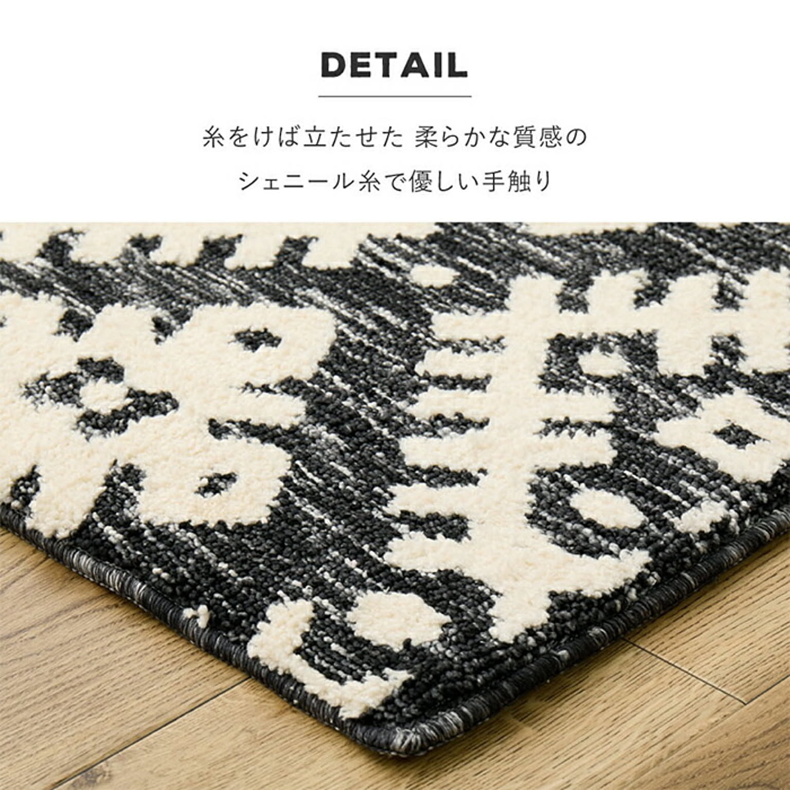 糸を毛羽立たせ柔らかな質感に仕上げたシェニール糸を使い、ジャガード織で繊細な模様を美しく表現した高級感のある一枚。意外と少ないモノトーンの柄デザインで、単調になりがちな空間にほどよく個性をプラス。ウレタン入りのふっくらほどよいクッション性で踏み心地が良く、裏面には滑り止め付きでズレにくく安心。掃除機もかけやすく、毛足が短いためゴミが溜まりにくいから日々のお手入れが簡単なのも嬉しいポイントです。