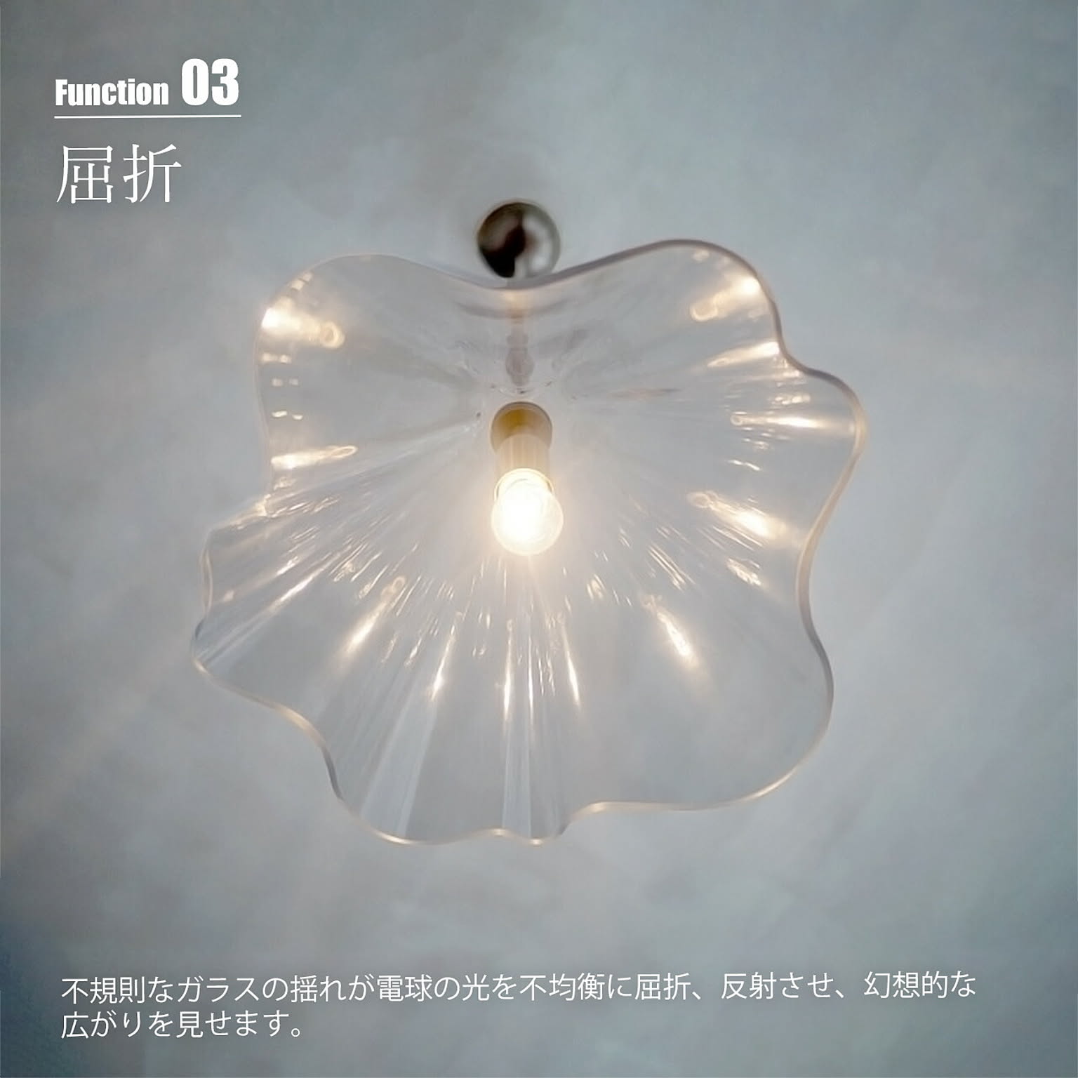 北極の空に揺らめくオーロラを映した、ガラスのペンダントライト。光を受けたガラスが澄んだきらめきを纏い、風になびくカーテンのように有機的な曲線が、詩情あふれる美しい風景をもたらします。点灯時と消灯時、見る角度によっても表情を変える、見るに飽きないペンダント。