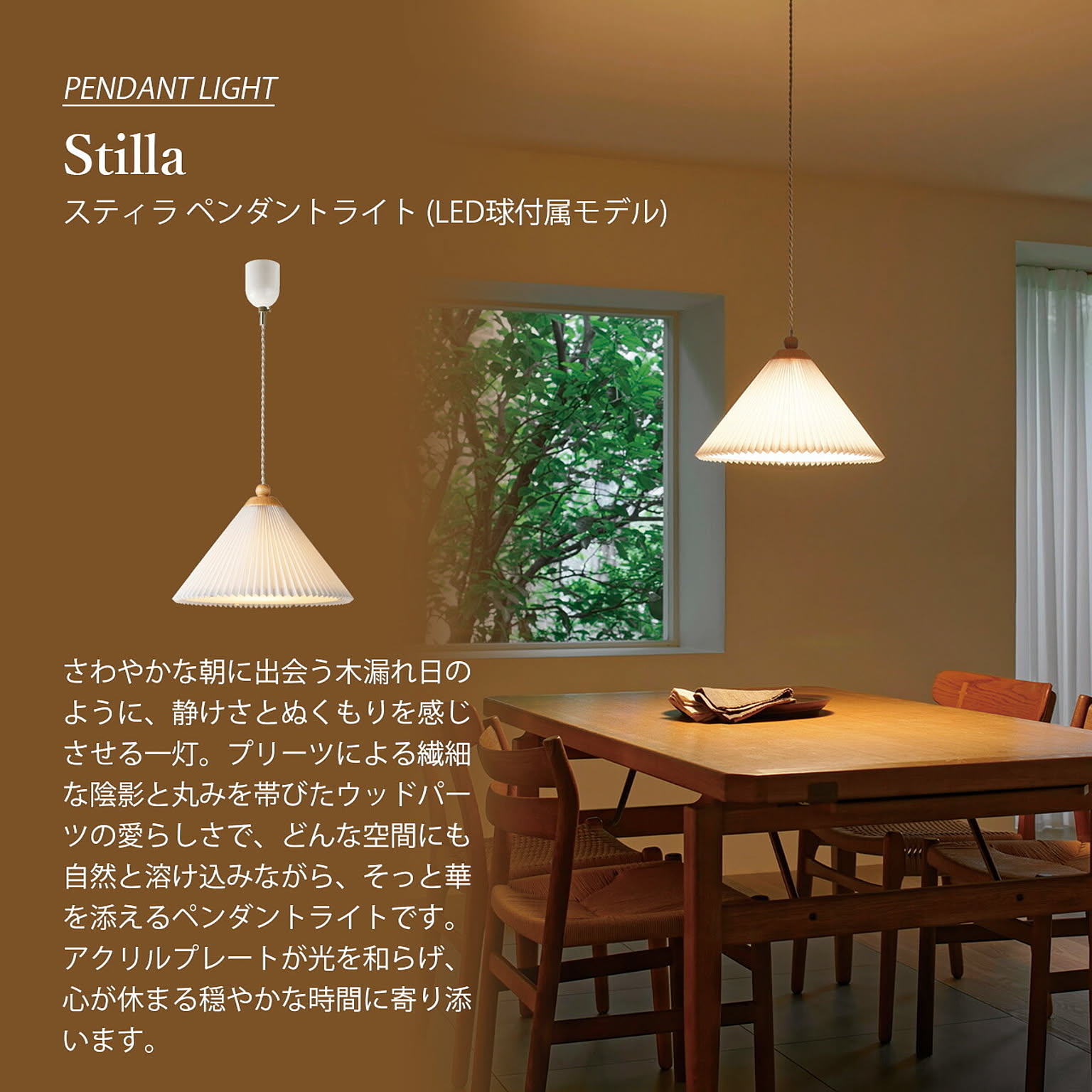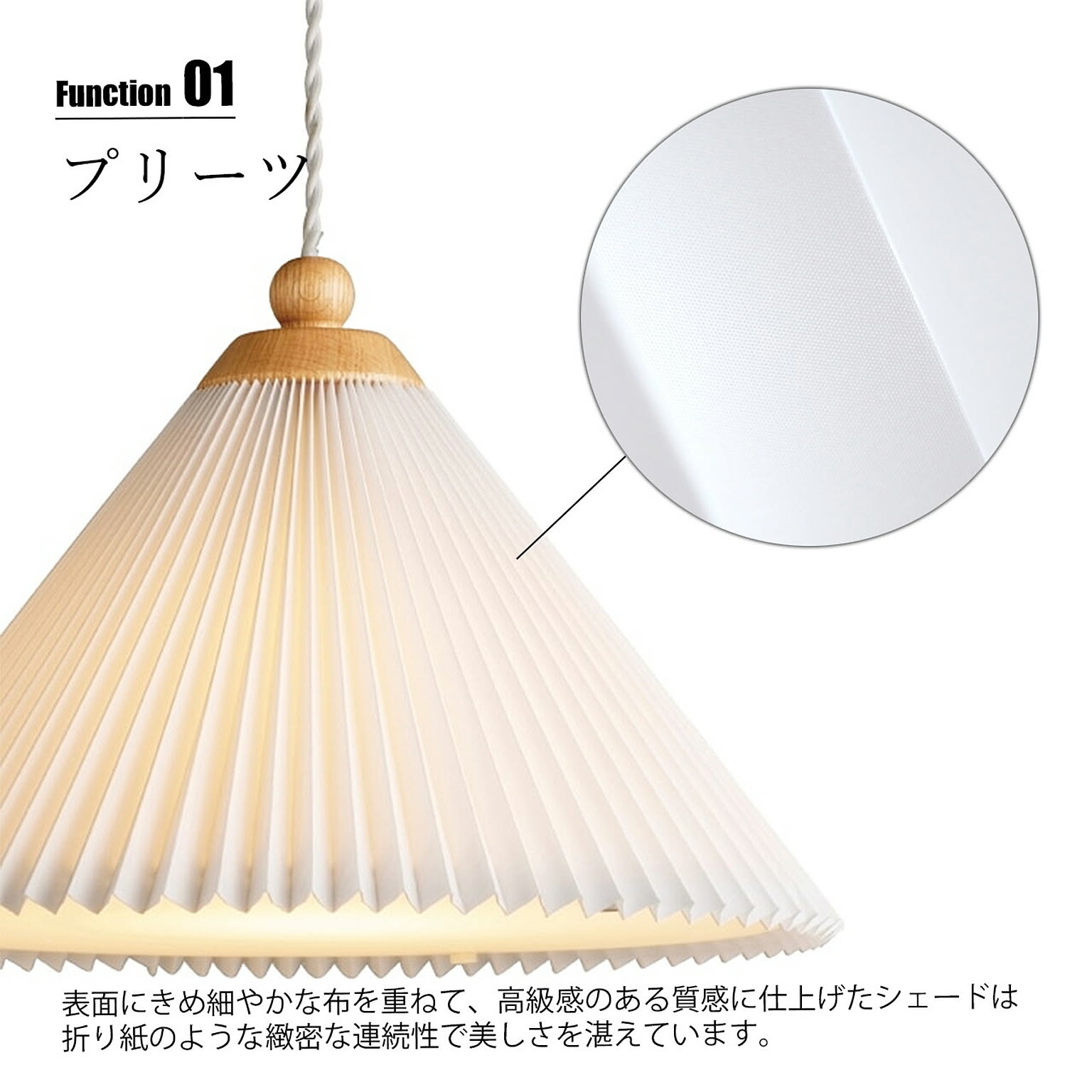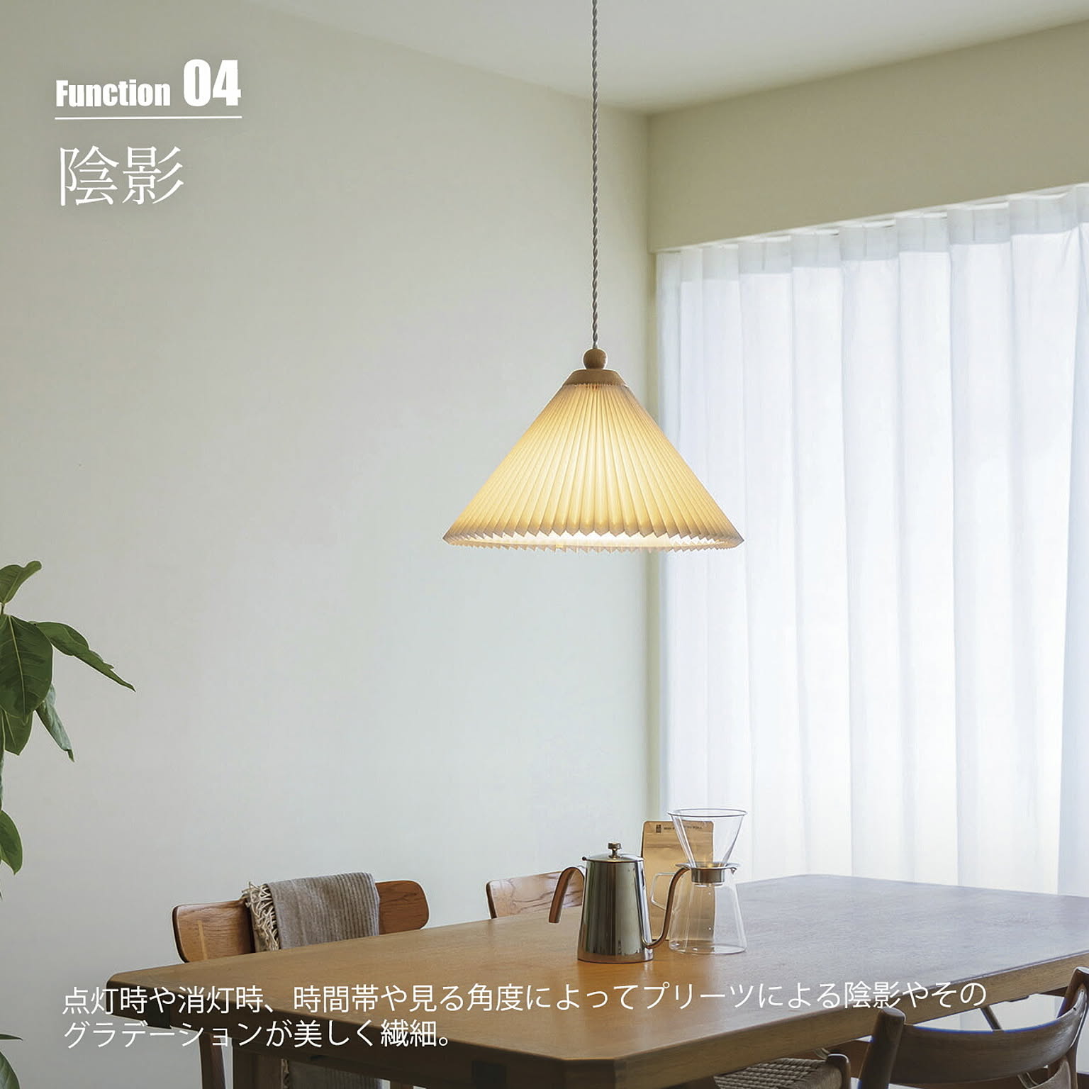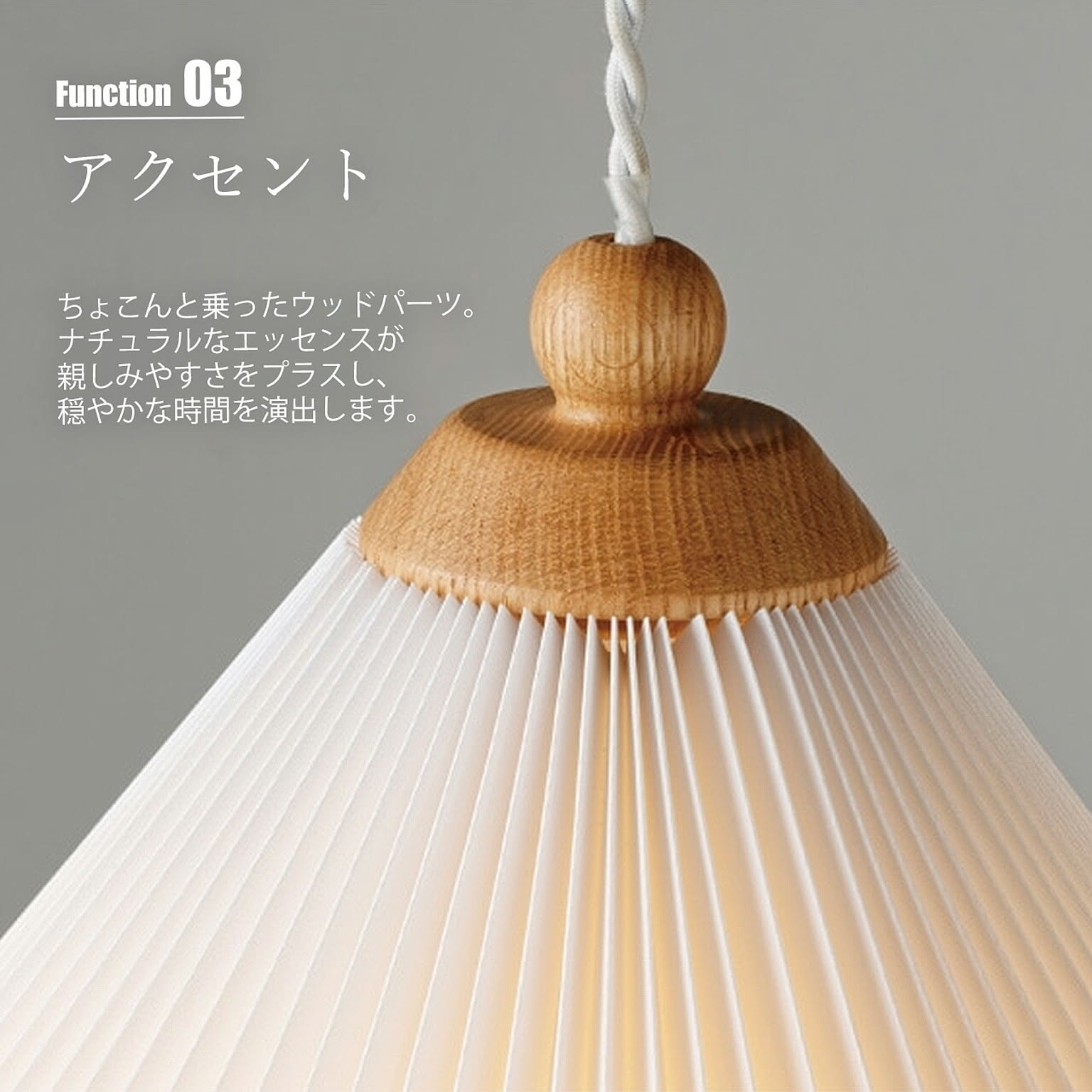 さわやかな朝に出会う木漏れ日のように、静けさとぬくもりを感じさせる一灯。プリーツによる繊細な陰影と丸みを帯びたウッドパーツの愛らしさで、どんな空間にも自然と溶け込みながら、そっと華を添えるペンダントライトです。アクリルプレートが光を和らげ、心が休まる穏やかな時間に寄り添います。