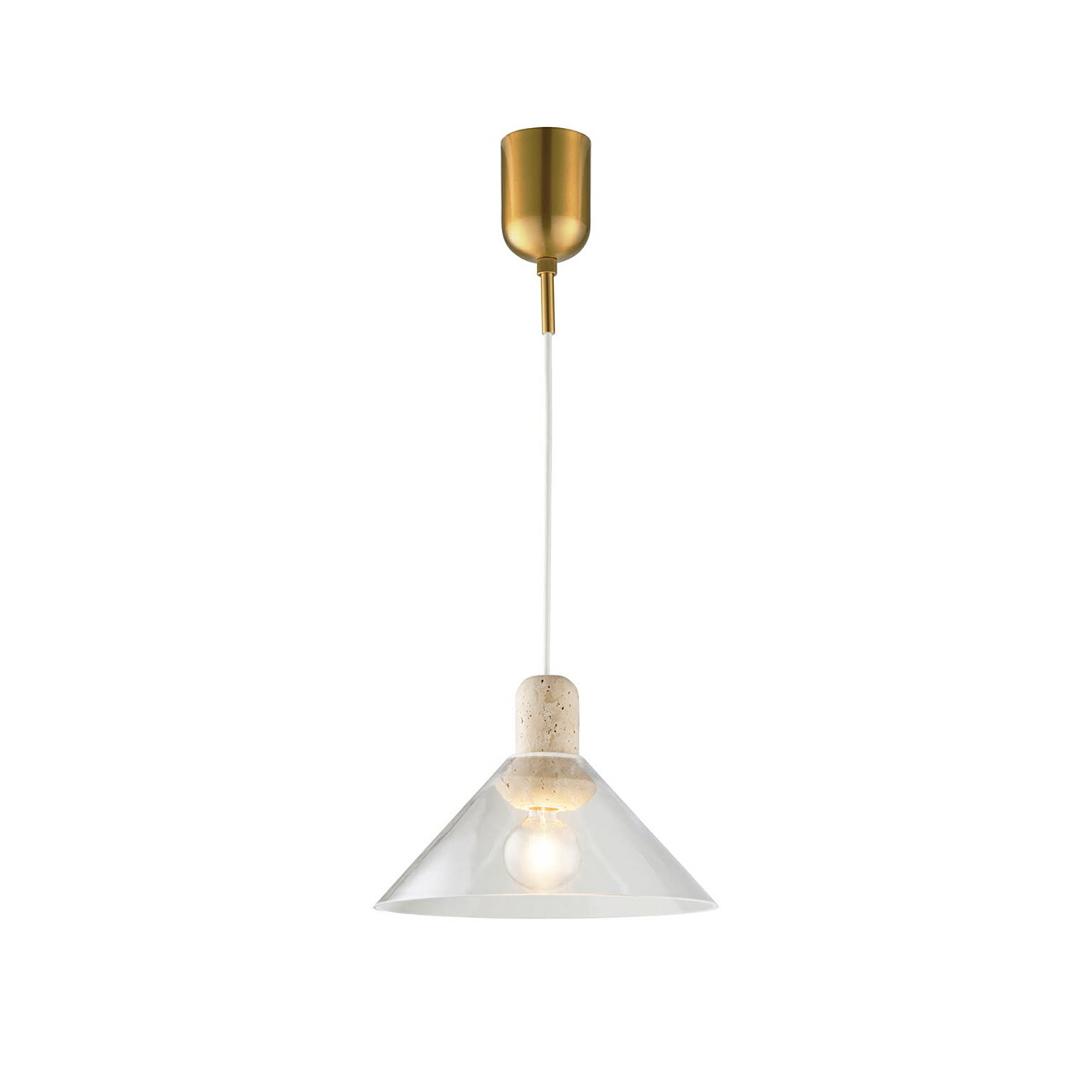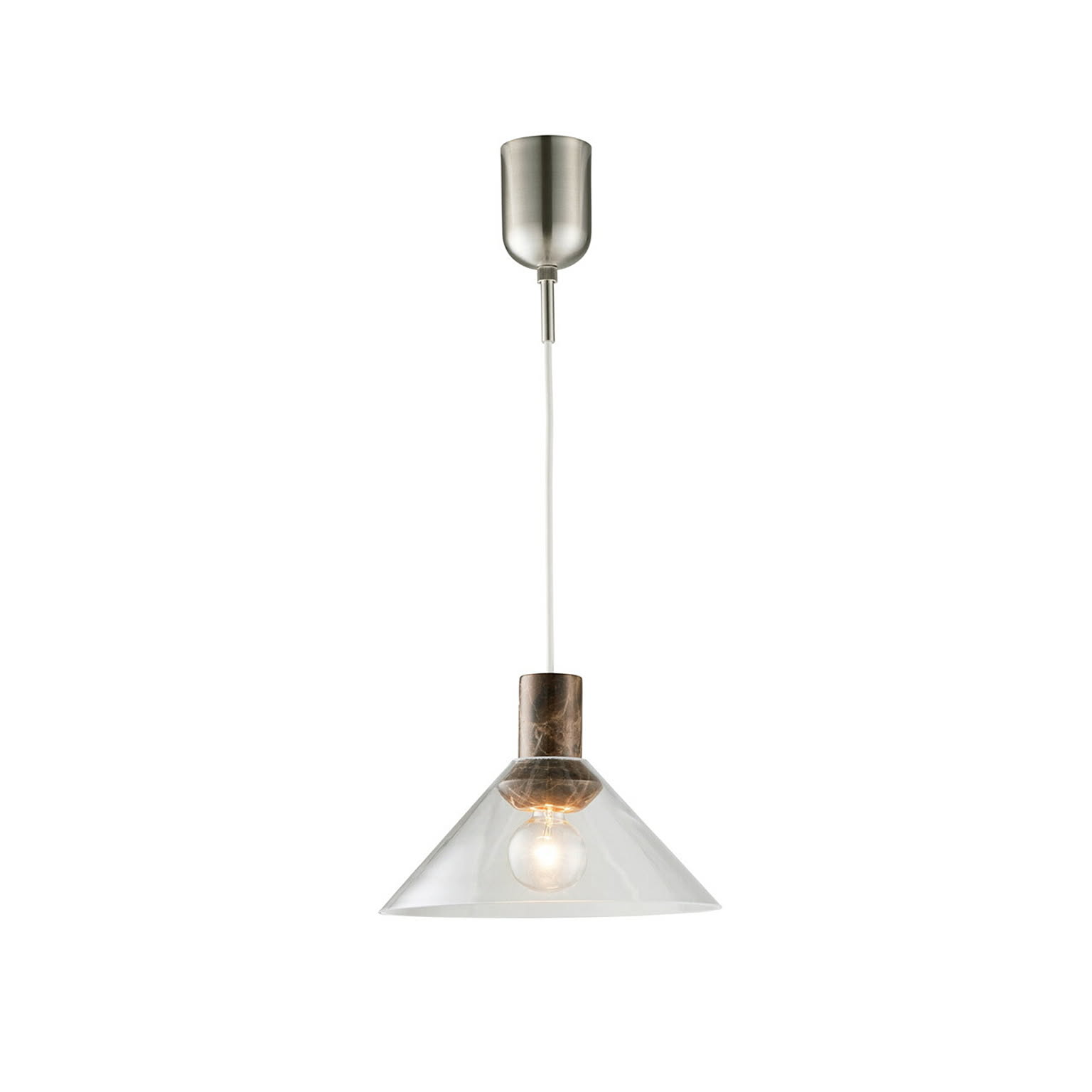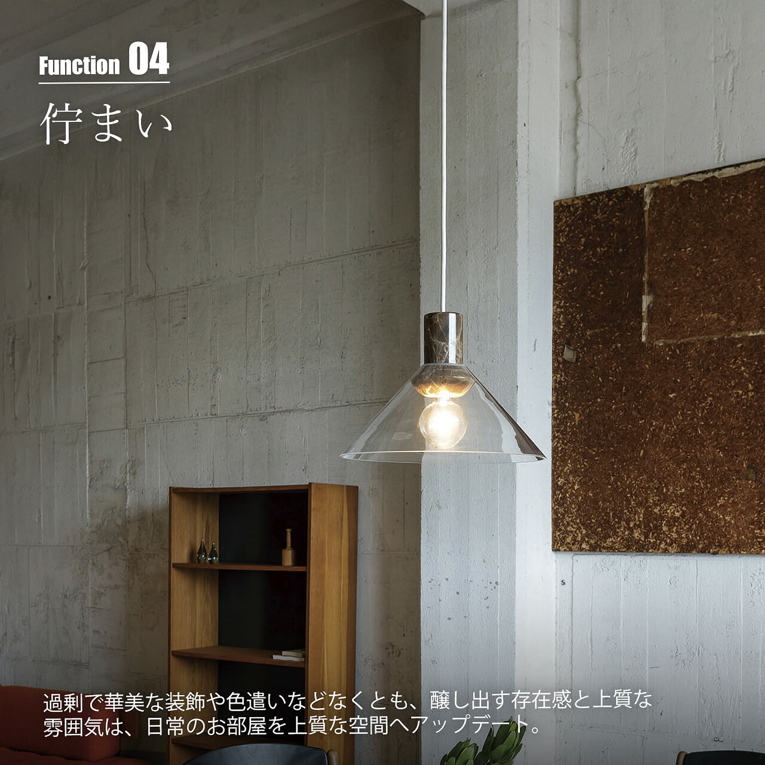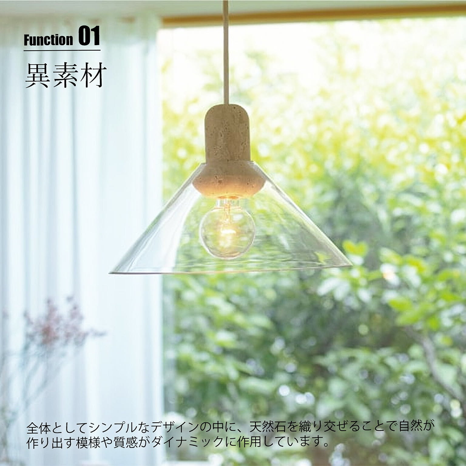 空間に凛とした存在感をもたらす、上質なペンダントライト。透明なガラスの中に、異素材の大理石をそっと収めた構造は、浮遊感と重厚感が美しく共存しています。ソケットやネジといった機構はあえて見せず、素材そのものの美しさを際立たせるミニマルな仕立てに。