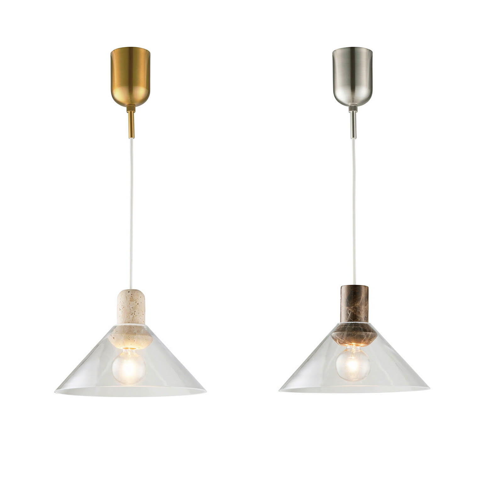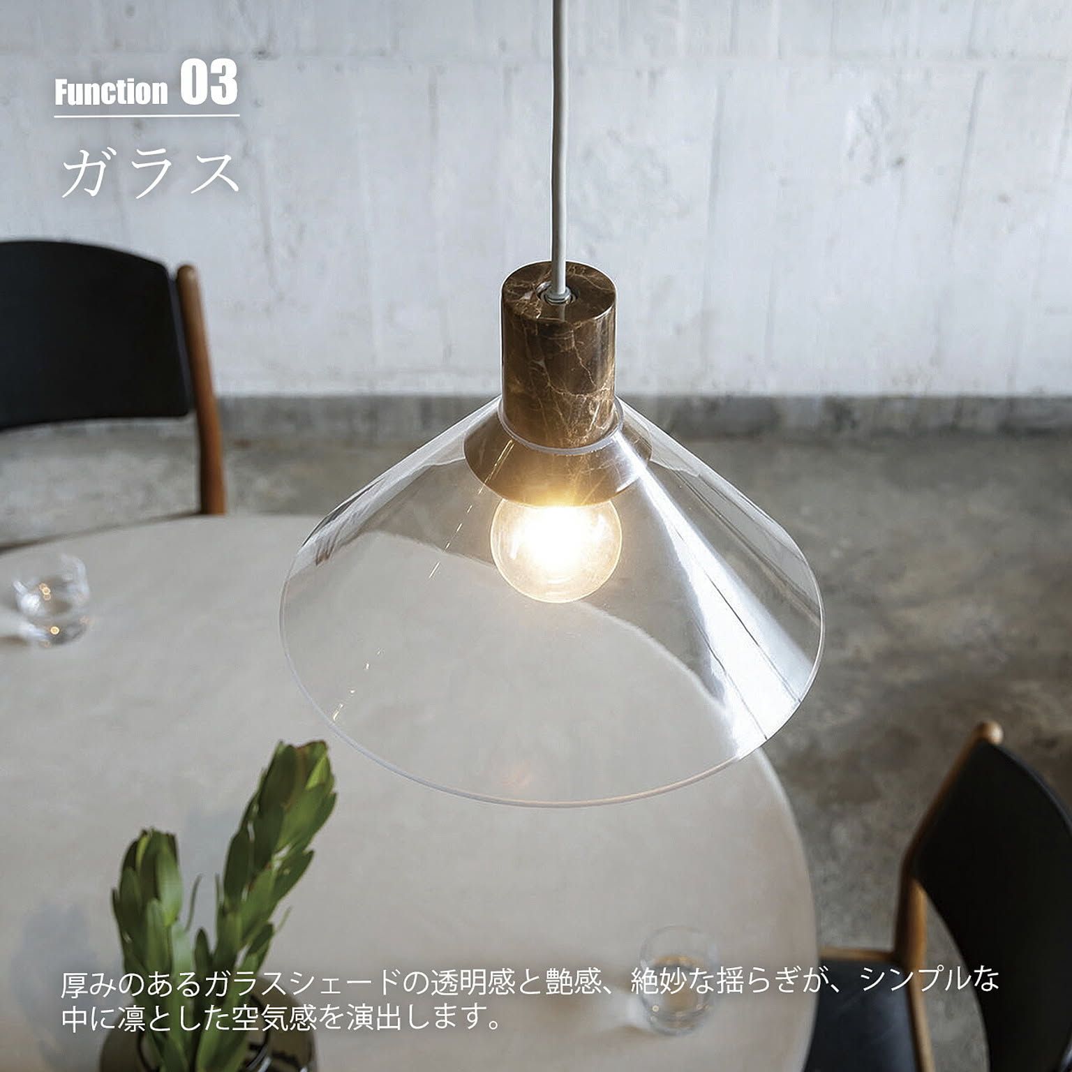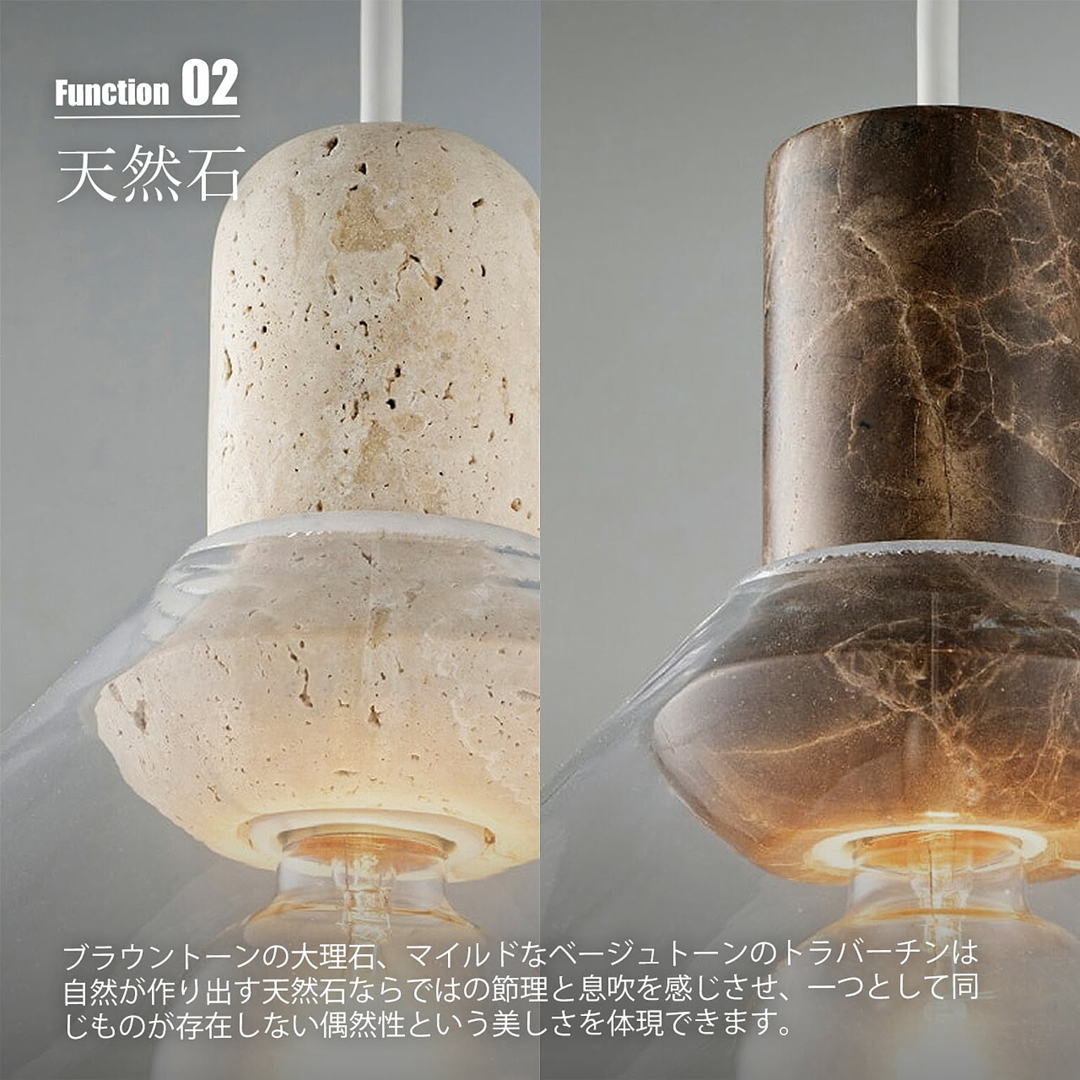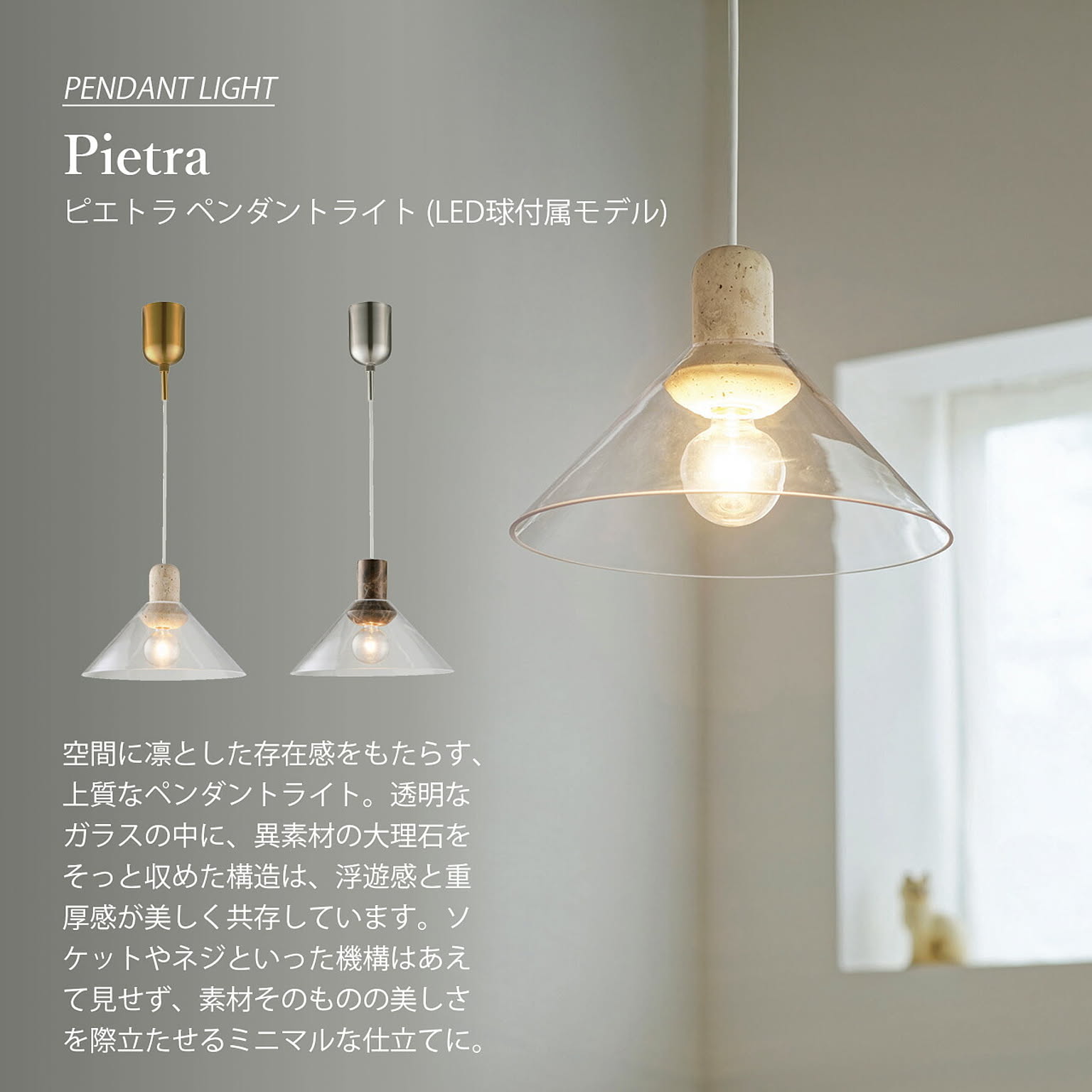 空間に凛とした存在感をもたらす、上質なペンダントライト。透明なガラスの中に、異素材の大理石をそっと収めた構造は、浮遊感と重厚感が美しく共存しています。ソケットやネジといった機構はあえて見せず、素材そのものの美しさを際立たせるミニマルな仕立てに。