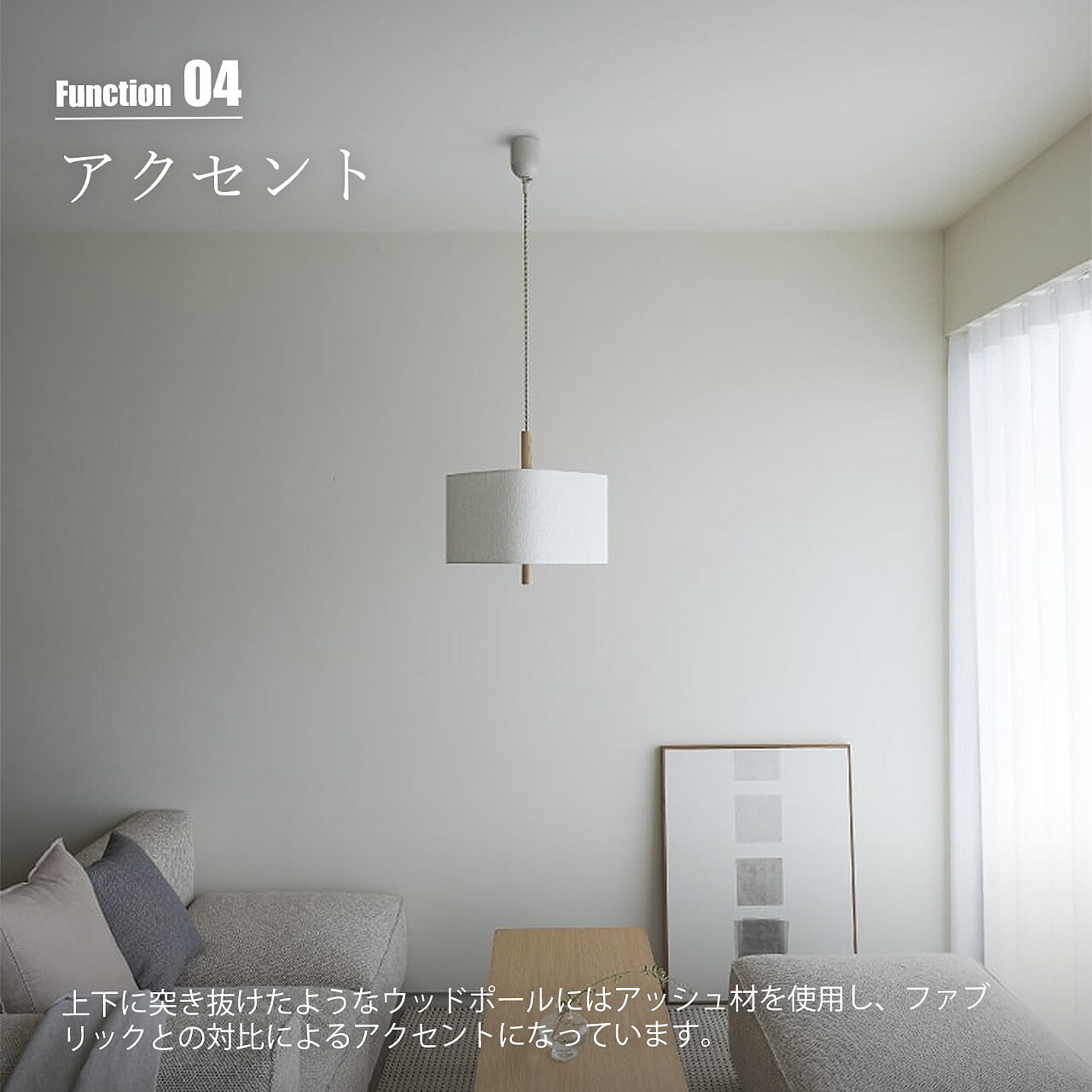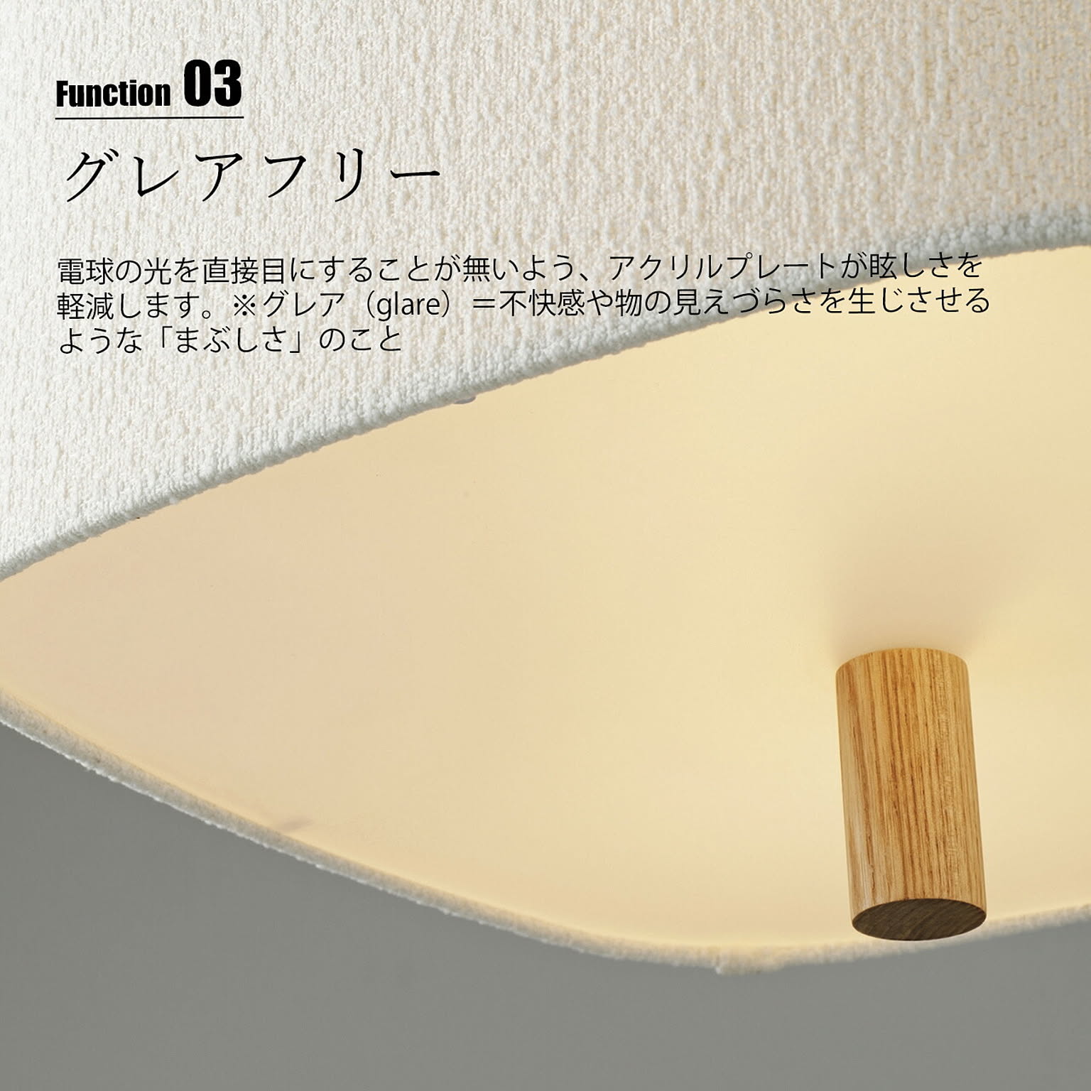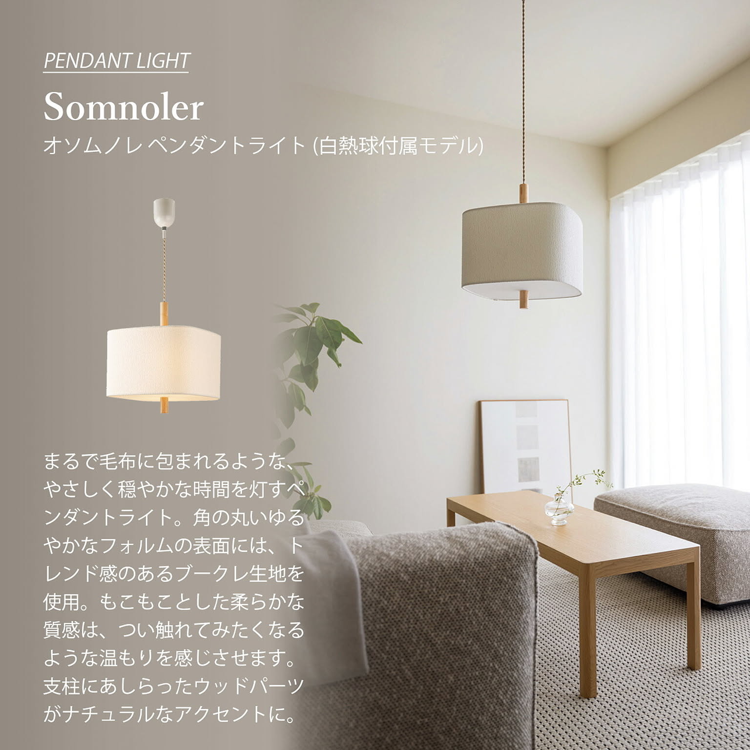 まるで毛布に包まれるような、やさしく穏やかな時間を灯すペンダントライト。角の丸いゆるやかなフォルムの表面には、トレンド感のあるブークレ生地を使用。もこもことした柔らかな質感は、つい触れてみたくなるような温もりを感じさせます。支柱にあしらったウッドパーツがナチュラルなアクセントに。