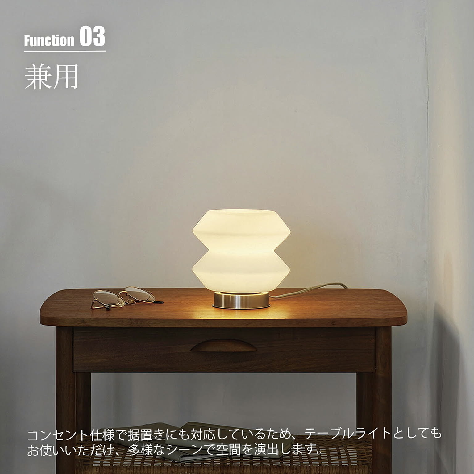 幾何学的なフォルムのセードは、シンプルさの中にデザイン性を宿し、空間にさりげない個性を与えます。ブラケットライトとしてだけでなく、テーブルライトとしても使うことができ、暮らしに寄り添う柔軟さも魅力です。見る角度で印象が変わる立体感や、フロストガラスが放つやわらかな光が、心に奥行きをもたらします。書斎に、ベッドサイドにそっと置くだけで、お気に入りの場所が生まれるミニマルな照明です。