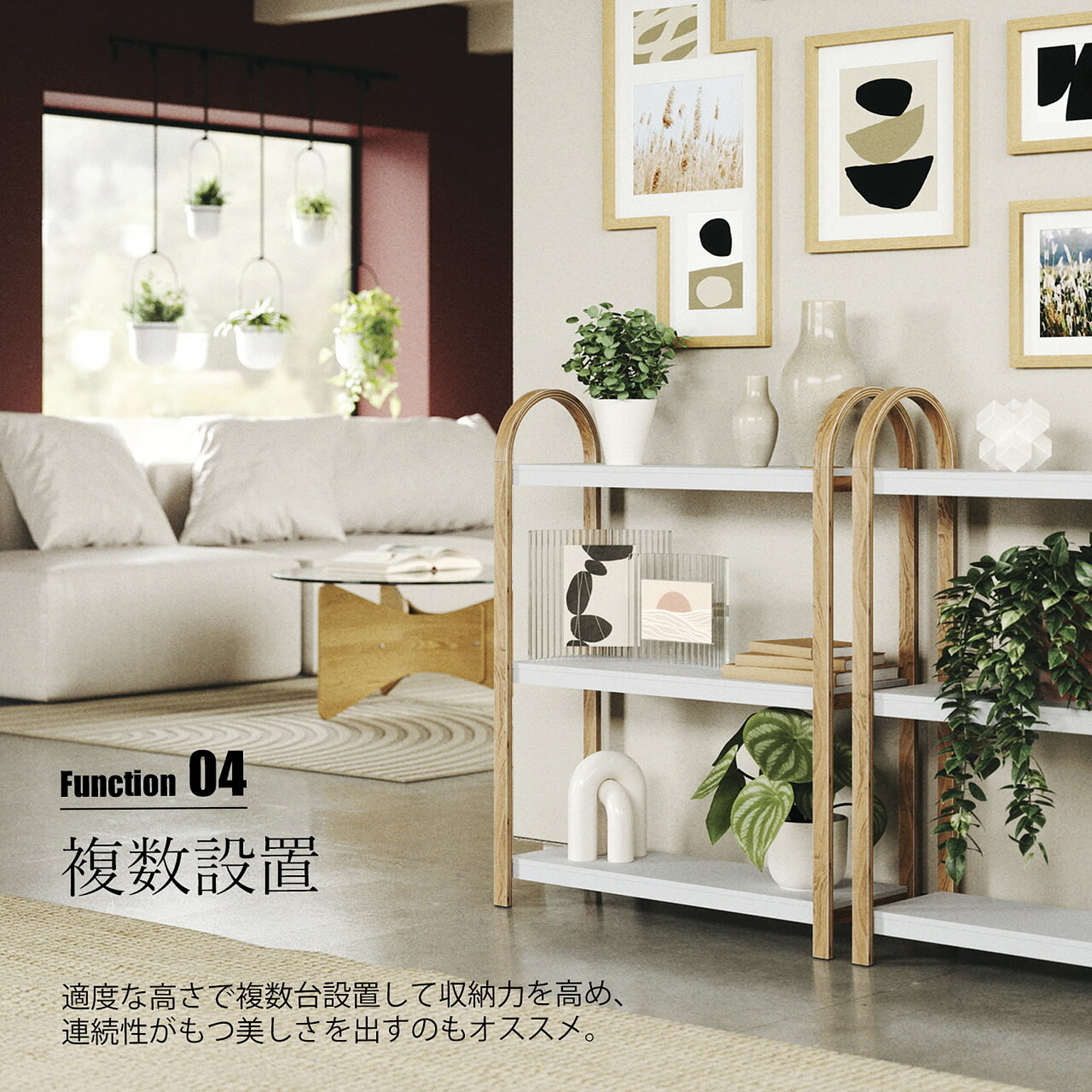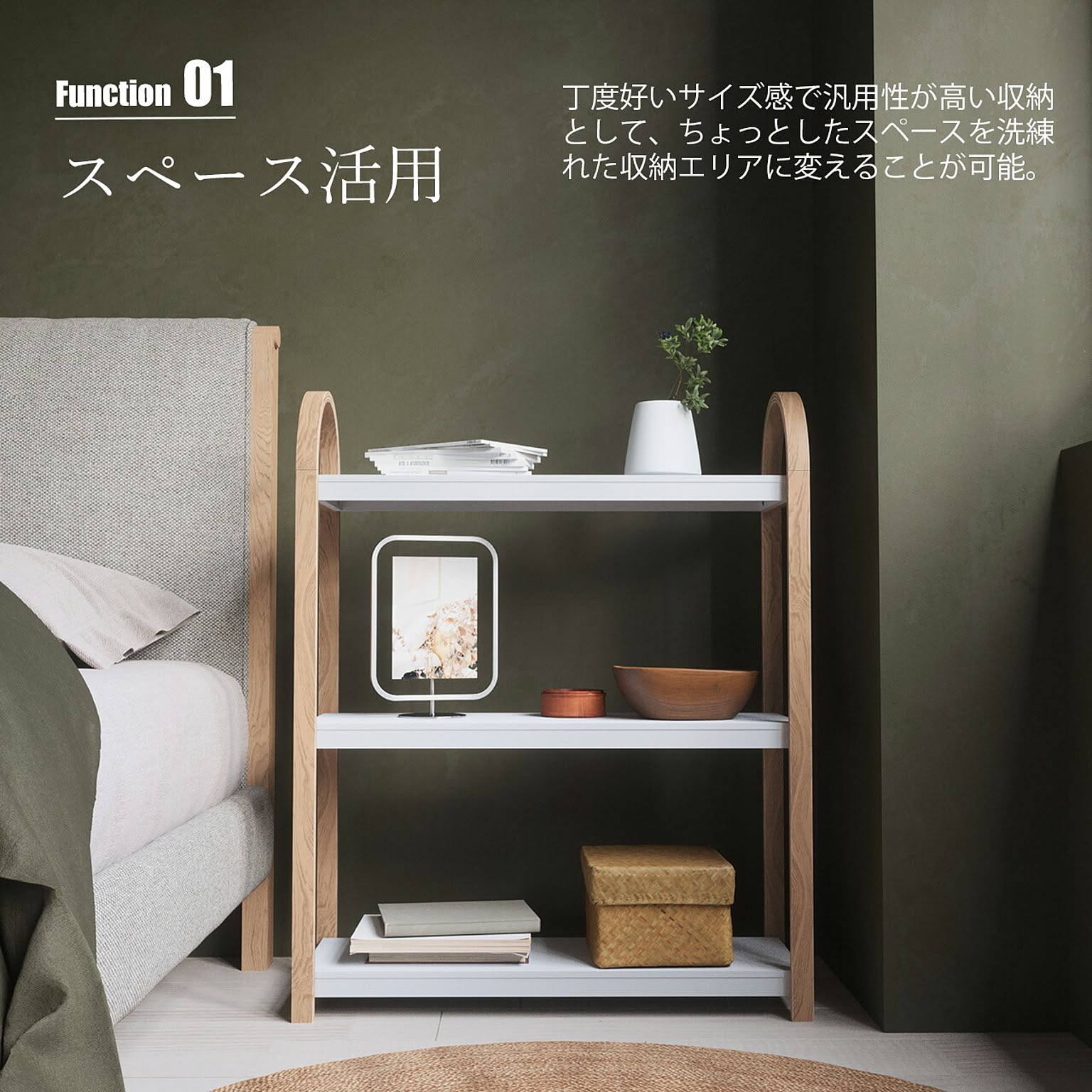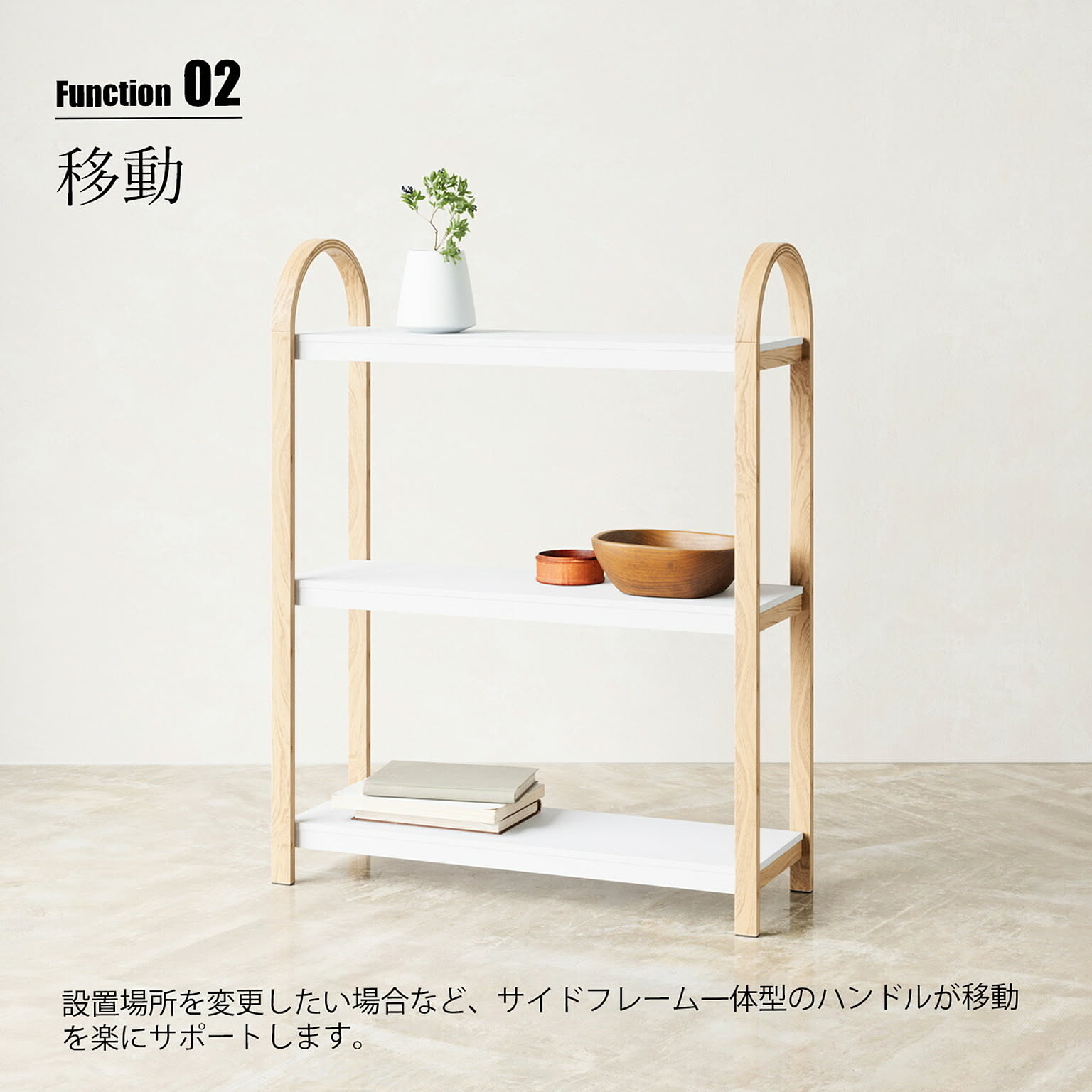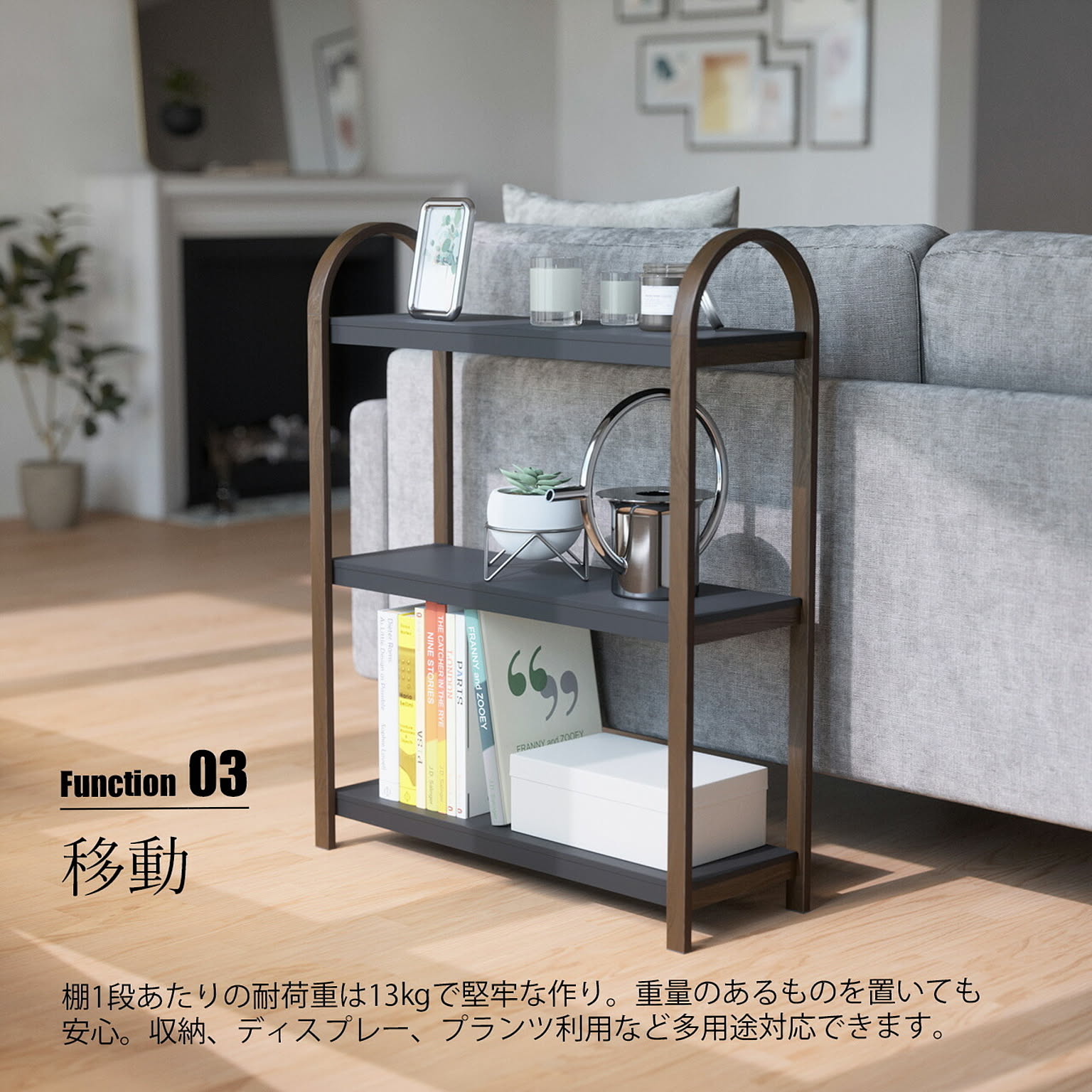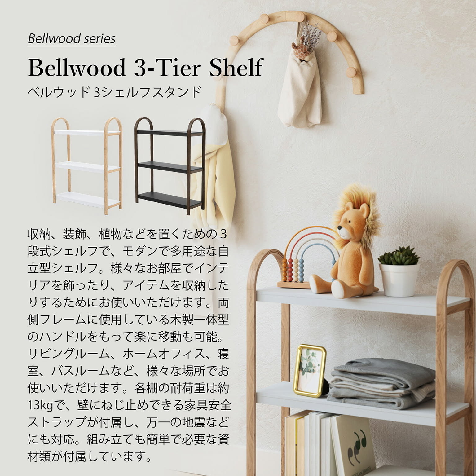 収納、装飾、植物などを置くための3段式シェルフで、モダンで多用途な自立型シェルフ。様々なお部屋でインテリアを飾ったり、アイテムを収納したりするためにお使いいただけます。両側フレームに使用している木製一体型のハンドルをもって楽に移動も可能。リビングルーム、ホームオフィス、寝室、バスルームなど、様々な場所でお使いいただけます。各棚の耐荷重は約13kgで、壁にねじ止めできる家具安全ストラップが付属し、万一の地震などにも対応。組み立ても簡単で必要な資材類が付属しています。