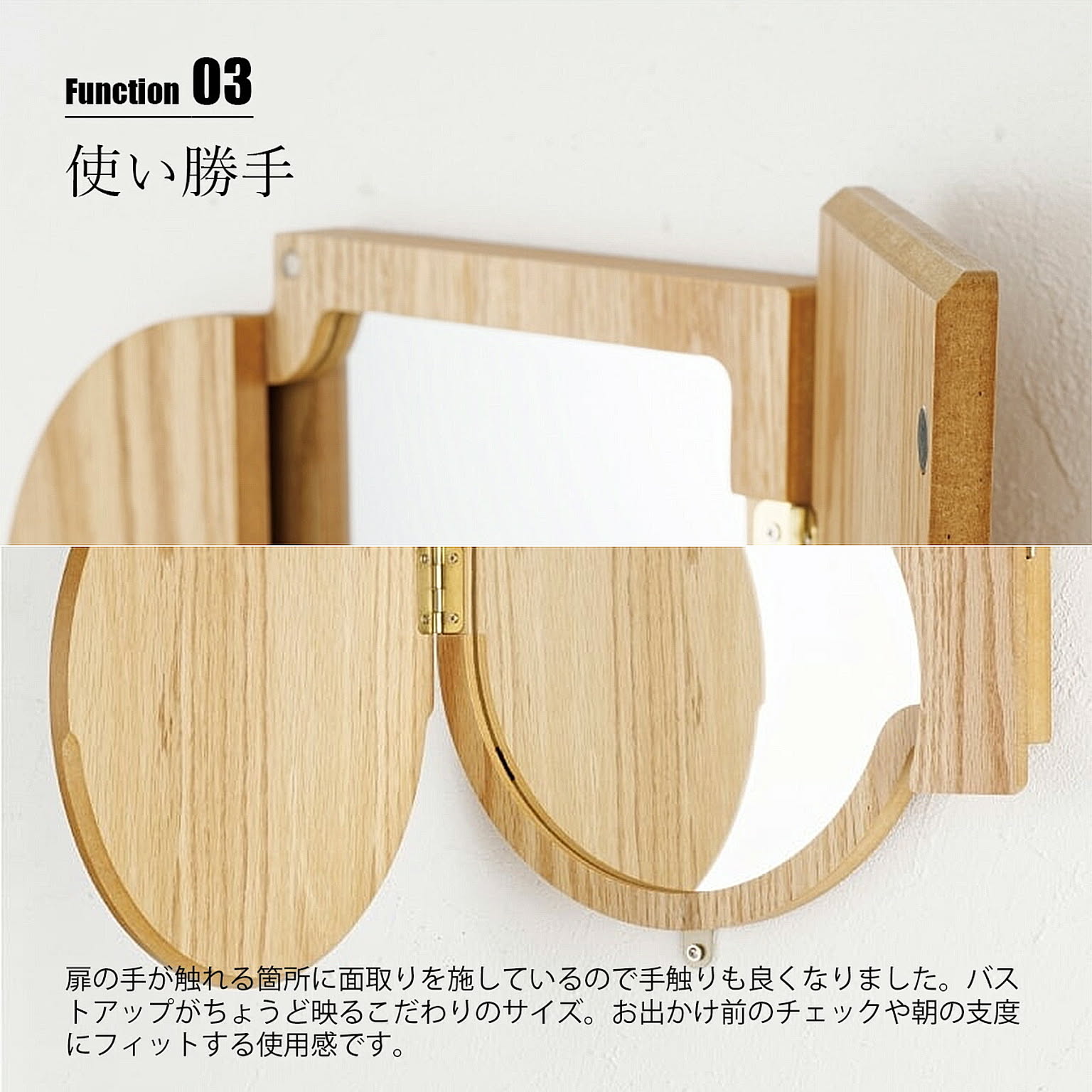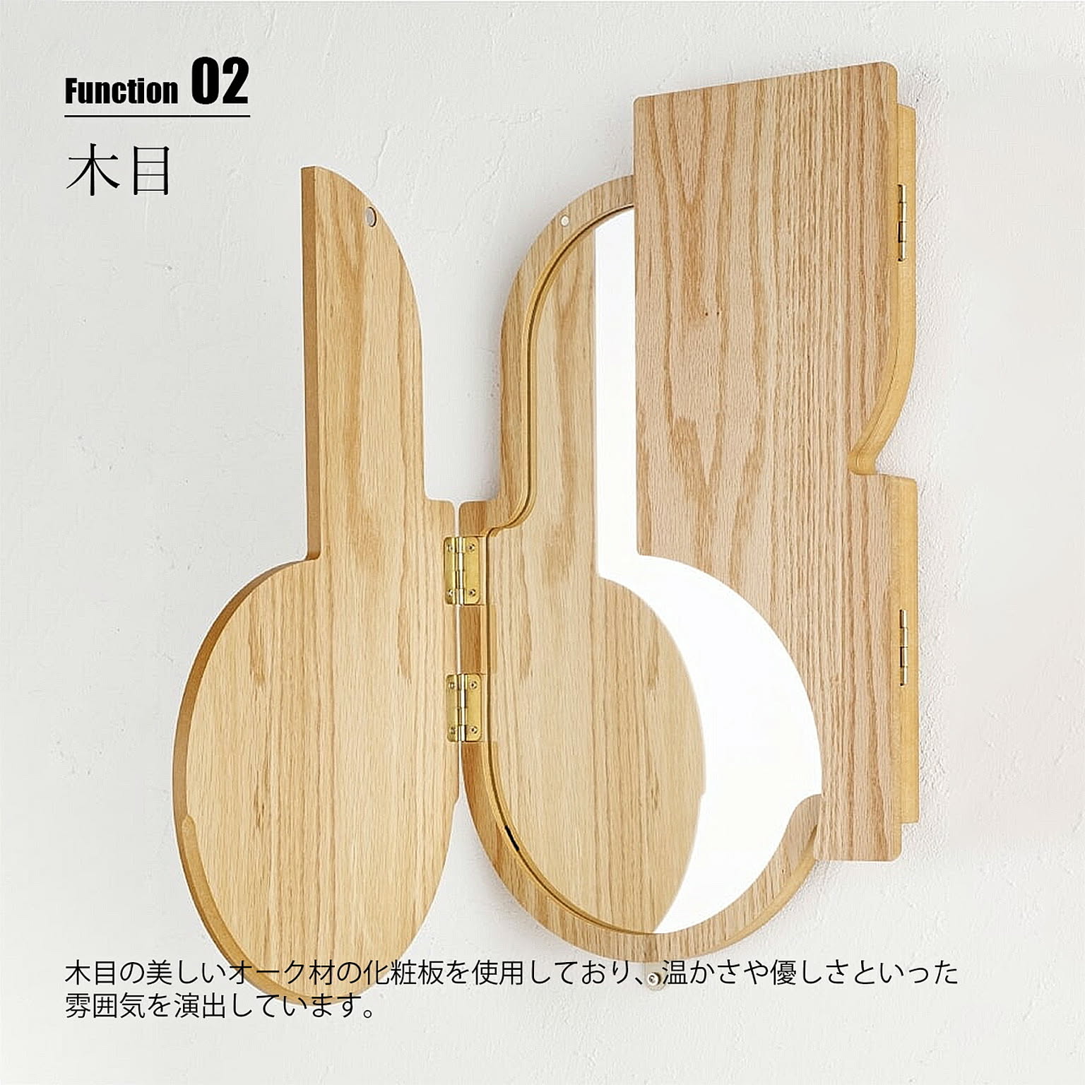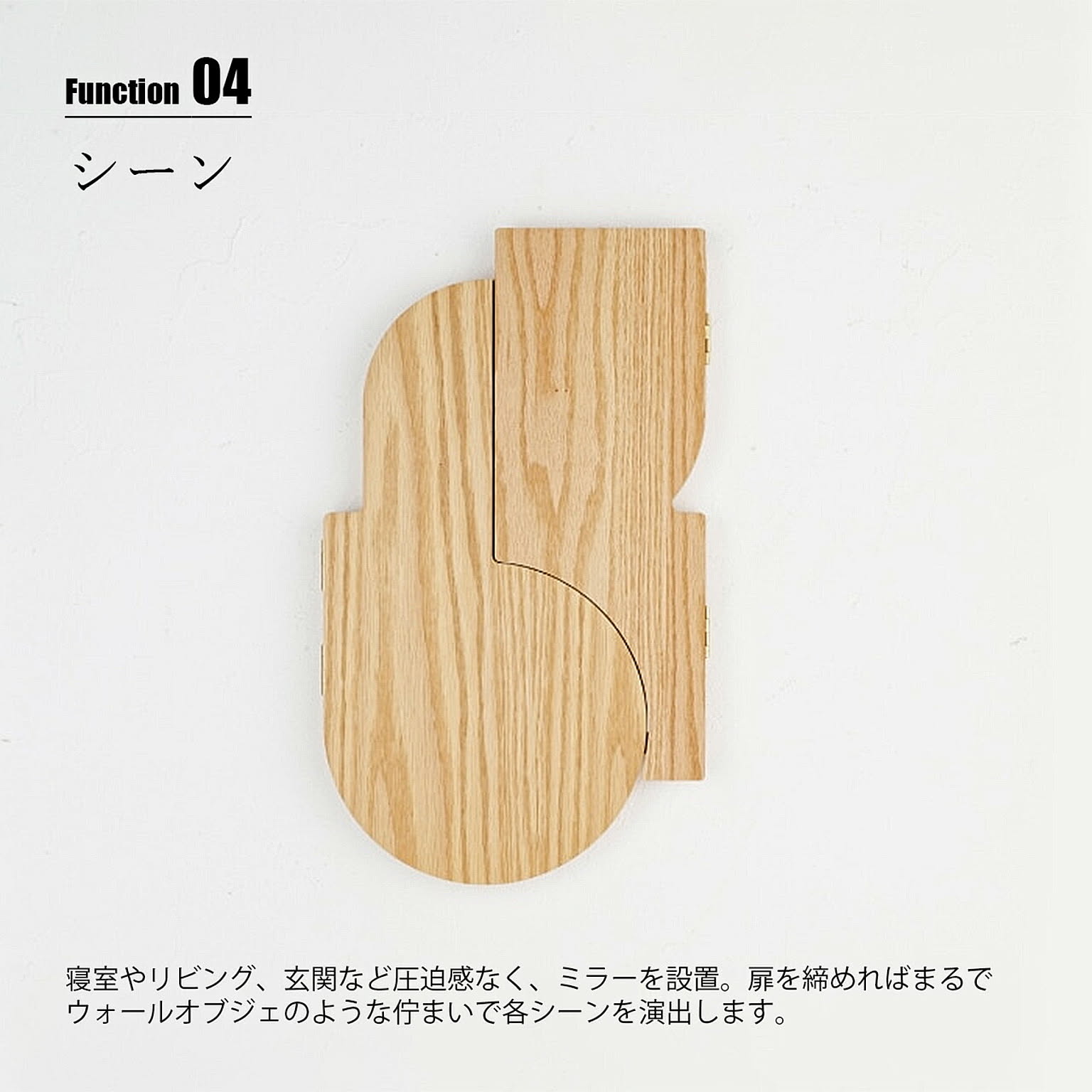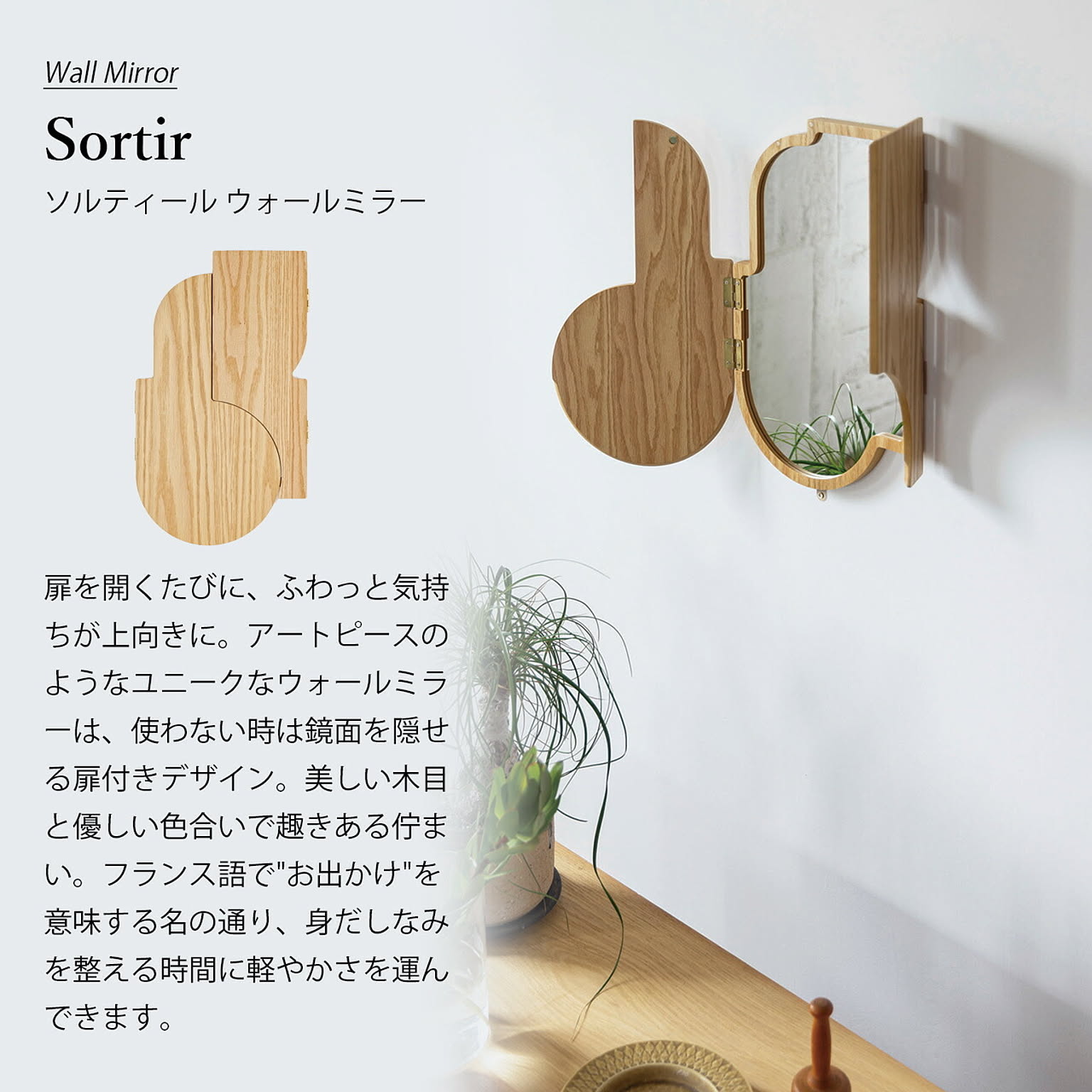 扉を開くたびに、ふわっと気持ちが上向きに。アートピースのようなユニークなウォールミラーは、使わない時は鏡面を隠せる扉付きデザイン。美しい木目と優しい色合いで趣きある佇まい。フランス語で"お出かけ"を意味する名の通り、身だしなみを整える時間に軽やかさを運んできます。