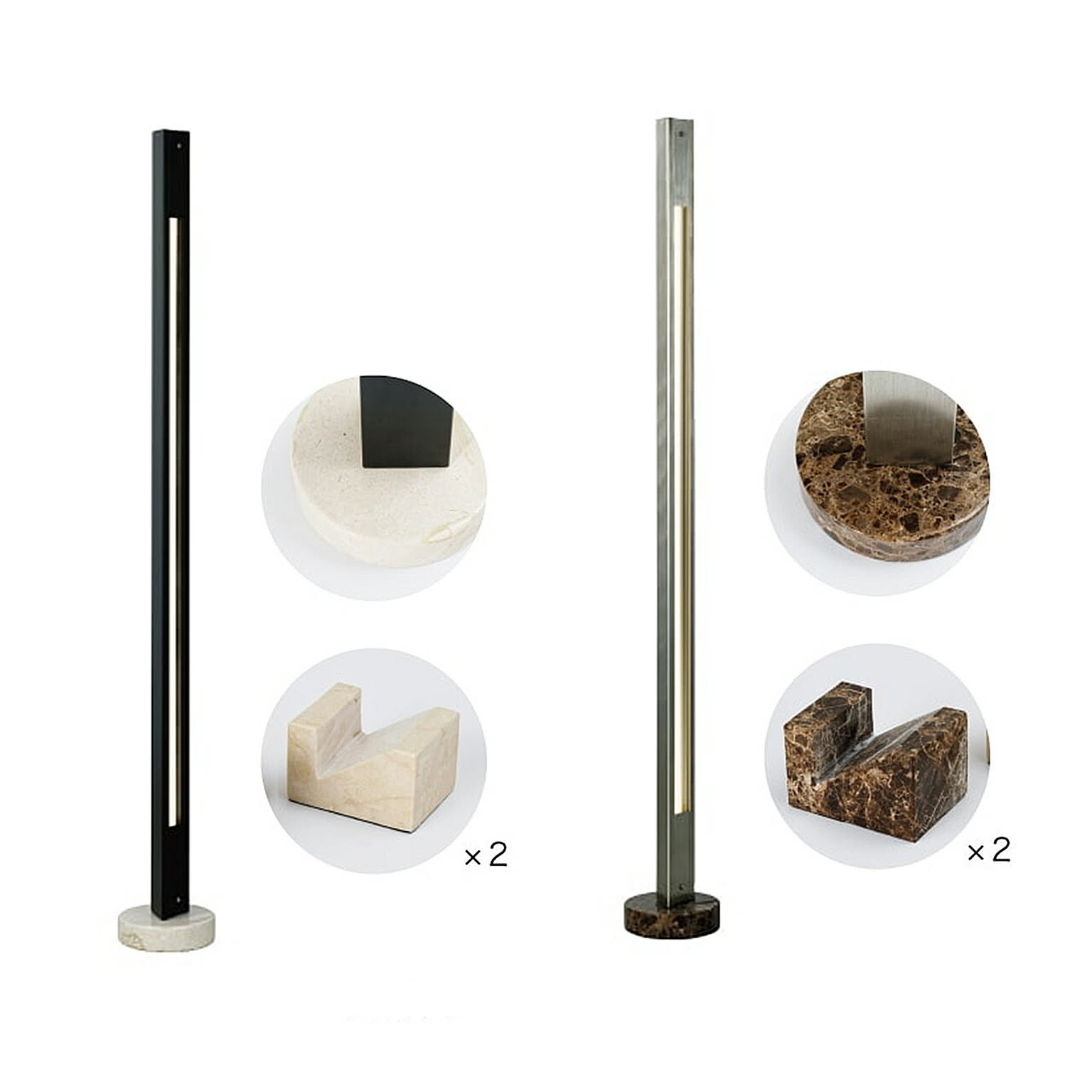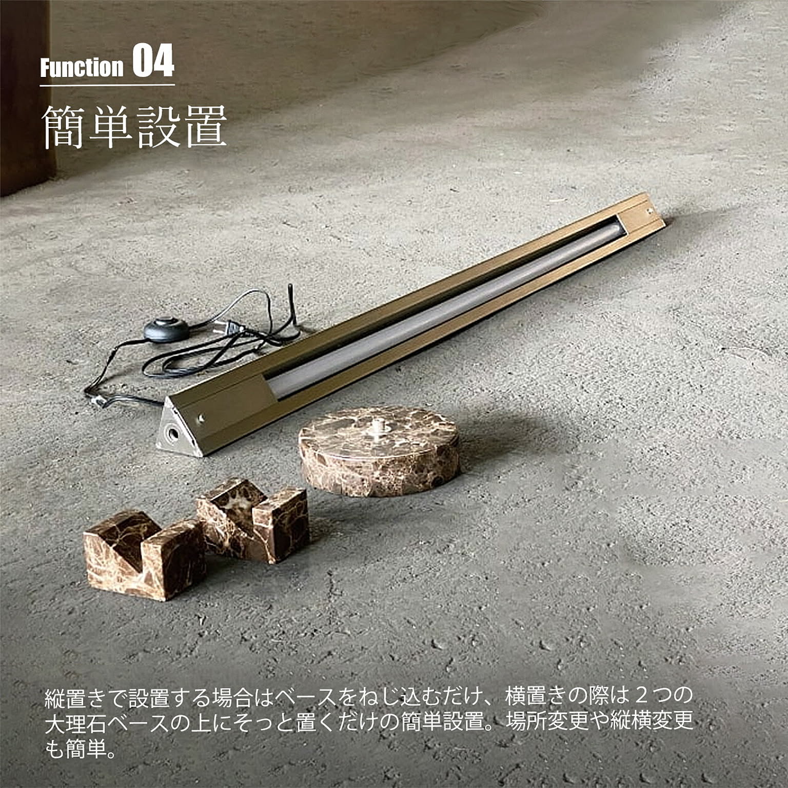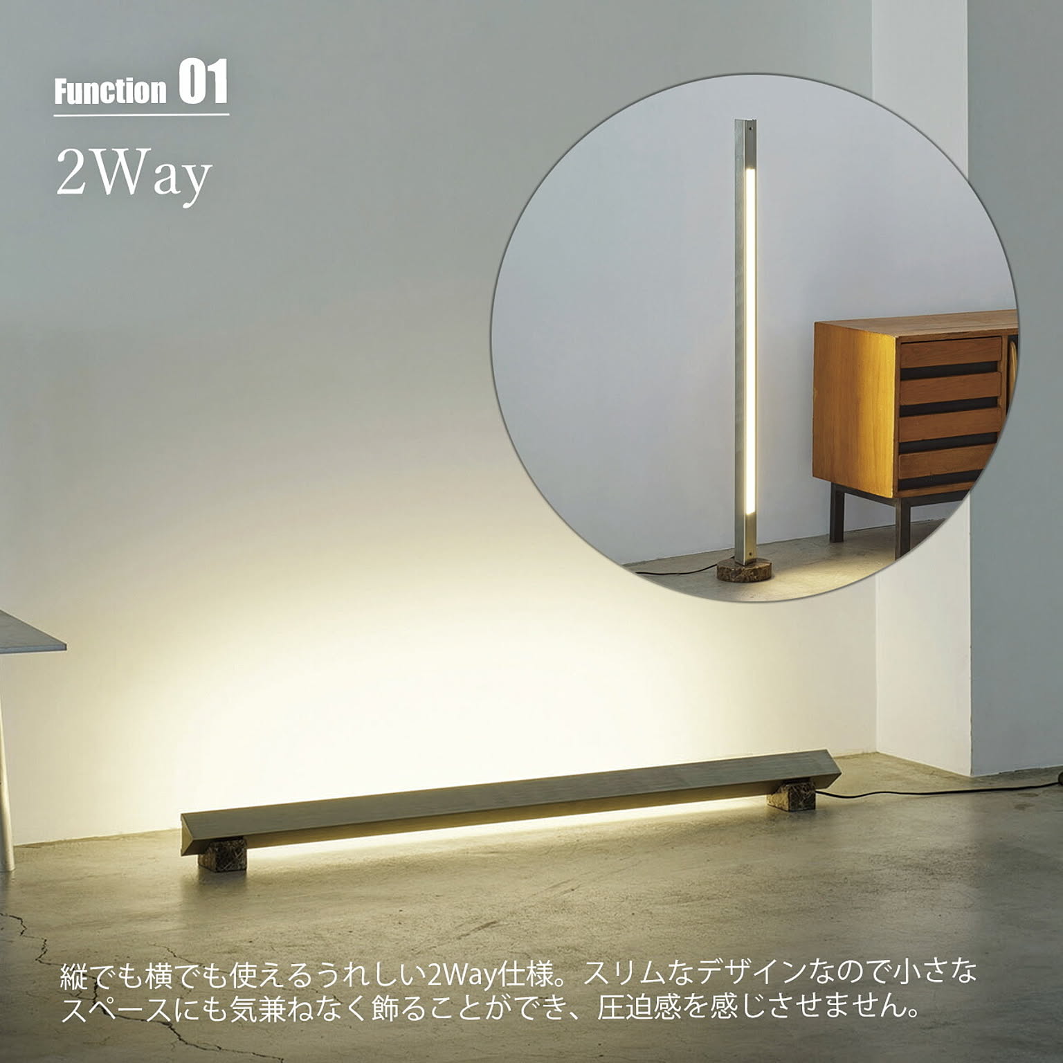 ソファ横などに縦置き、床に横置き、部屋のコーナーや壁面に向けて間接照明にと、多様な使い方が可能なマルチなフロアライト。どこから見ても隙のないトライアングルデザインが、余白を美しく見せながら空間をスタイリッシュに演出します。大理石でできた2種類のベースが付属し、縦でも横でも使えるうれしい2Way仕様を演出します。また、冷たさを持つアルミ素材の本体と、あたたかみのある大理石のベースのコントラストが互いを引き立てます。
