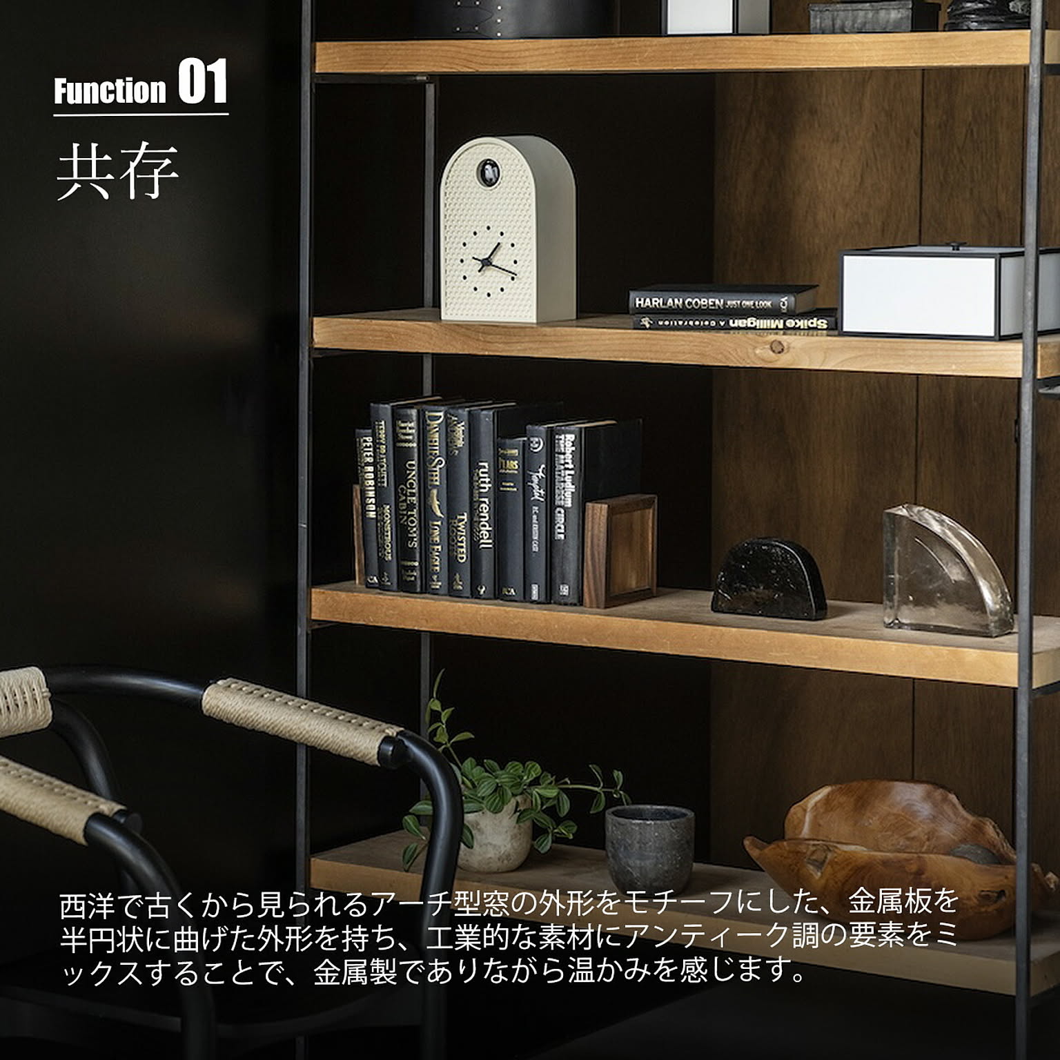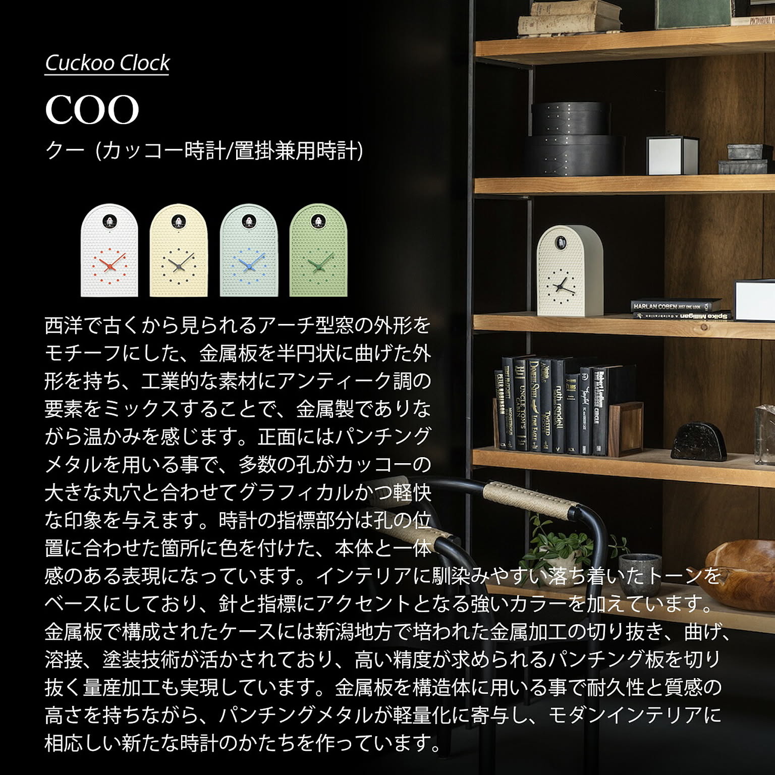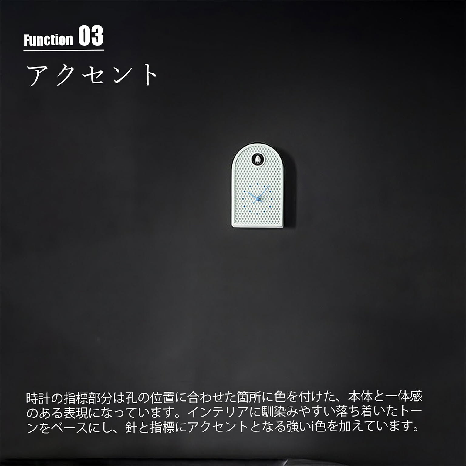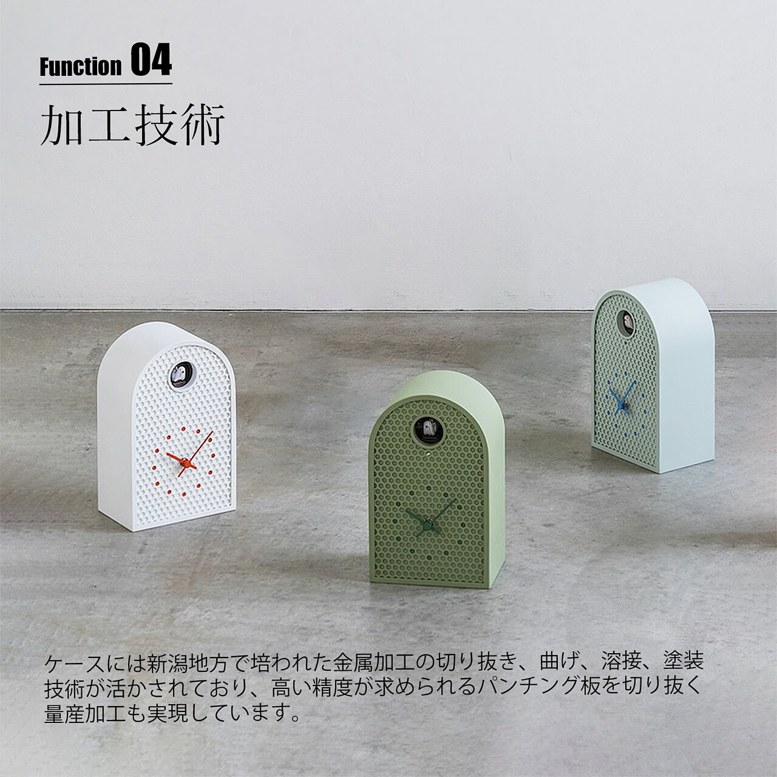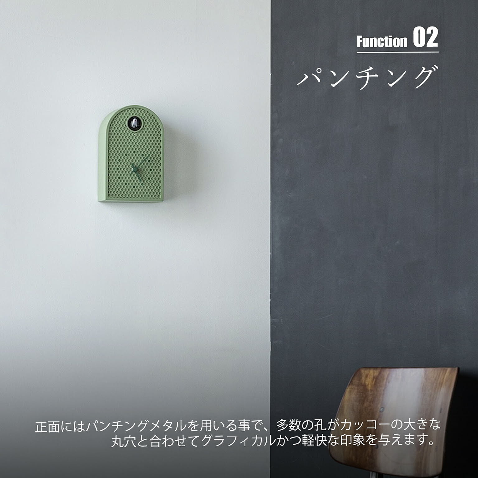 西洋で古くから見られるアーチ型窓の外形をモチーフにした、金属板を半円状に曲げた外形を持ち、工業的な素材にアンティーク調の要素をミックスすることで、金属製でありながら温かみを感じます。正面にはパンチングメタルを用いる事で、多数の孔がカッコーの大きな丸穴と合わせてグラフィカルかつ軽快な印象を与えます。時計の指標部分は孔の位置に合わせた箇所に色を付けた、本体と一体感のある表現になっています。インテリアに馴染みやすい落ち着いたトーンをベースにしており、針と指標にアクセントとなる強いカラーを加えています。金属板で構成されたケースには新潟地方で培われた金属加工の切り抜き、曲げ、溶接、塗装技術が活かされており、高い精度が求められるパンチング板を切り抜く量産加工も実現しています。金属板を構造体に用いる事で耐久性と質感の高さを持ちながら、パンチングメタルが軽量化に寄与し、モダンインテリアに相応しい新たな時計のかたちを作っています。