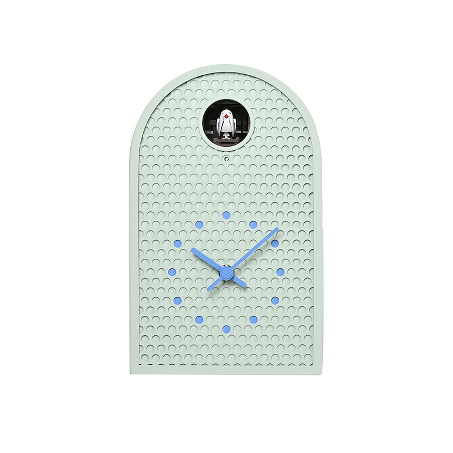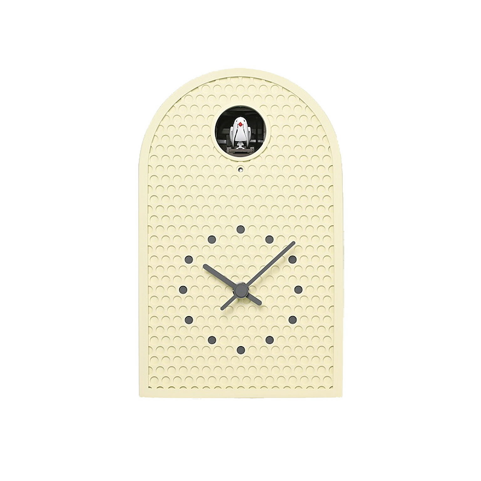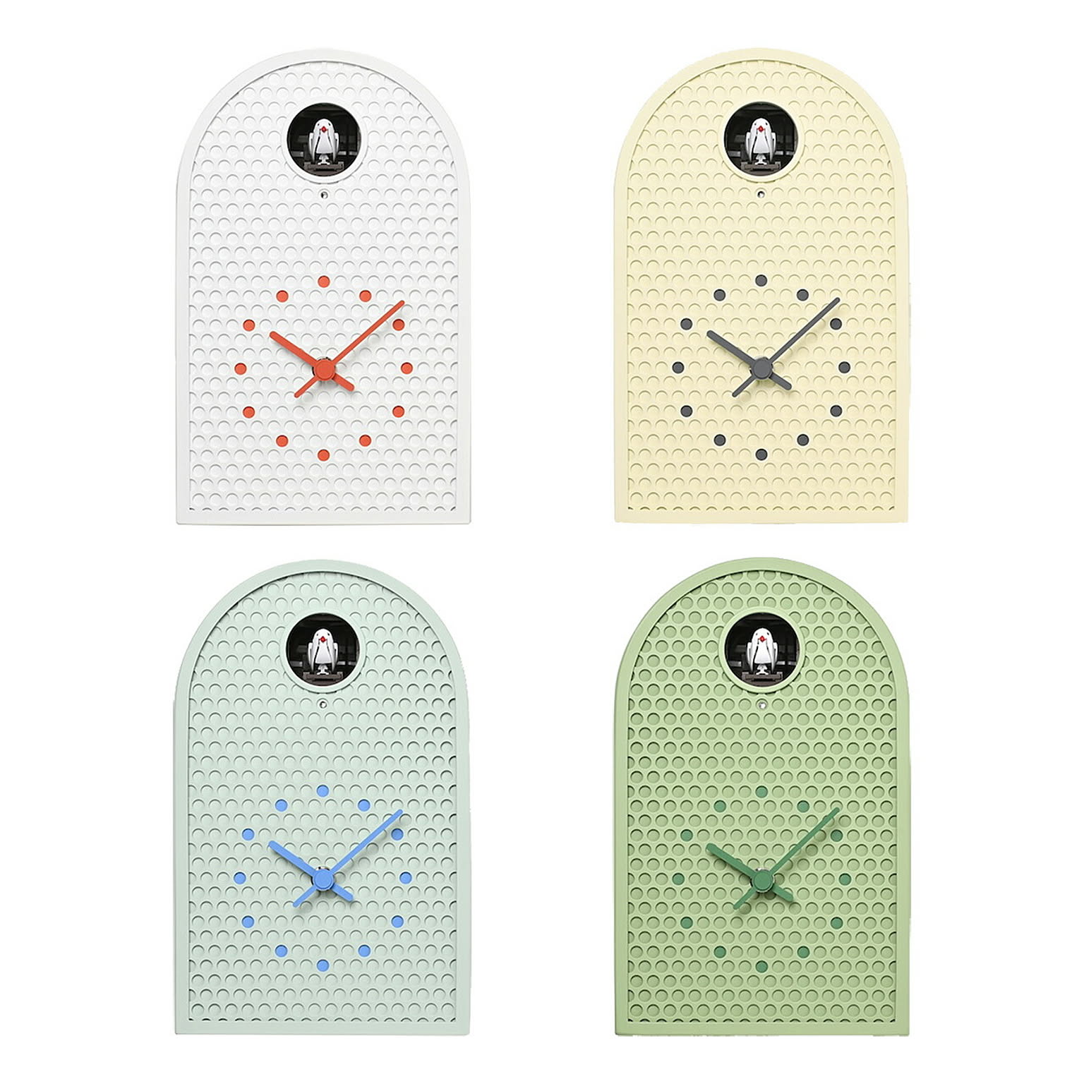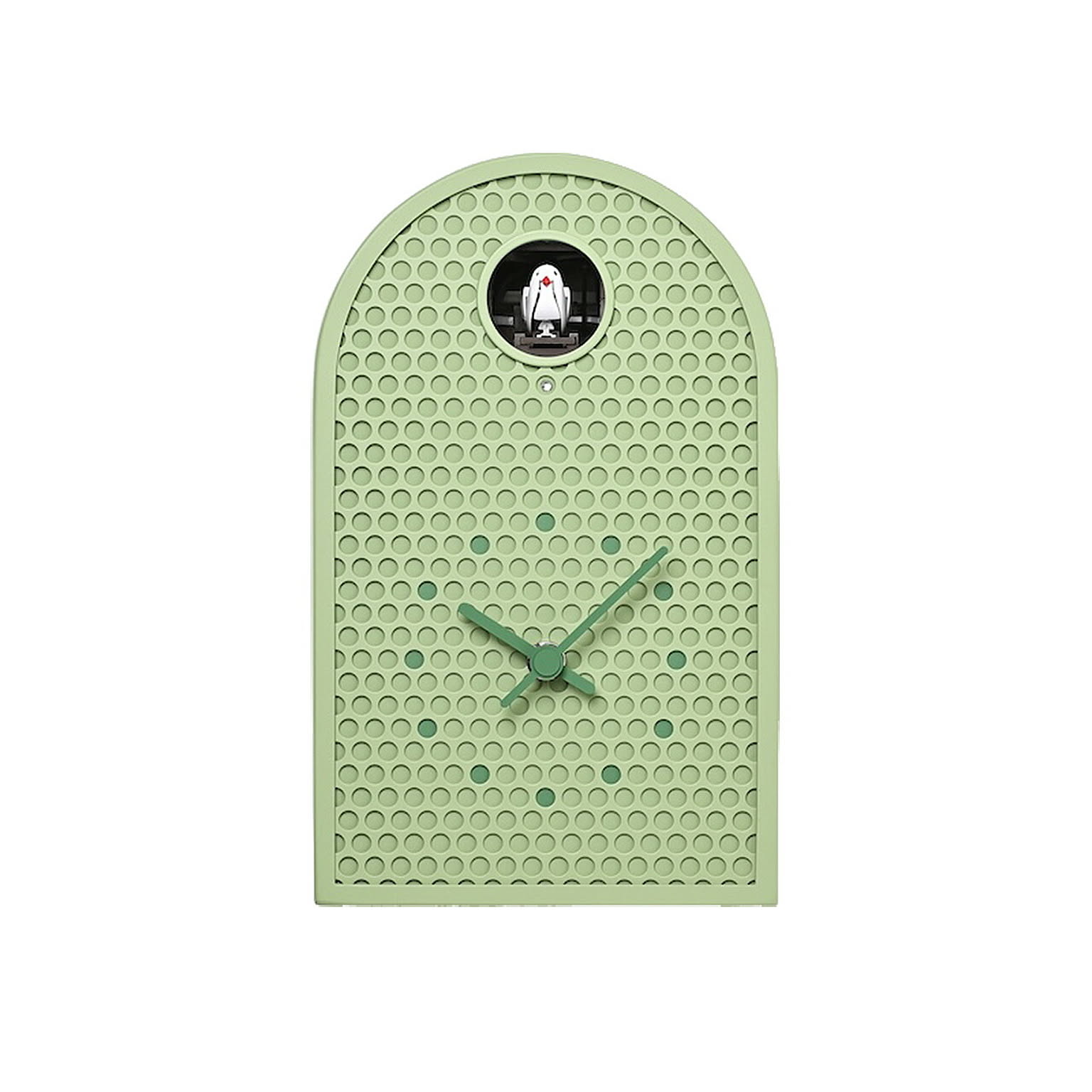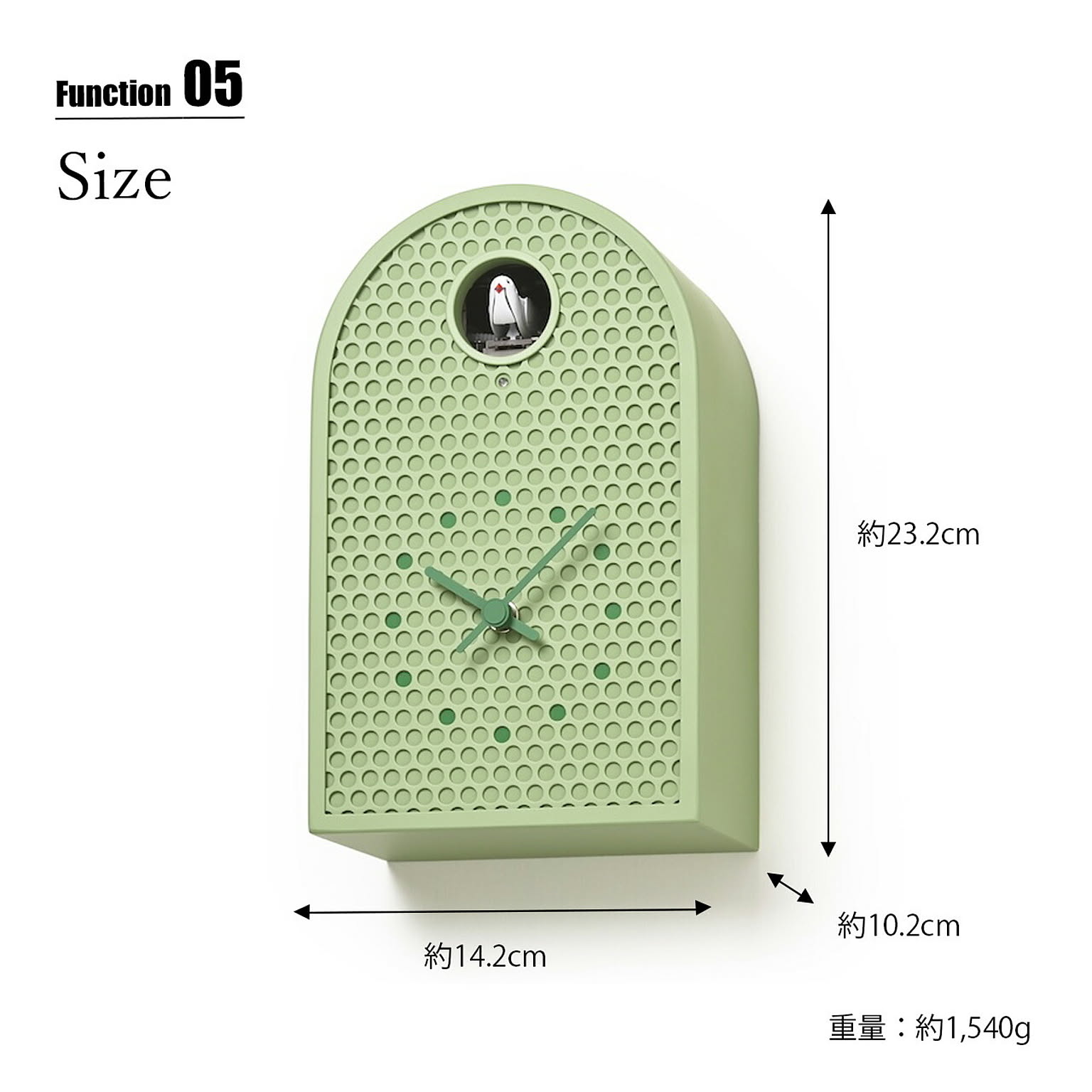 西洋で古くから見られるアーチ型窓の外形をモチーフにした、金属板を半円状に曲げた外形を持ち、工業的な素材にアンティーク調の要素をミックスすることで、金属製でありながら温かみを感じます。正面にはパンチングメタルを用いる事で、多数の孔がカッコーの大きな丸穴と合わせてグラフィカルかつ軽快な印象を与えます。時計の指標部分は孔の位置に合わせた箇所に色を付けた、本体と一体感のある表現になっています。インテリアに馴染みやすい落ち着いたトーンをベースにしており、針と指標にアクセントとなる強いカラーを加えています。金属板で構成されたケースには新潟地方で培われた金属加工の切り抜き、曲げ、溶接、塗装技術が活かされており、高い精度が求められるパンチング板を切り抜く量産加工も実現しています。金属板を構造体に用いる事で耐久性と質感の高さを持ちながら、パンチングメタルが軽量化に寄与し、モダンインテリアに相応しい新たな時計のかたちを作っています。