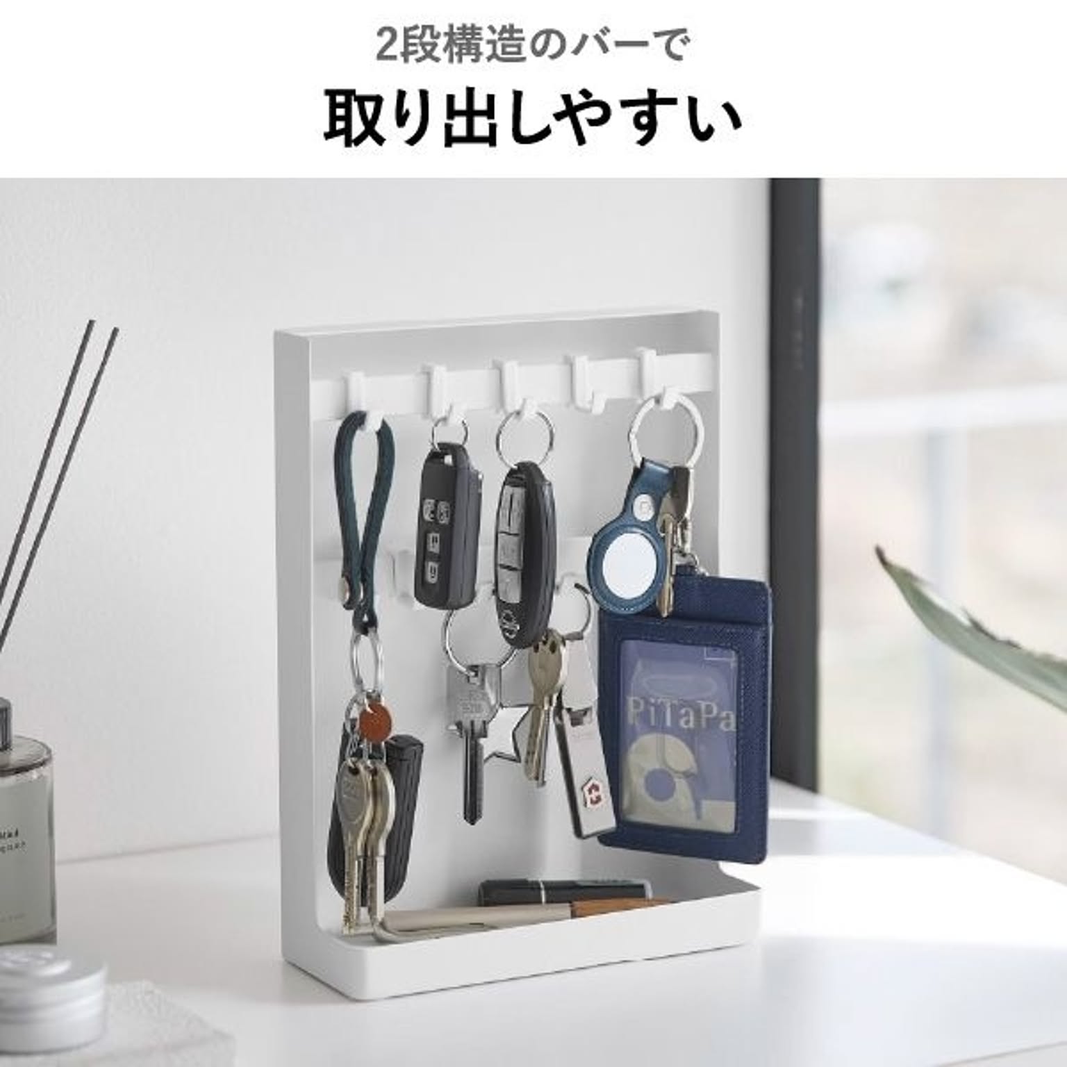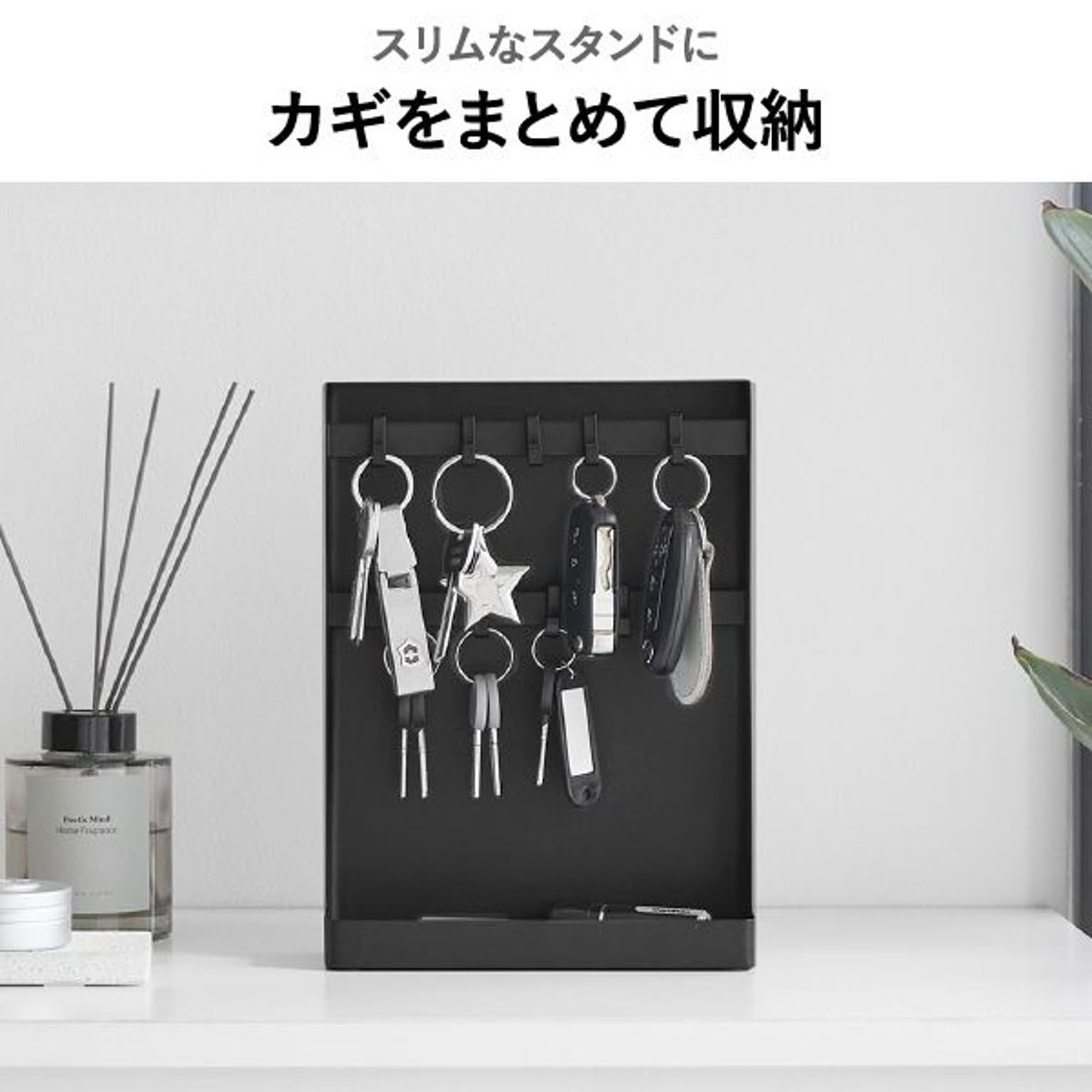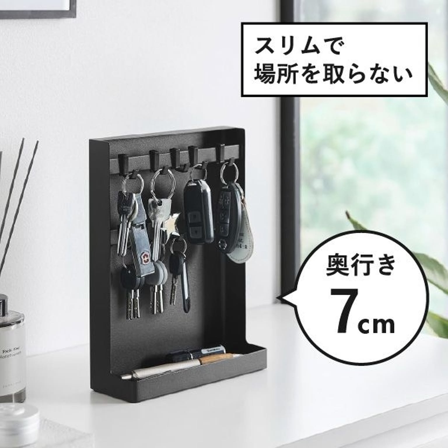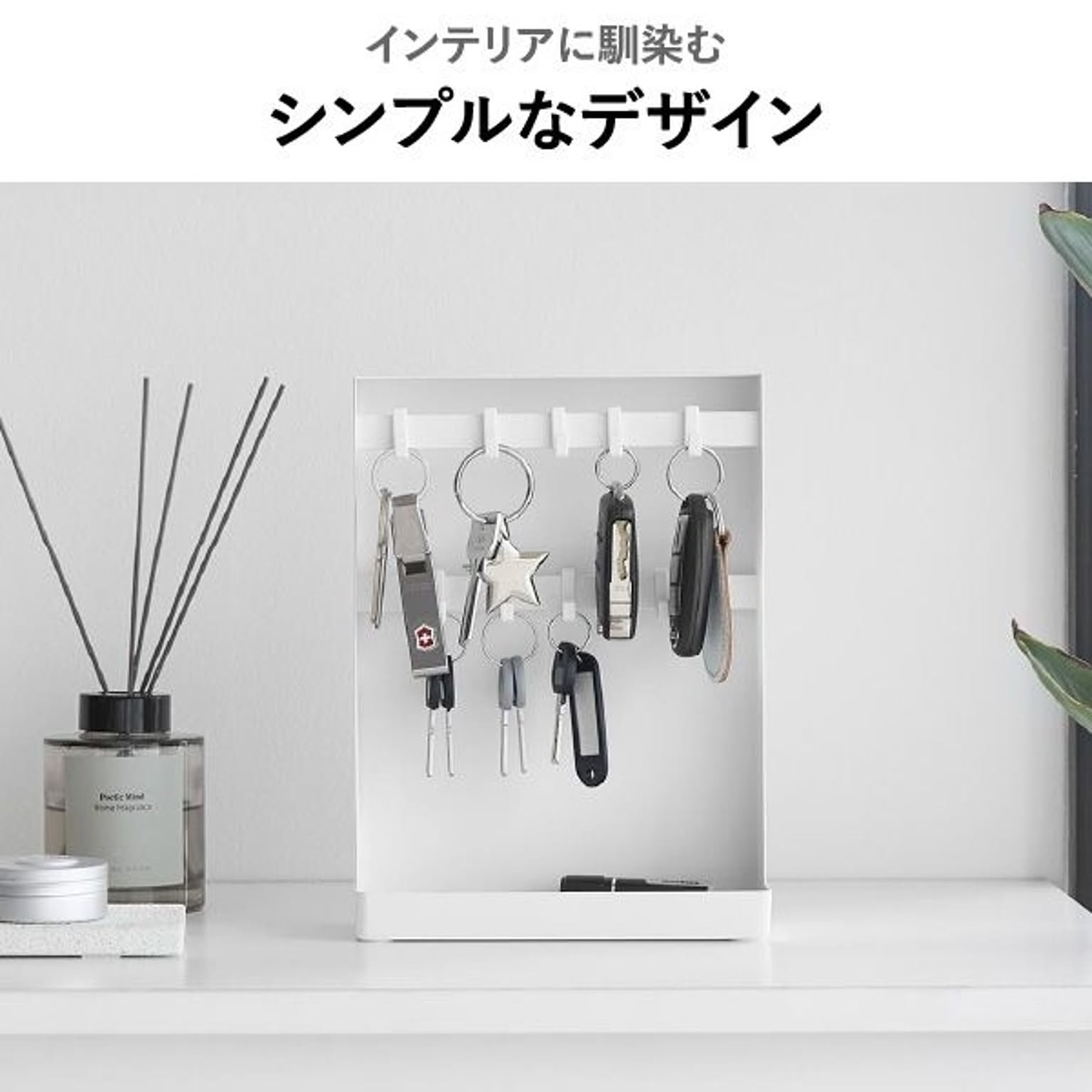 鍵をすっきりまとめて収納できる、山崎実業 towerシリーズのおしゃれなキーフックスタンドです。自宅や自転車の鍵、車のスマートキーなど、よく使う鍵を引っ掛けておけば、使いたいときにすぐ手に取れて便利。玄関収納にもぴったりなスリム設計で、奥行き約7cmとコンパクトなサイズ感です。使わないときはキーフックスタンドをクルッと回して裏返せば、収納した鍵を目隠しできます。生活感を隠せるので、おしゃれな玄関インテリアを保ちながらすっきり整えられます。フックは10個付属しており、お好みの位置に取り付け可能。フックを引っ掛けるバーは2段構造になっており、収納力も抜群です。上段と下段で奥行きが異なるため、鍵同士がゴチャつかず、使いたい鍵をサッと取り出せます。下部は小物トレーになっており、印鑑やペンなど、よく使う玄関小物収納にも便利。本体は丈夫なスチール製で、程よい重みと安定感があります。お手入れもしやすく、底面にはシリコーンゴムのクッションが付いているため、設置面に傷が付くのを防ぎます。さらに、キーフックスタンド タワーにはマグネットも付けられるので、ちょっとしたメモを貼ることも可能。モノトーンのシンプルなデザインで、玄関の鍵収納をおしゃれに演出します。カラーはホワイトとブラックの2色からお選びいただけます。おしゃれな玄関を演出するタワーシリーズのキーフックスタンド tower。鍵をすっきり収納しながら目隠しもできる、スマートな鍵収納アイテムです。towerシリーズのキーフックや玄関収納アイテムをお探しの方にもおすすめです。