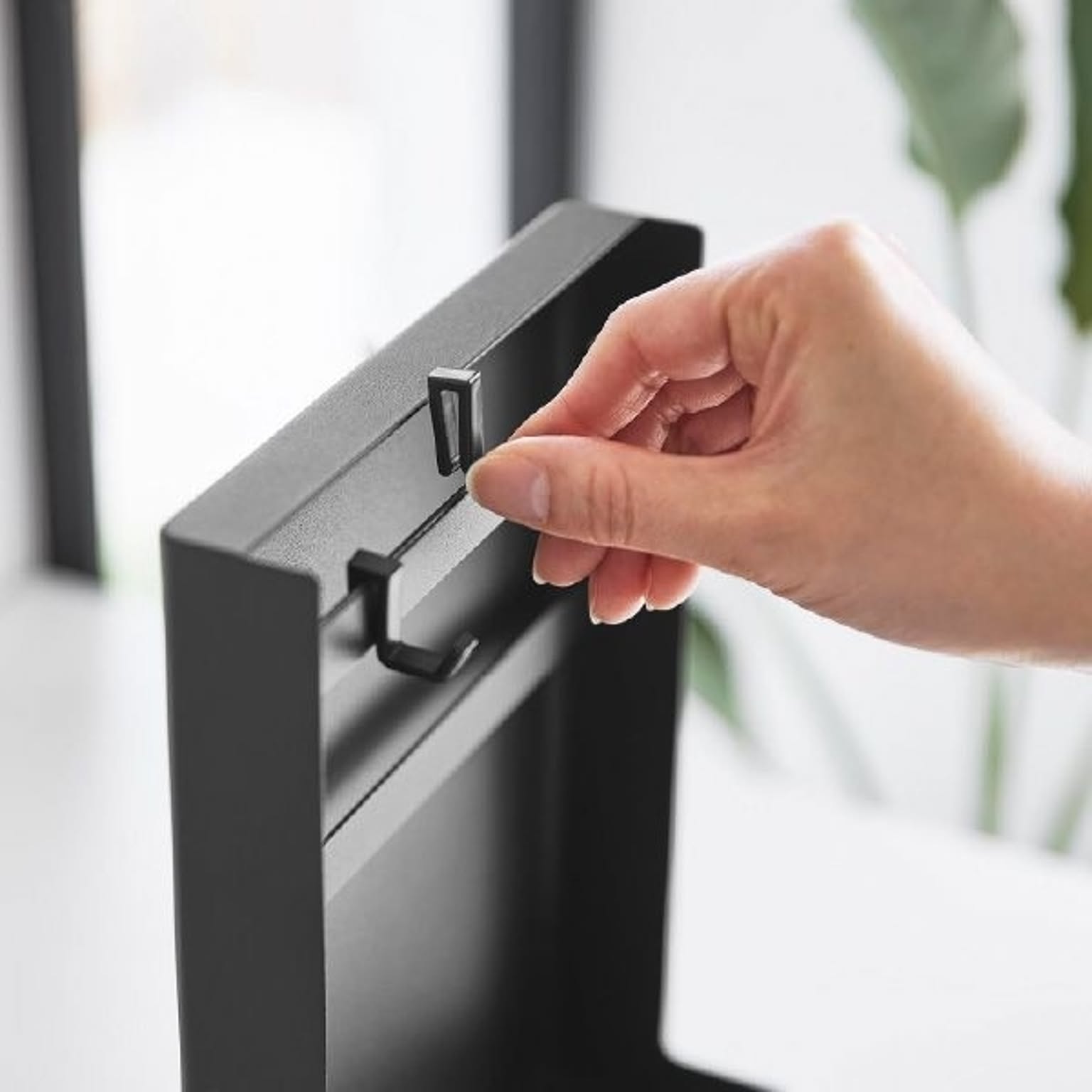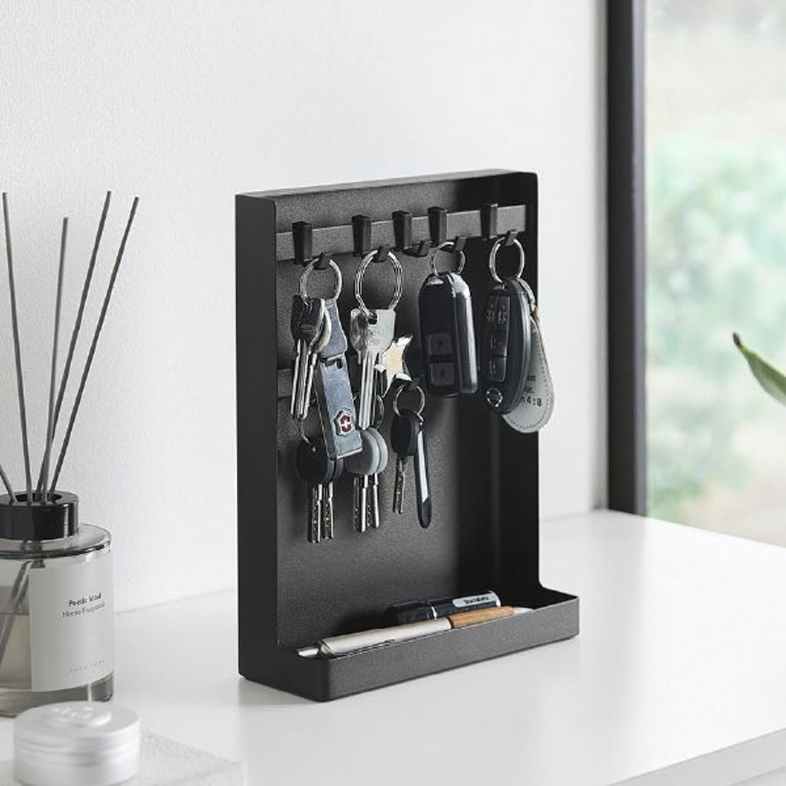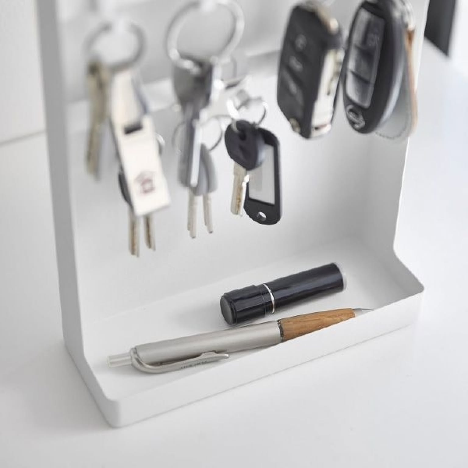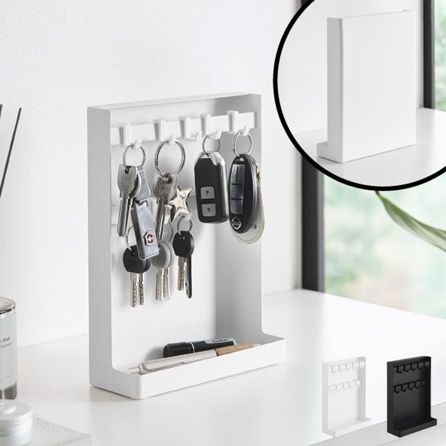 鍵をすっきりまとめて収納できる、山崎実業 towerシリーズのおしゃれなキーフックスタンドです。自宅や自転車の鍵、車のスマートキーなど、よく使う鍵を引っ掛けておけば、使いたいときにすぐ手に取れて便利。玄関収納にもぴったりなスリム設計で、奥行き約7cmとコンパクトなサイズ感です。使わないときはキーフックスタンドをクルッと回して裏返せば、収納した鍵を目隠しできます。生活感を隠せるので、おしゃれな玄関インテリアを保ちながらすっきり整えられます。フックは10個付属しており、お好みの位置に取り付け可能。フックを引っ掛けるバーは2段構造になっており、収納力も抜群です。上段と下段で奥行きが異なるため、鍵同士がゴチャつかず、使いたい鍵をサッと取り出せます。下部は小物トレーになっており、印鑑やペンなど、よく使う玄関小物収納にも便利。本体は丈夫なスチール製で、程よい重みと安定感があります。お手入れもしやすく、底面にはシリコーンゴムのクッションが付いているため、設置面に傷が付くのを防ぎます。さらに、キーフックスタンド タワーにはマグネットも付けられるので、ちょっとしたメモを貼ることも可能。モノトーンのシンプルなデザインで、玄関の鍵収納をおしゃれに演出します。カラーはホワイトとブラックの2色からお選びいただけます。おしゃれな玄関を演出するタワーシリーズのキーフックスタンド tower。鍵をすっきり収納しながら目隠しもできる、スマートな鍵収納アイテムです。towerシリーズのキーフックや玄関収納アイテムをお探しの方にもおすすめです。