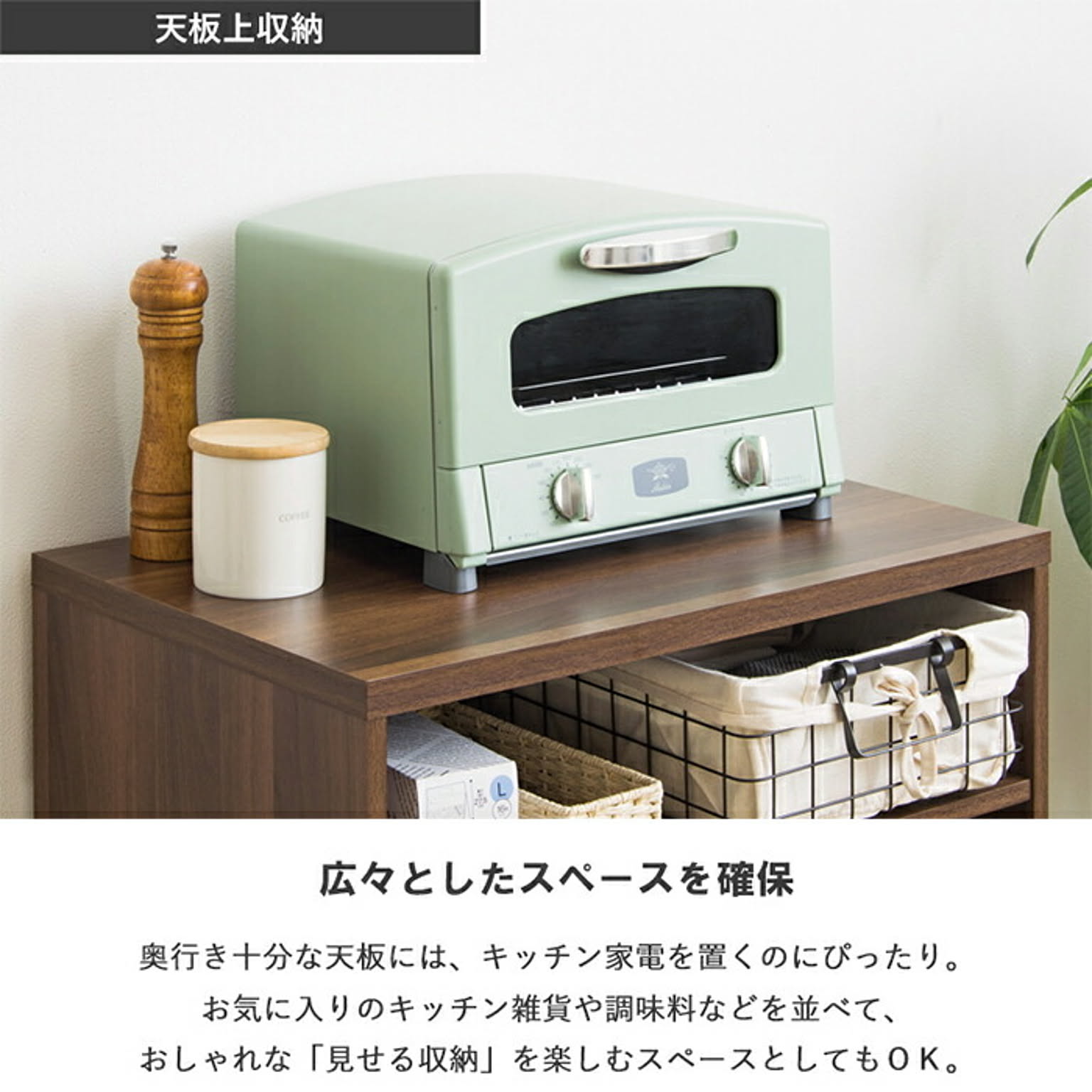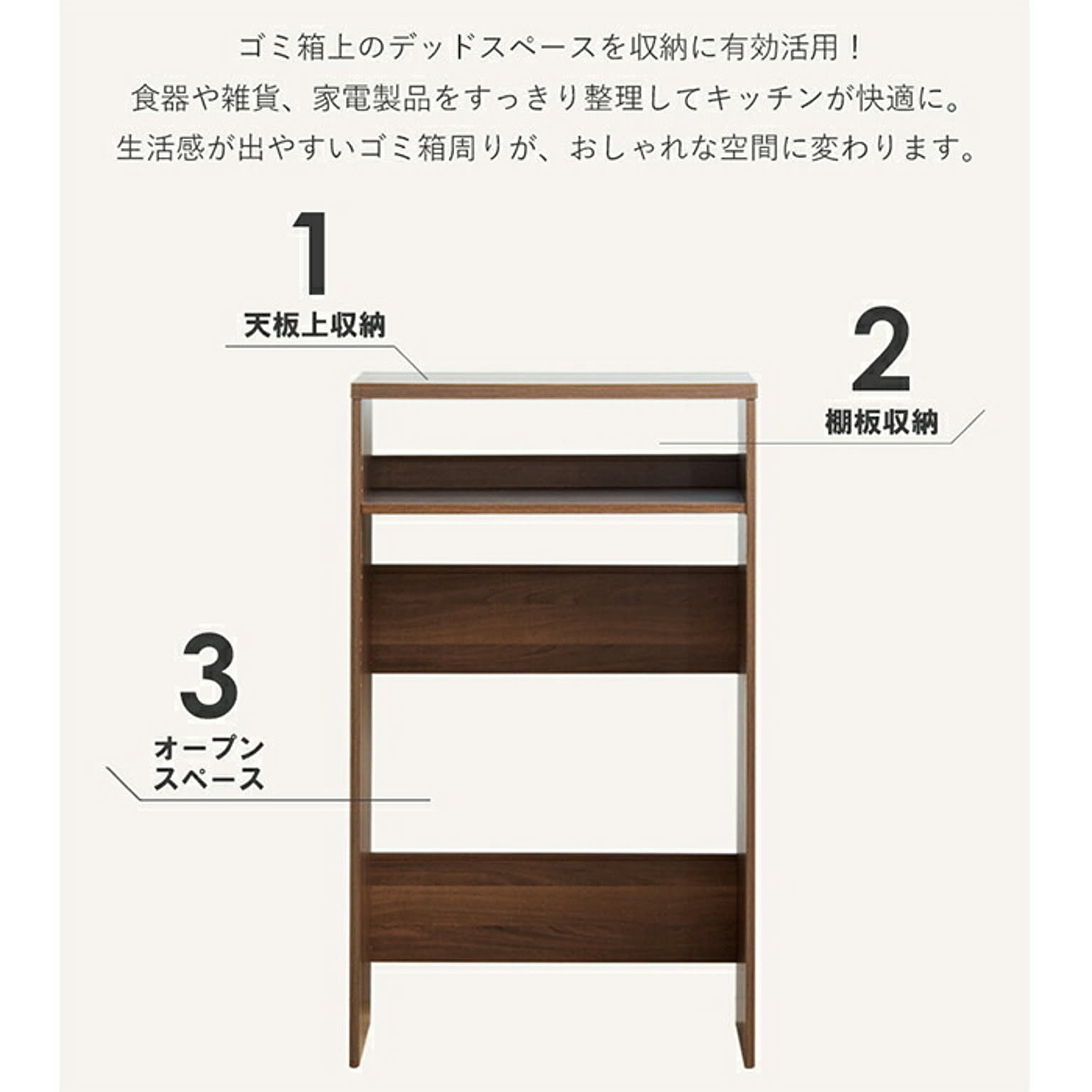 ゴミ箱の上の空きスペースを有効活用できる省スペース収納ラックです。キッチンのデッドスペースを有効活用して、すっきり片付けられます。幅約60cmのスリムな設計で、45Lサイズのゴミ箱を最大で2個収納。天板の上には家電などを、天板の下には小物が収納できる可動棚付き。