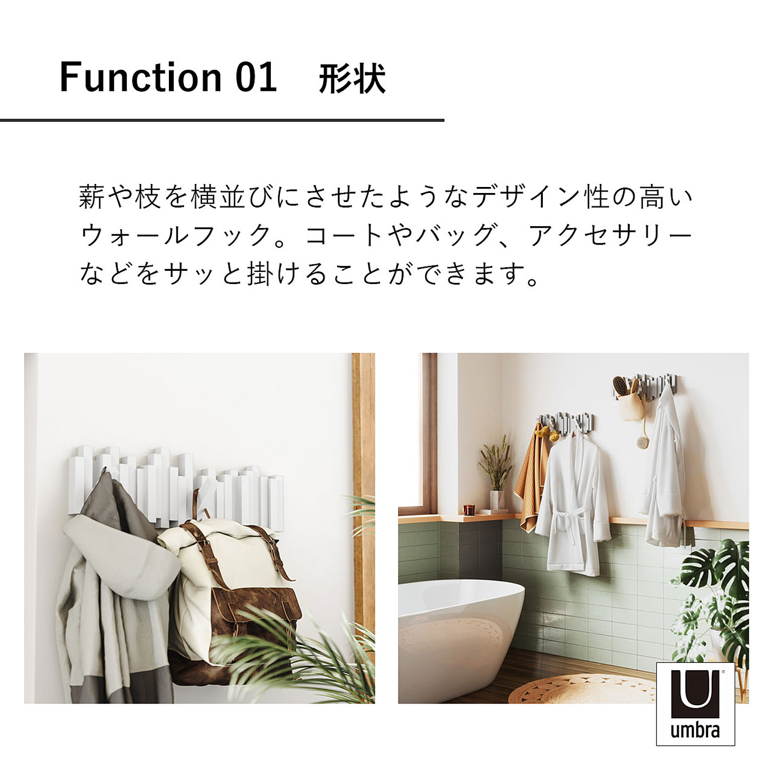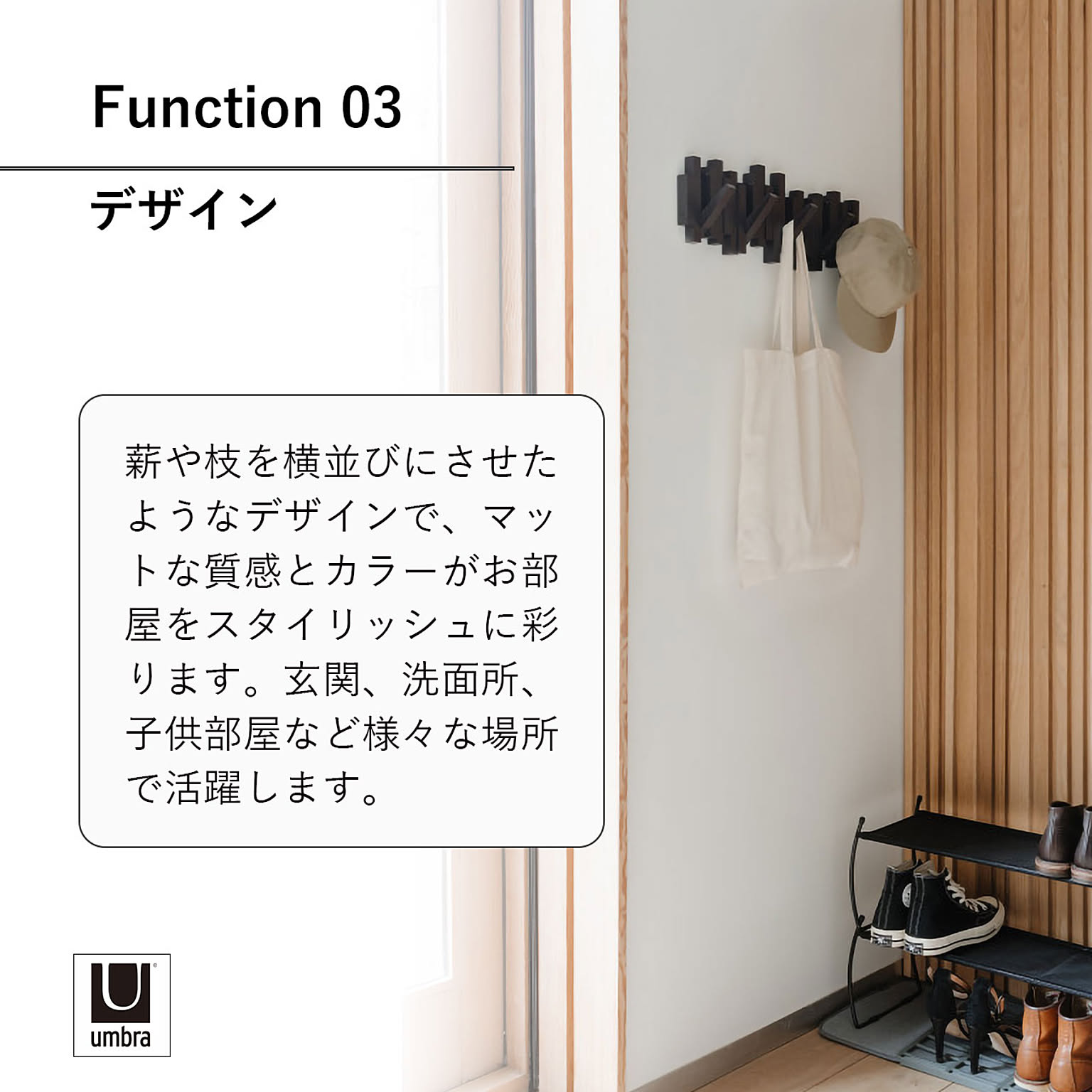 薪や枝を横並びにさせたようなデザイン性の高いウォールフック。5つのフックは使用しない時はシームレスに元の位置に戻り、壁をすっきりと見せることができます。