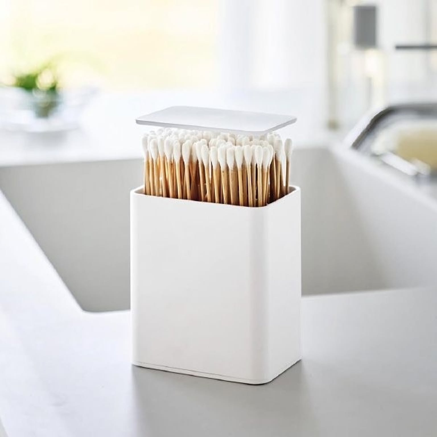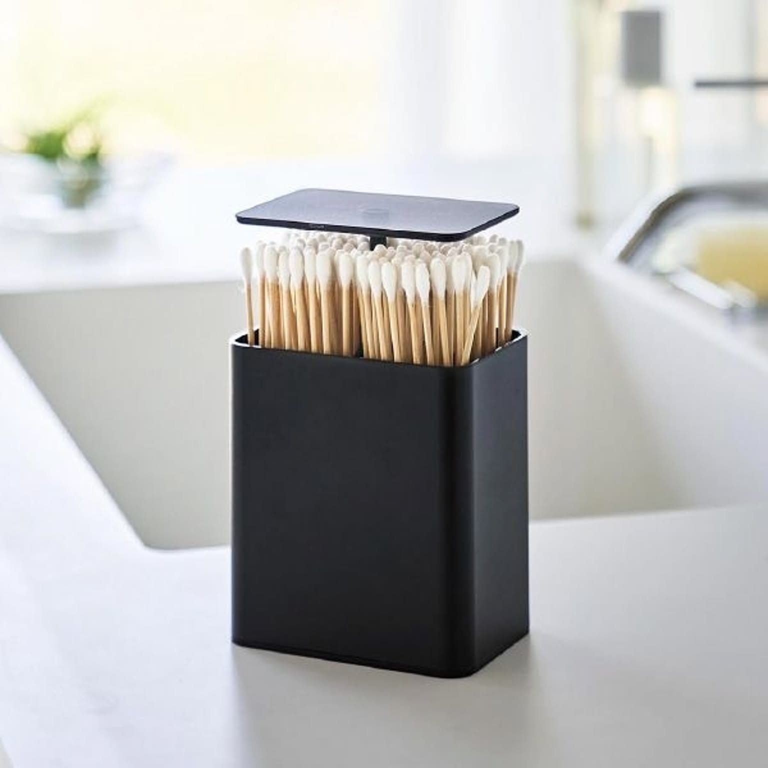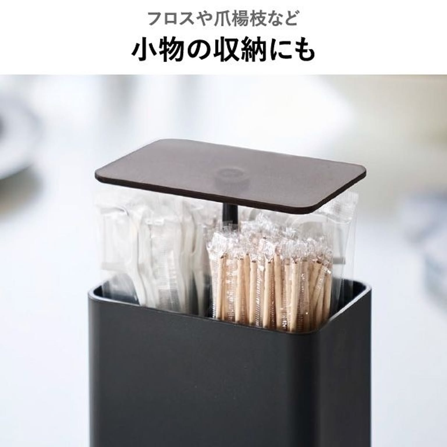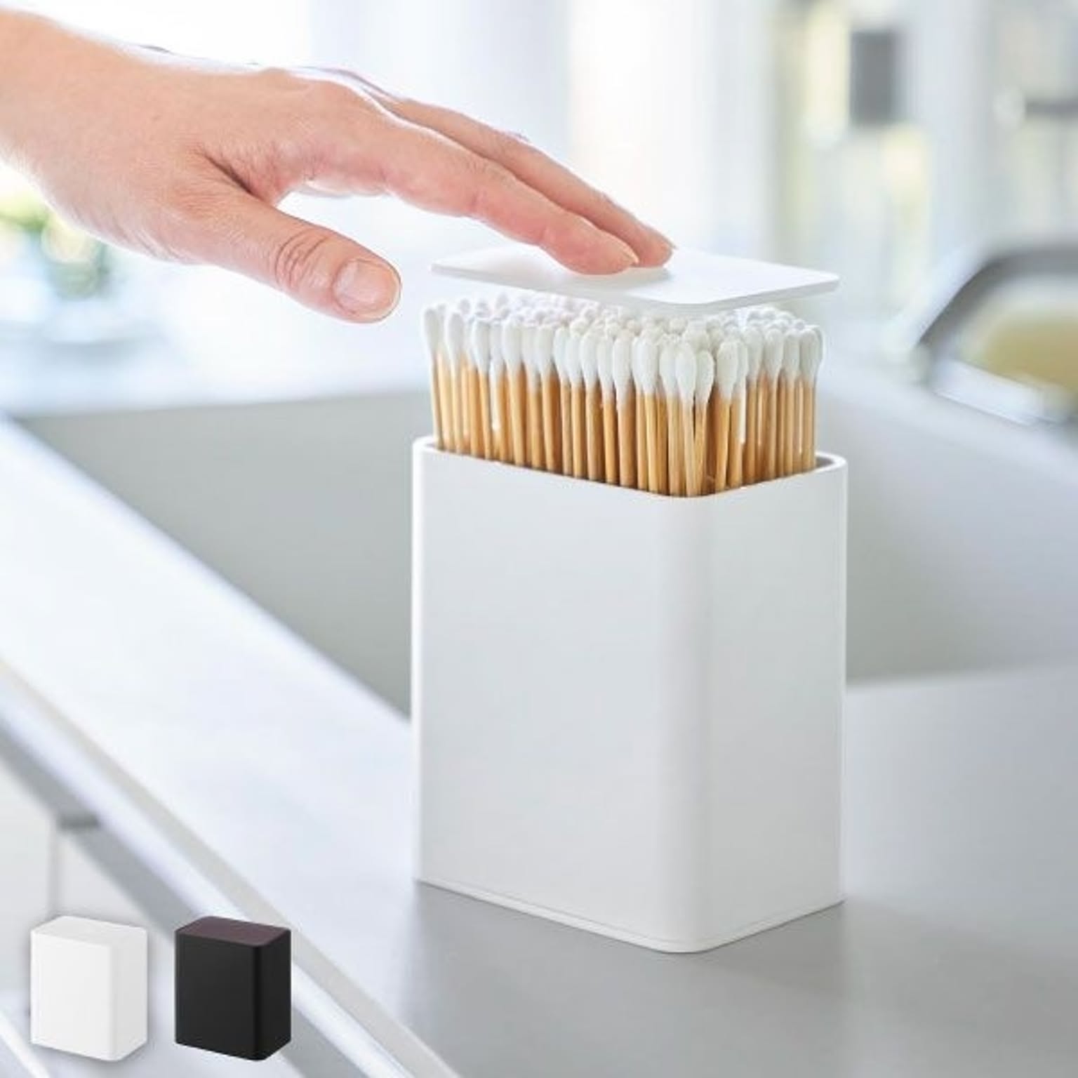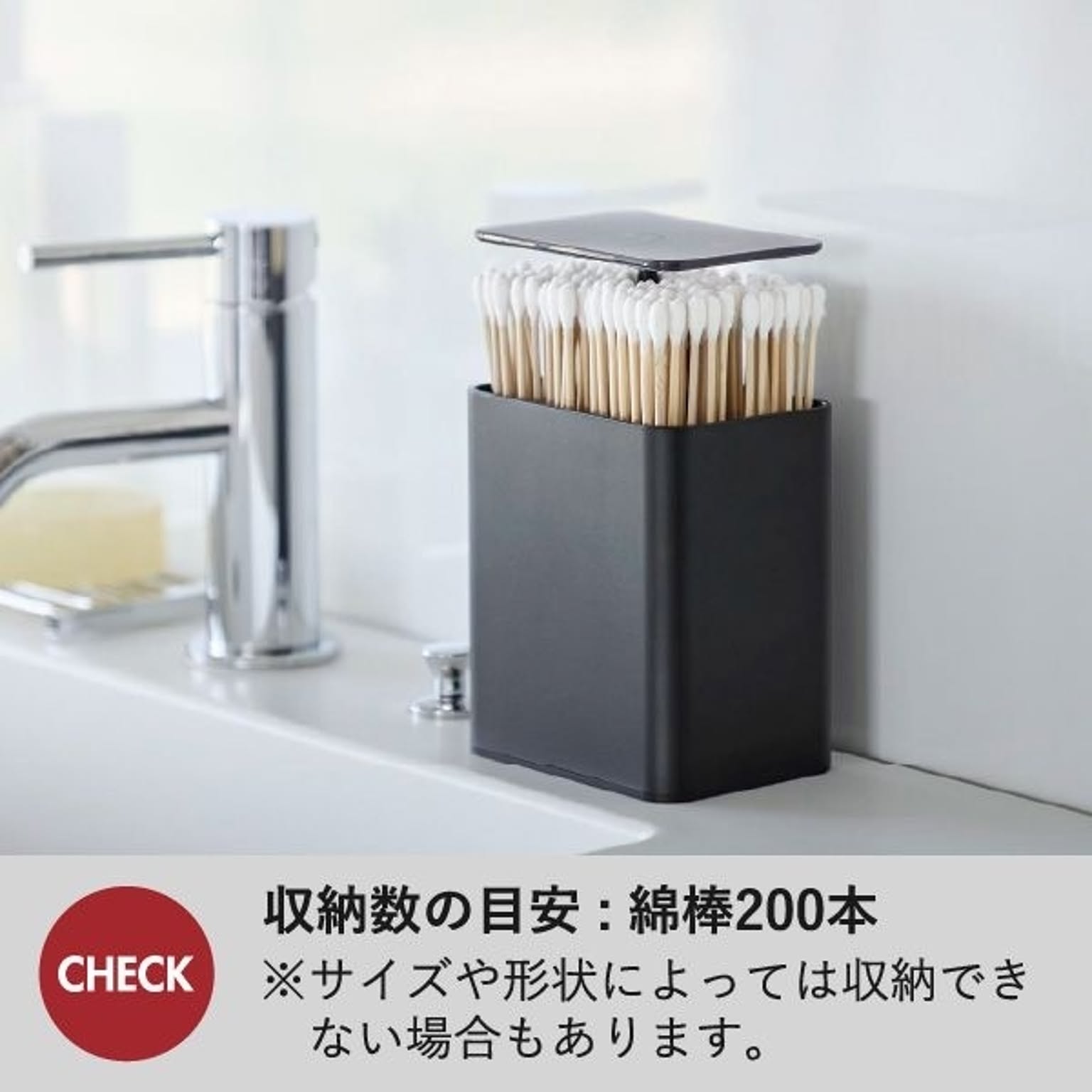 綿棒をまとめて収納できる、towerシリーズのおしゃれなポップアップ式綿棒ケースです。スリムなフォルムの綿棒入れに、綿棒をおよそ200本収納できます。コンパクトながら大容量で、綿棒をすっきりまとめられる綿棒ケースです。おしゃれな綿棒ケースに詰め替えることで、生活感をオフ。洗練された空間を演出できるスタイリッシュな蓋付き綿棒入れは、洗面台まわりを整えたい方にもぴったりの綿棒入れです。綿棒ケースは便利なプッシュ式。蓋をワンプッシュすることで収納ポケットが自動的に持ち上がる構造です。ワンタッチかつ綿棒を片手で取り出せる、日常使いしやすい綿棒入れです。収納ポケットは仕切り付きなので、爪切りやピンセットなどの衛生用品を仕分けながら収納可能。綿棒以外もすっきりまとめられる、多用途の綿棒入れとして活躍します。綿棒ケースの蓋は半透明で残量がわかりやすく、補充のタイミングも一目で確認できます。蓋は取り外せるので、綿棒の補充もスムーズに行えます。綿棒ケースとしてはもちろん、爪楊枝入れやフロスケースとしても使える万能な綿棒入れです。小物収納として幅広く使えるため、「見せない収納」を叶える綿棒入れとしてもおすすめです。山崎実業 タワーシリーズの綿棒ケースは、お手入れしやすいプラスチック製。ホワイトとブラックの2色展開で、様々なインテリアに溶け込みます。おしゃれな空間づくりにぴったりな綿棒入れで、毎日の生活を快適に。