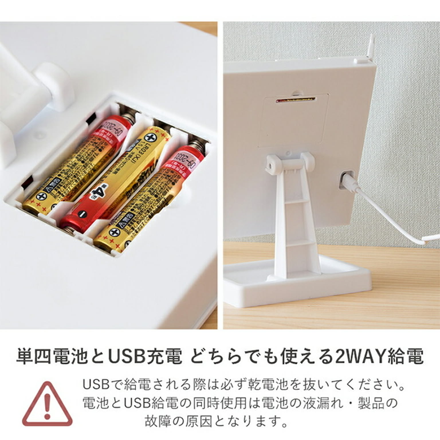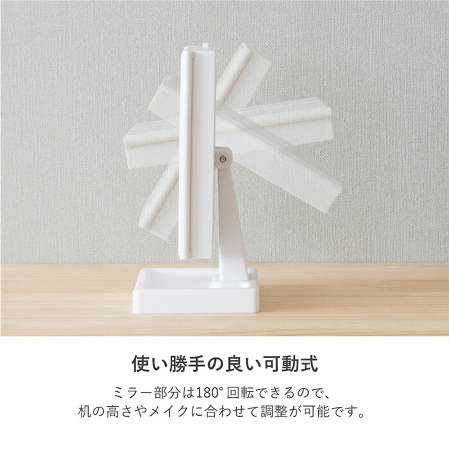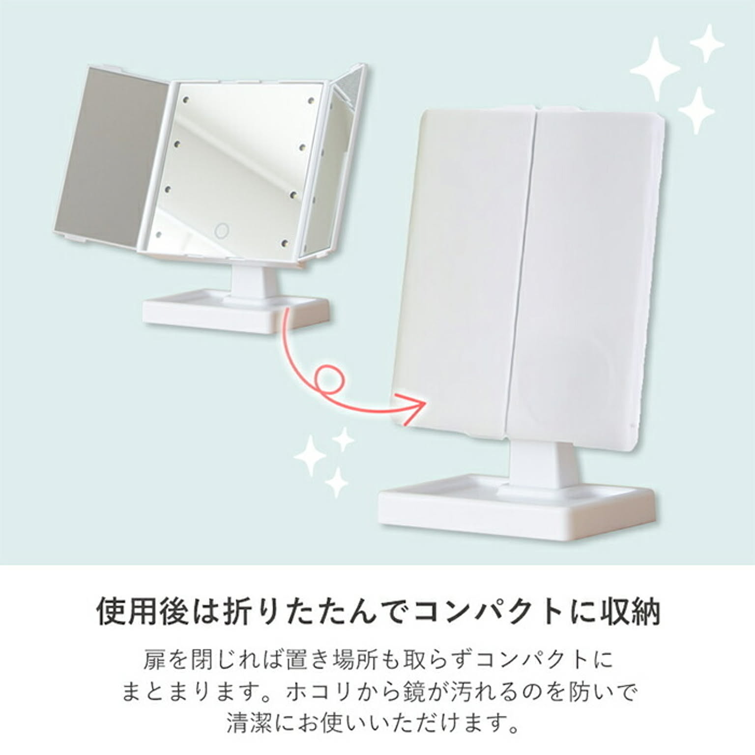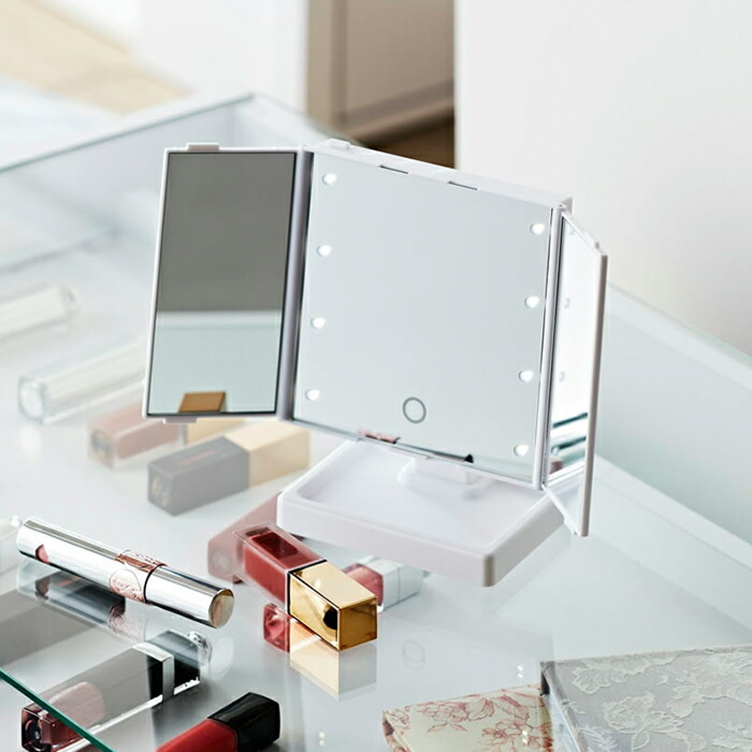 8個のLEDライトが、お顔全体を明るく照らしてくれる3面鏡タイプのメイクアップミラー。3方向から映せるため、見えにくい横顔や髪型のチェックも簡単で、細かい部分の確認にも最適です。