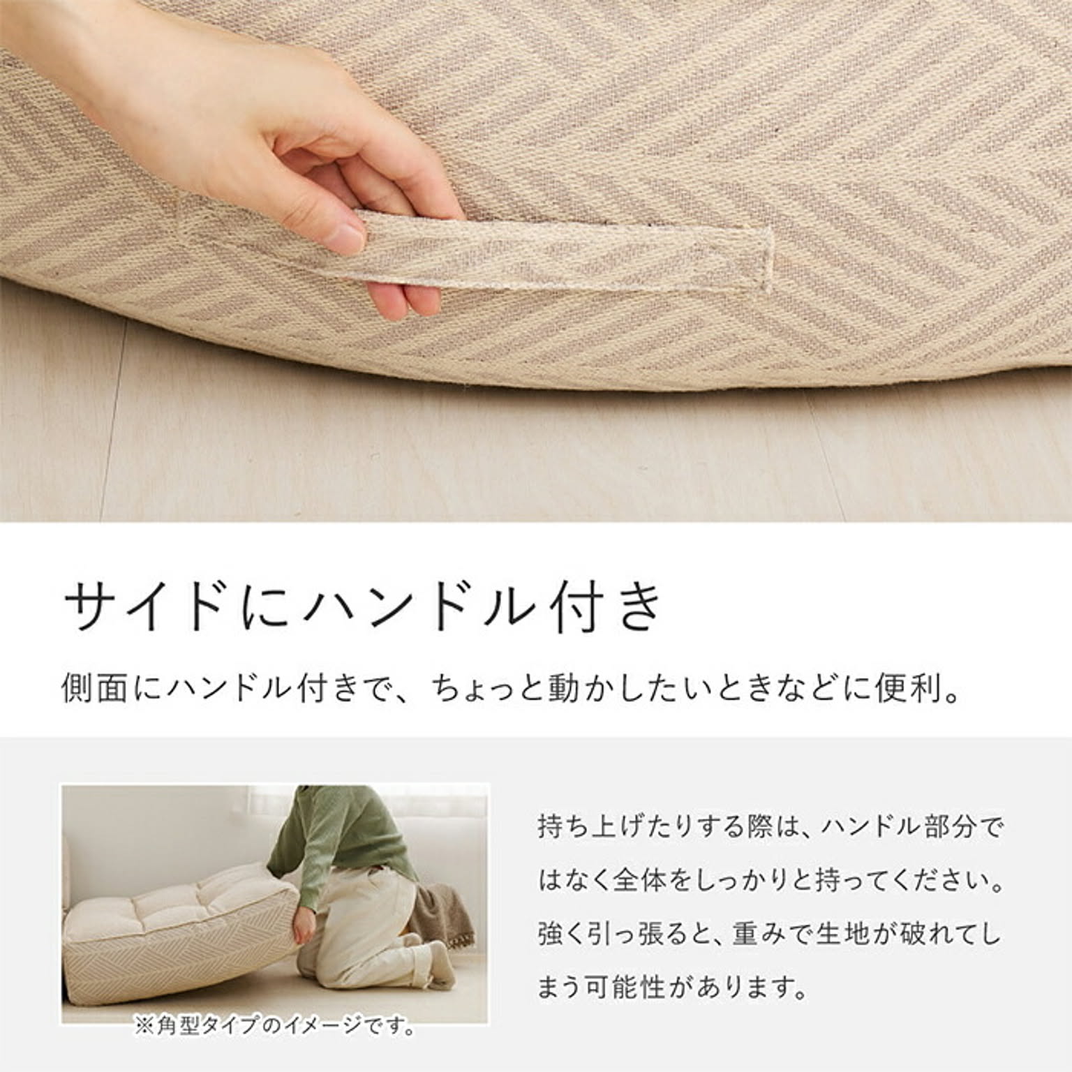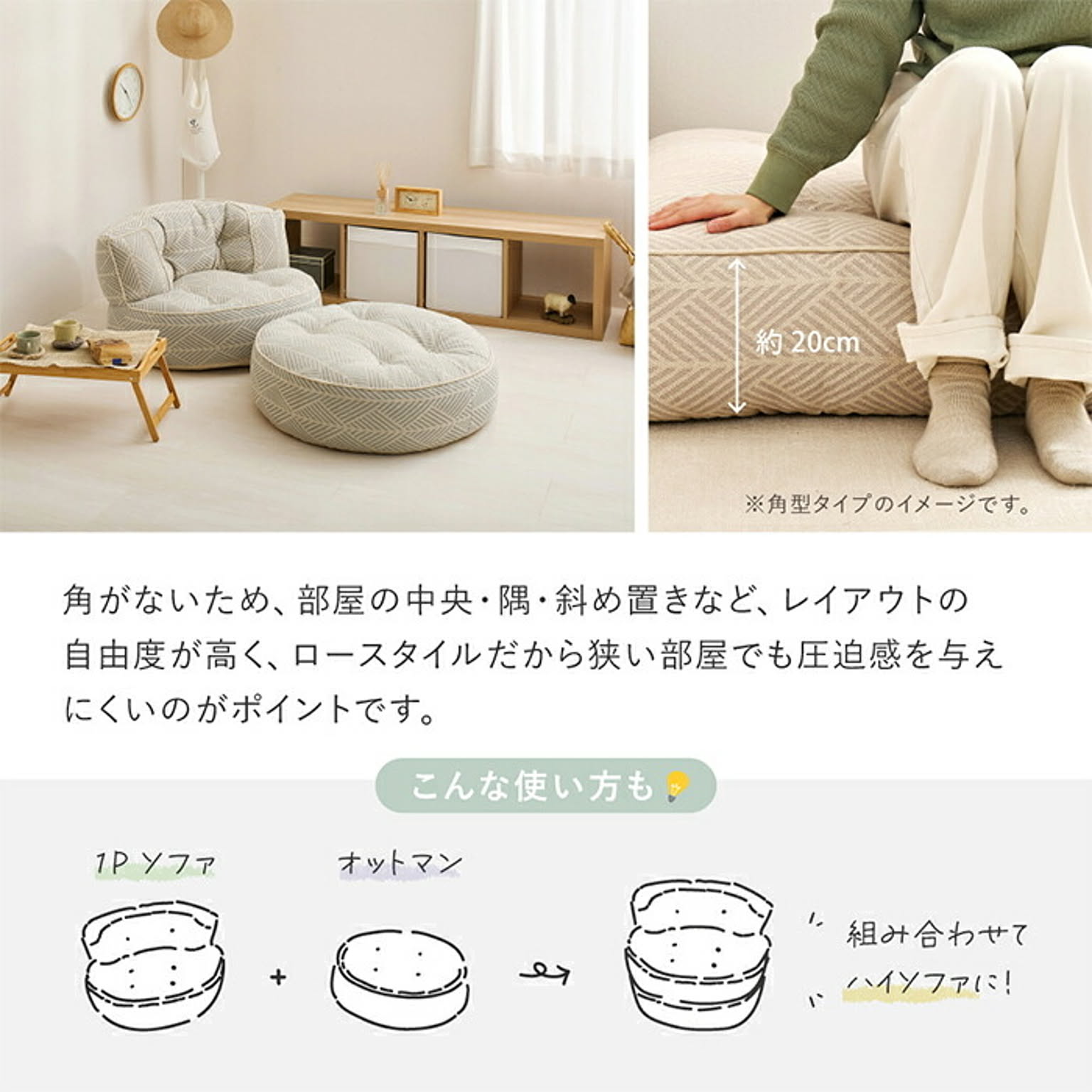 インド綿100%のやさしい風合いのフロアソファ『レトア』。空間を広くみせるロースタイルに、やわらかい雰囲気でくつろぎ感を演出します。円形ソファの丸みのある特徴的なフォルムは、自然と目を引くアクセントになり、シンプルなお部屋でも一気に洗練された印象に。背もたれ部の背面には、リモコンなどの収納にも便利なポケット付き。