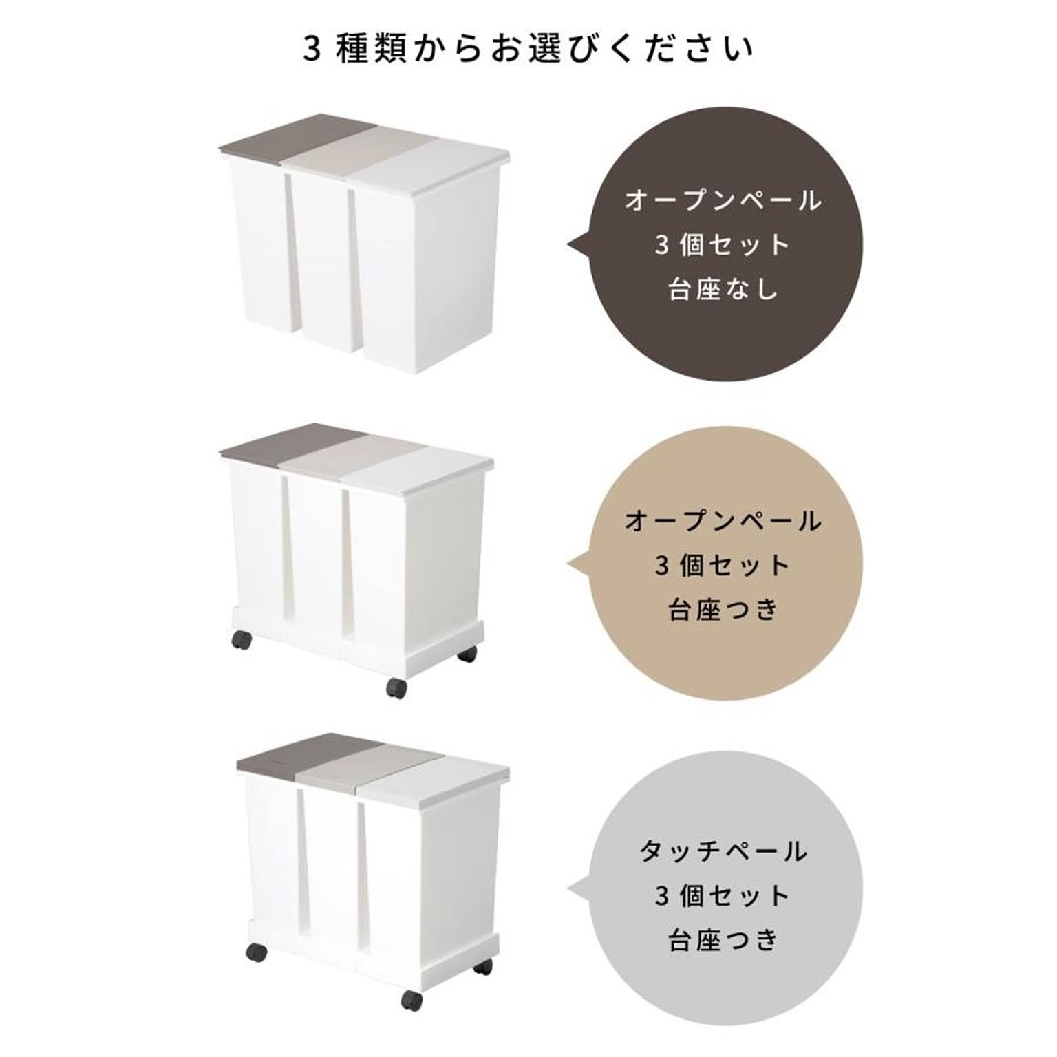 オープンペール(台座なし) オープンペール(台座付き) タッチペール(台座付き) 【検索キーワード】 ゴミ箱 スリム 20リットル 20L 蓋つき 分別 スリム キャスター付き 3個セット ダストボックス キッチン リビング フタ付き シンプル 縦型 ホワイト