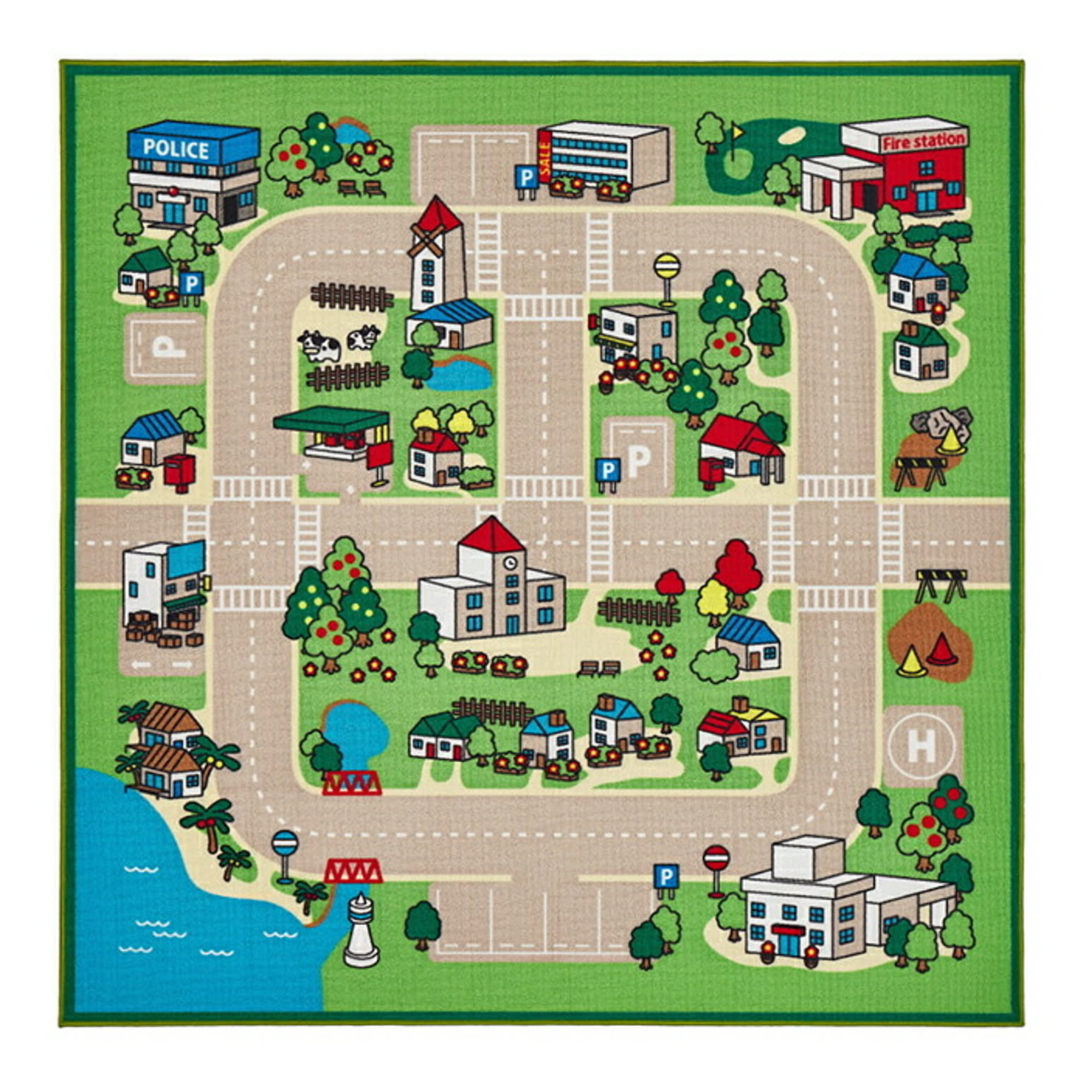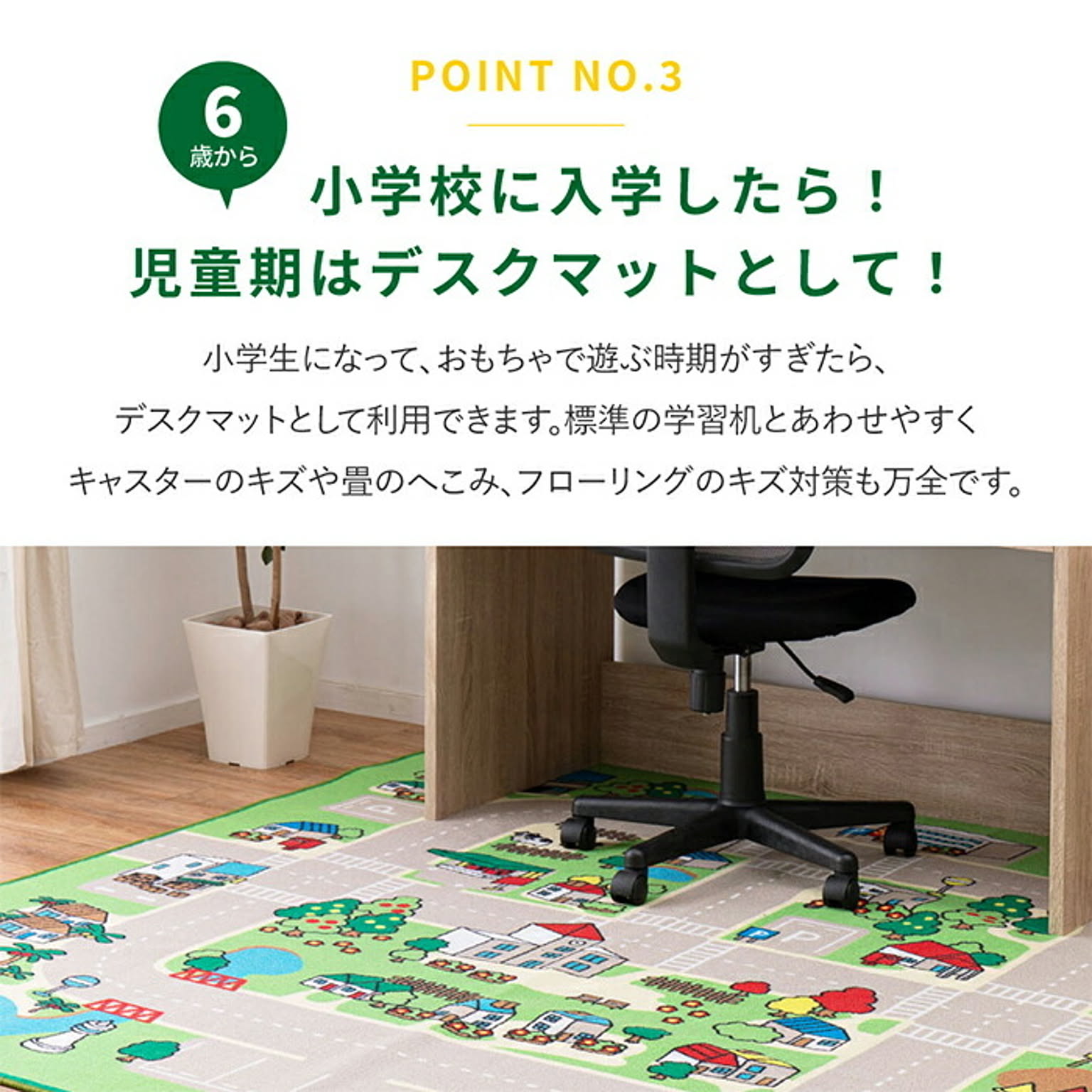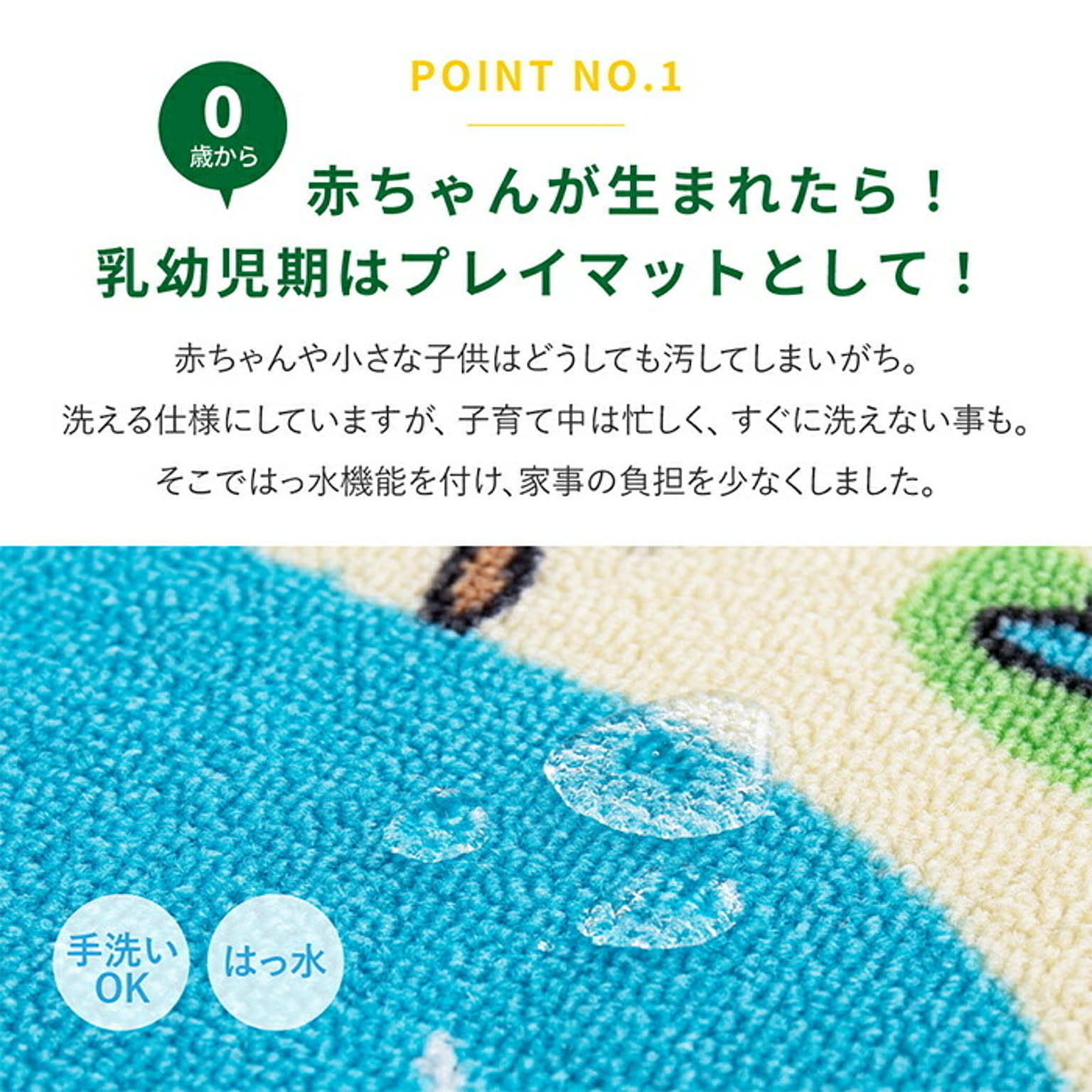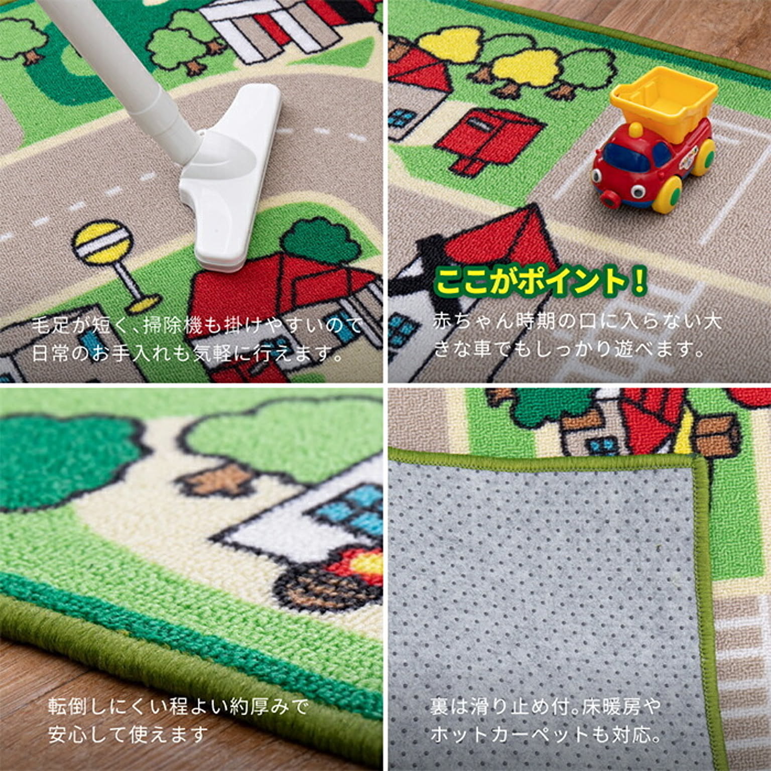 赤ちゃん期はプレイマット、幼児期はキッズコーナーマット・キッズラグ、小学生児童期は学習デスクマットで長く使える道路マップ柄ラグ。ループパイルはサラッとした感触で弾力性と耐久性があり、しっかりとした踏み心地。毛足がカットされていないため、ホコリやゴミが入り込みにくく、掃除がしやすいのもポイント。はっ水加工を施しているため飲みこぼしなどもサッと拭き取れシミになりにくく、汚れても手洗いOK。裏面は滑りにくい加工付き。
