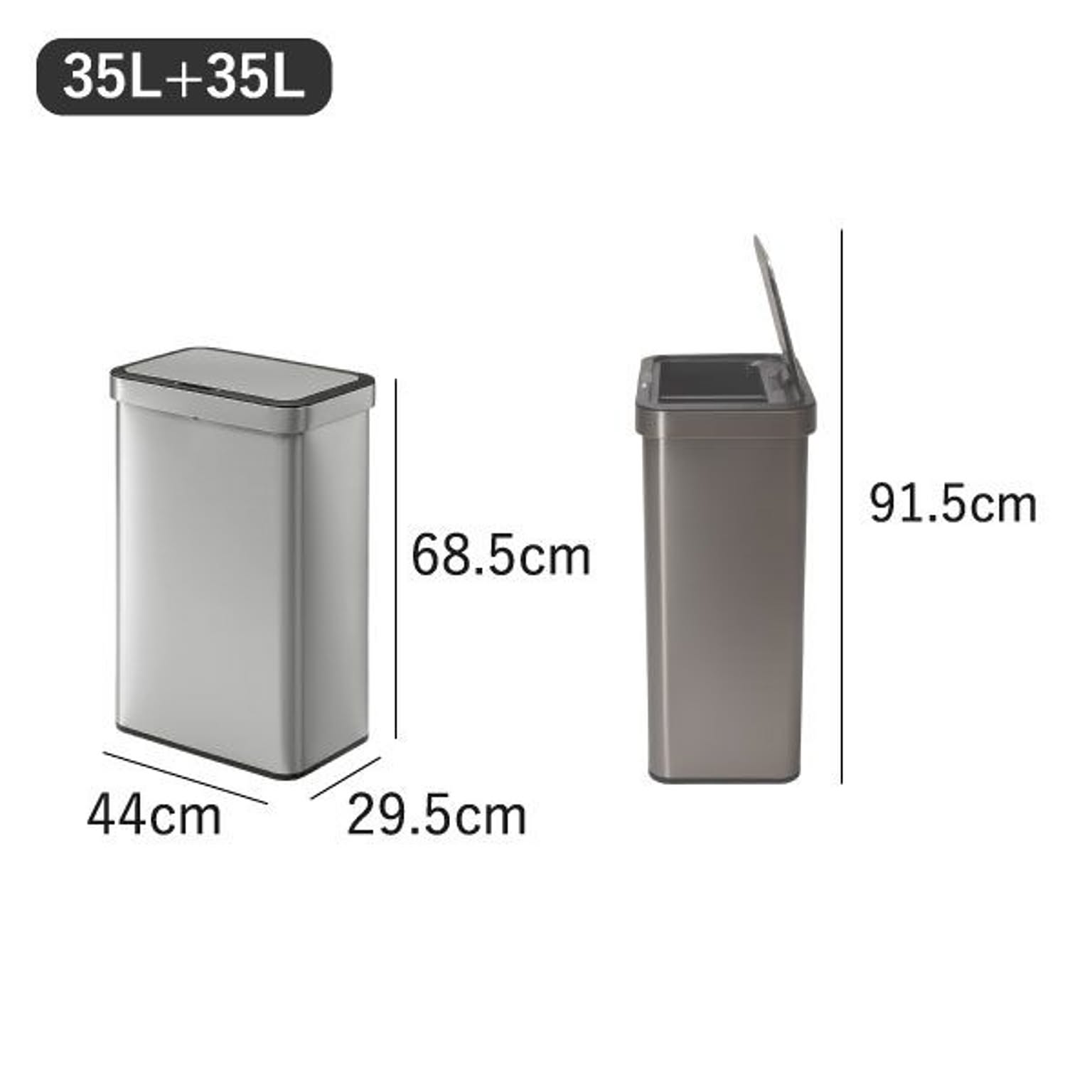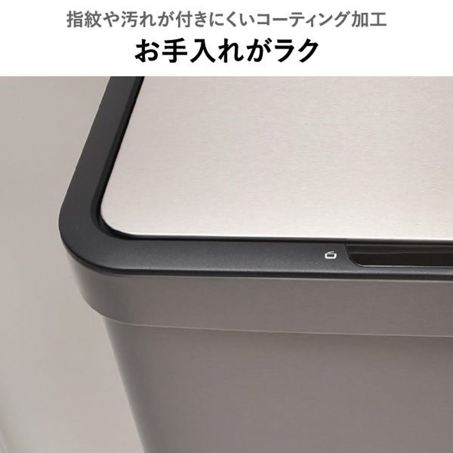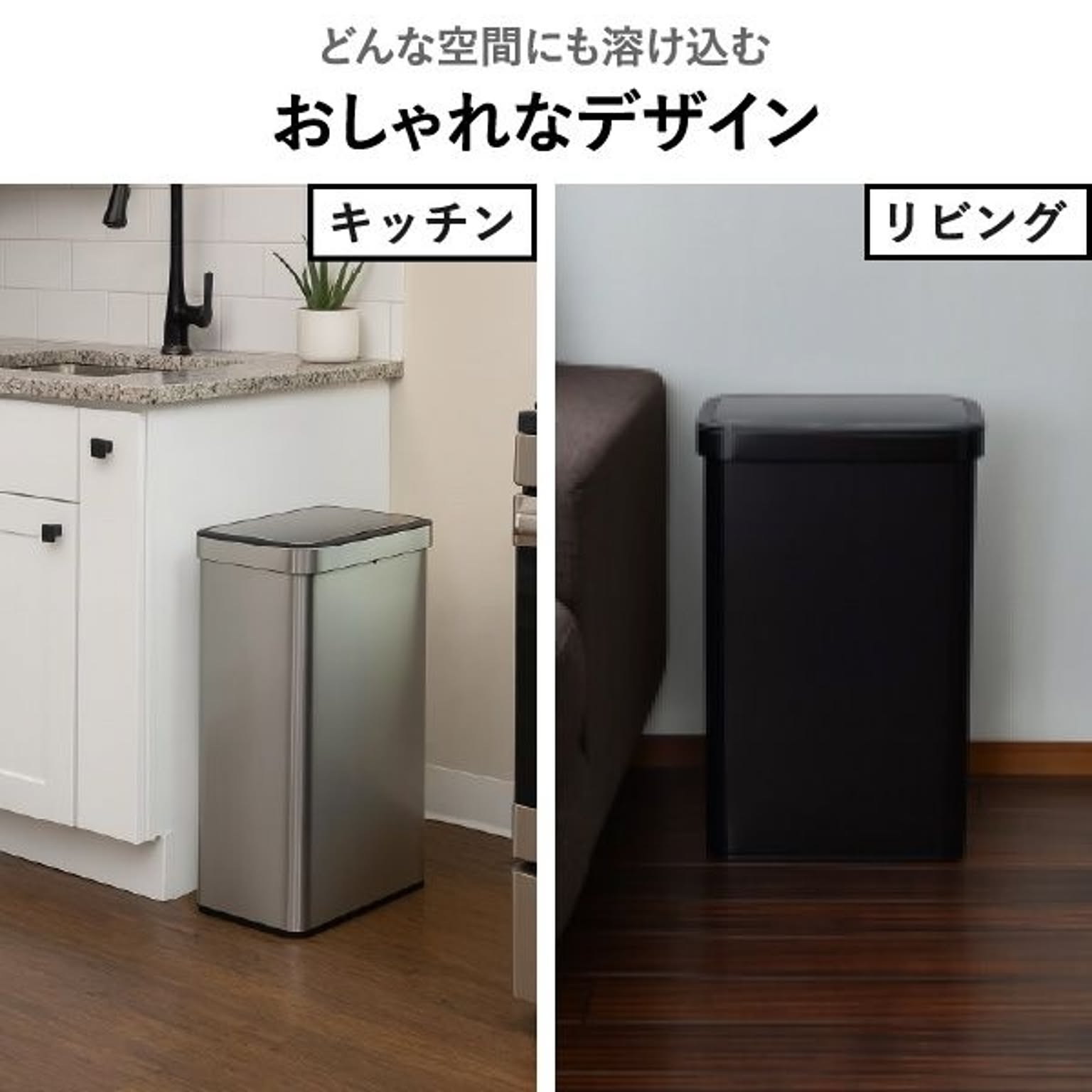 毎日の「使いやすさ」を追求した、自動開閉ゴミ箱。センサー式の自動開閉が手元の動きを正確に感知し、手をかざすだけでフタが自動で開閉。料理中や手が汚れているときでも、ゴミ箱に触れる必要がなく、衛生的にご使用いただけます。この自動開閉ゴミ箱は、パワフルなモーターと静音設計により、静かにフタが閉まるソフトクローズ機能を搭載。一般的な45Lのゴミ箱に比べて見た目が圧倒的にスタイリッシュで、キッチン・リビングどちらに置いても空間の雰囲気を損ないません。この自動開閉ゴミ箱は、指紋が付きにくい特殊コーティングを施しており、ステンレスのボディは輝きが続く美しさ。表面に特殊なコーティングが施されているので、汚れが付きにくく、もし汚れてしまっても布きんなどでサッと拭きとれます。大口径の開口部はゴミを捨てやすく、自動開閉ゴミ箱の利便性を最大限に引き出しています。毎日必ず使うものだからこそ、美しく、静かで、衛生的なゴミ箱を。この自動開閉ゴミ箱は、あなたの暮らしをワンランク快適にしてくれます。