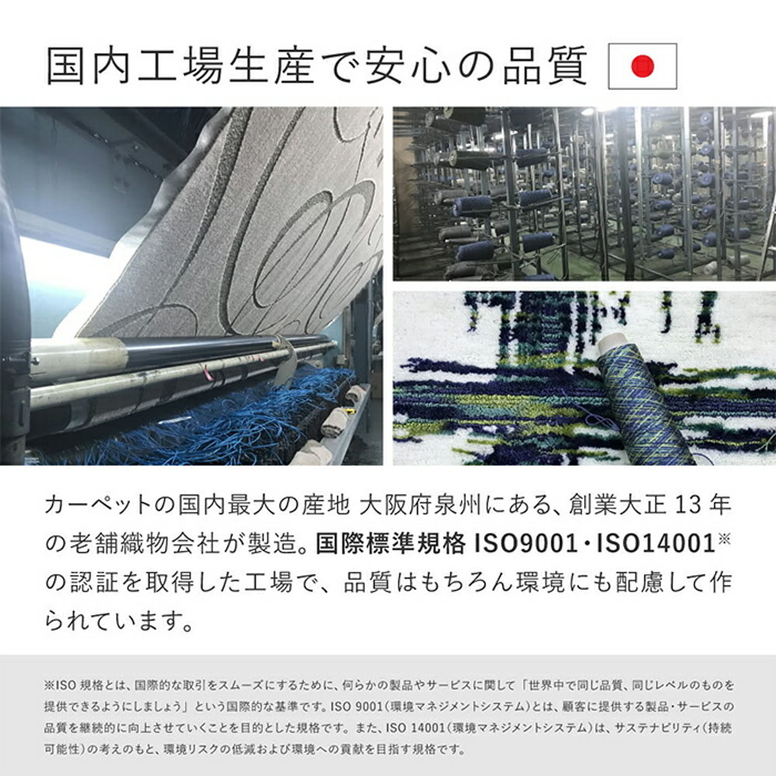 防ダニ・抗菌・抗ウイルス・消臭・花粉対策など、優れた機能を兼ね備えた安心の日本製多機能ラグ。落ち着いた色合いでインテリアにも合わせやすい、おしゃれなモダンデザイン。ふわふわなカットパイルと、さらっとした肌触りのループパイル、異なるパイルを組み合わせることでデザインに立体感が出せ、部分ごとに違うタッチ感が楽しめます。毛足が短くお手入れしやすのもうれしいポイント。裏面は不織布貼りで床を傷つけにくく、ホットカーペット・床暖房対応で、オールシーズンお使いいただけます。