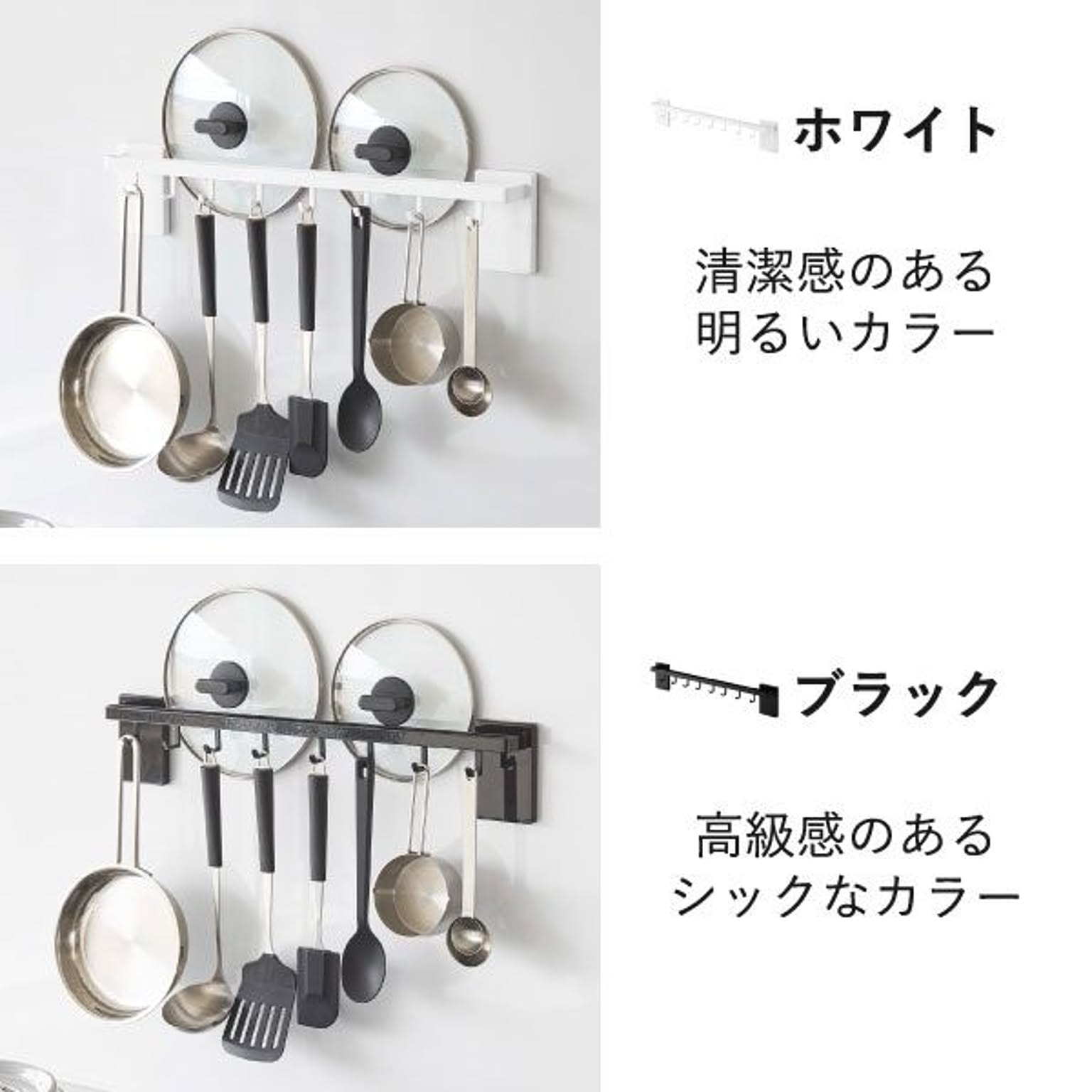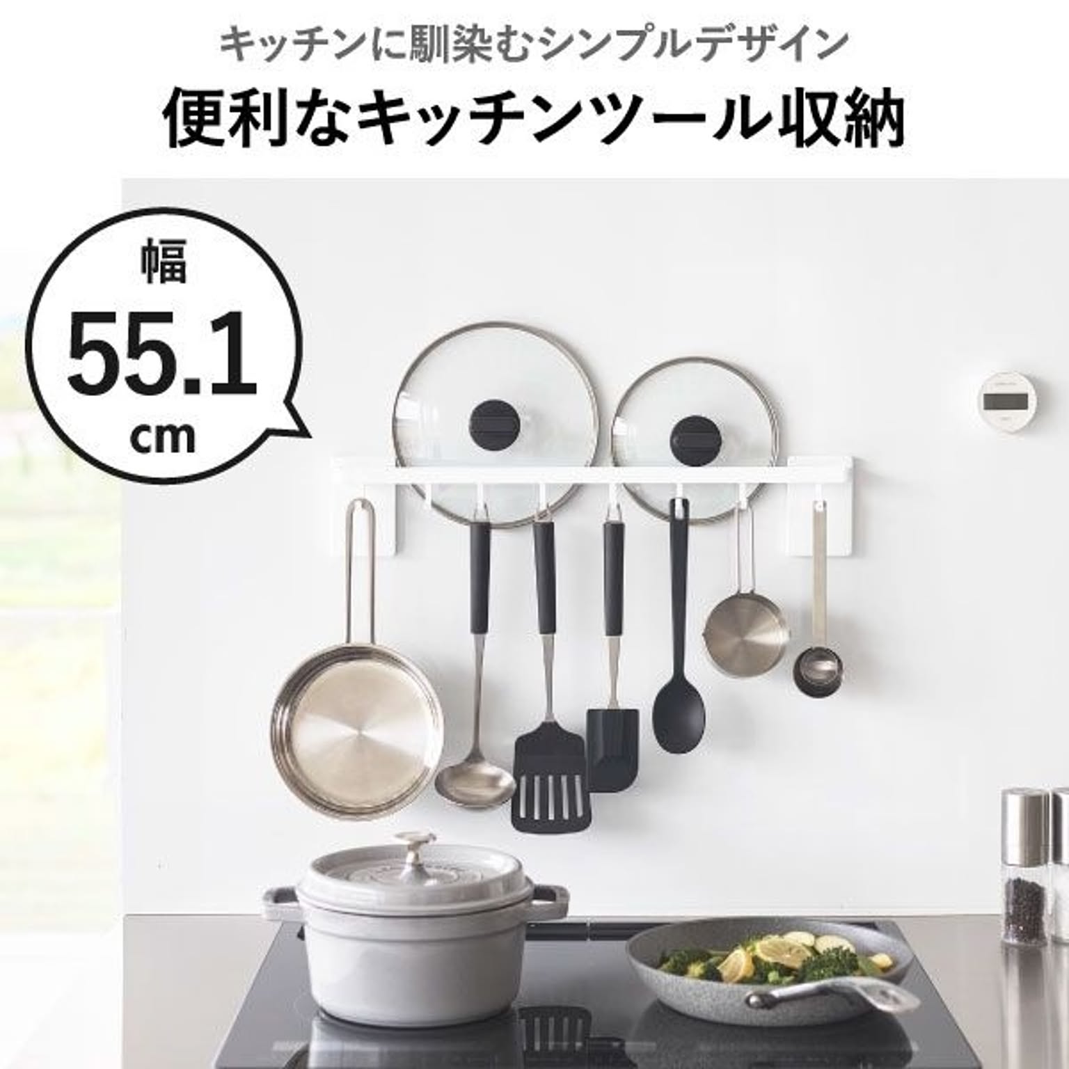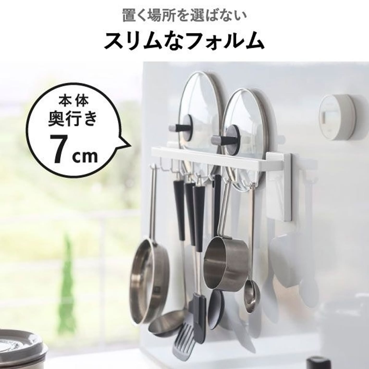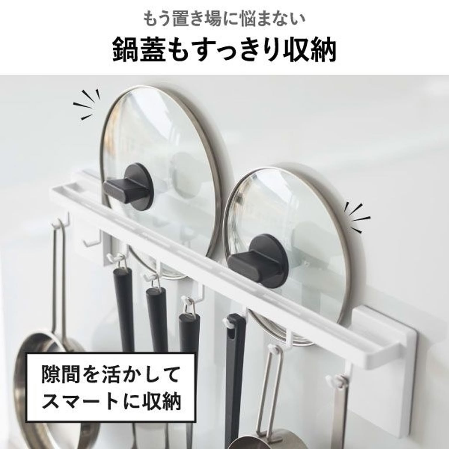よく使うキッチンツールを吊り下げて収納できる、便利でおしゃれな鍋ふた収納です。 シンプルおしゃれな鍋ふたスタンドだから、様々なキッチンに馴染んでくれます。 光沢のある壁面にぴたっと貼って使える、フィルムフックタイプの鍋ふたスタンド。 8連タイプの鍋ふた収納フックなので、お玉やフライ返し、調理スプーンやゴムベラなど、 よく使う調理器具を一か所にまとめて収納できて便利です。 キッチンツールフックは1つ1つ動かせる可動式で、収納したい物のサイズに合わせて、 気軽にフックの位置を変更することができます。 鍋ふたスタンドと設置面とのスペースを活かして、置き場に困る鍋蓋をすっきり収納。 鍋ふた収納にはミゾがあり、スマホスタンドとしても使うことが可能。 料理中にスマホでレシピを見たり、料理動画を見たりする際に便利な鍋ふた収納です。 鍋ふたスタンドはとてもスリムな奥行きなので、圧迫感を与えずコンパクトに収納できます。 鍋ふたスタンド本体は、丈夫なスチール製で長くお使いいただけます。 表面にはユニクロメッキ+粉体塗装が施されていて、水や汚れに強いのも特徴です。 鍋ふたスタンドの色は、ホワイトとブラックの2色からお選びいただけます。 towerシリーズのおしゃれな鍋ふた収納を使って、より快適なキッチンに。